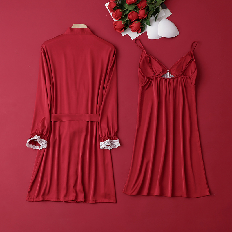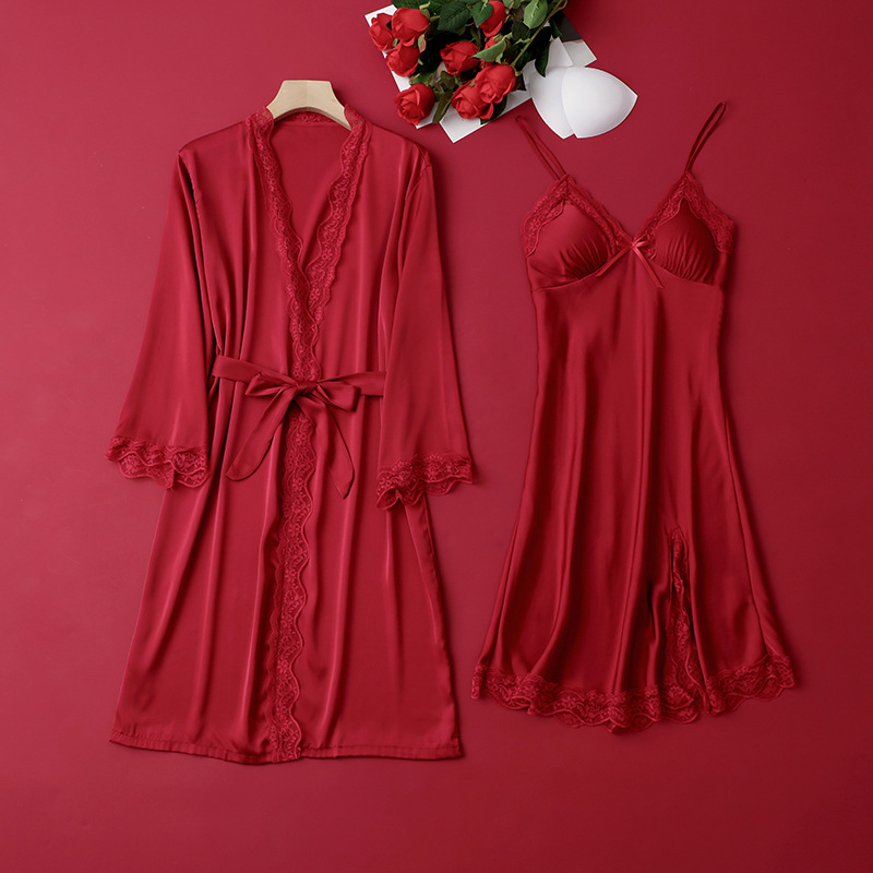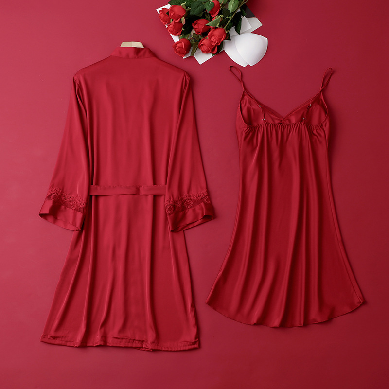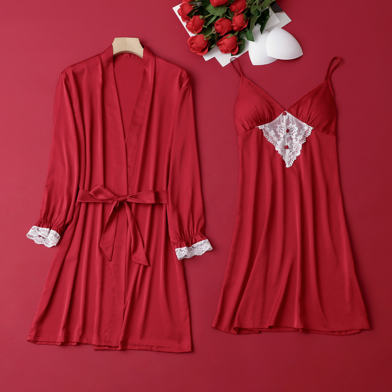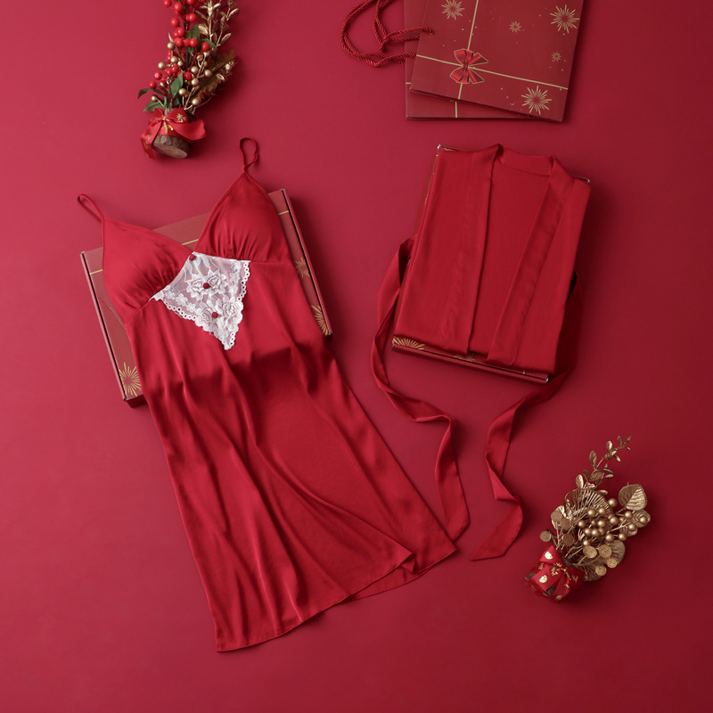 [선물 상자] 아침 가운 여성의 투피스 봄과 가을 여름 결혼식 붉은 신부 섹시한 결혼식 밤 잠옷 아이스 실크스토어 가기