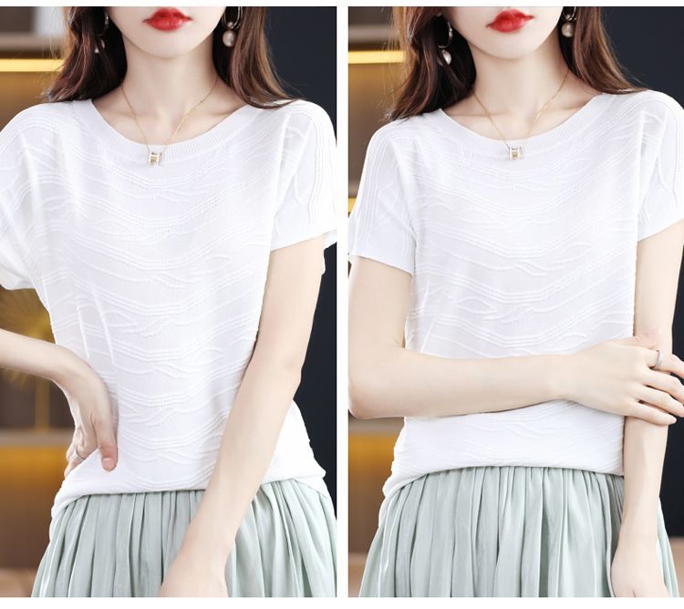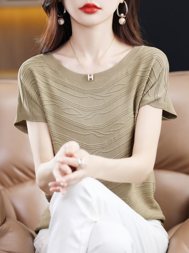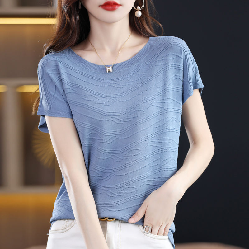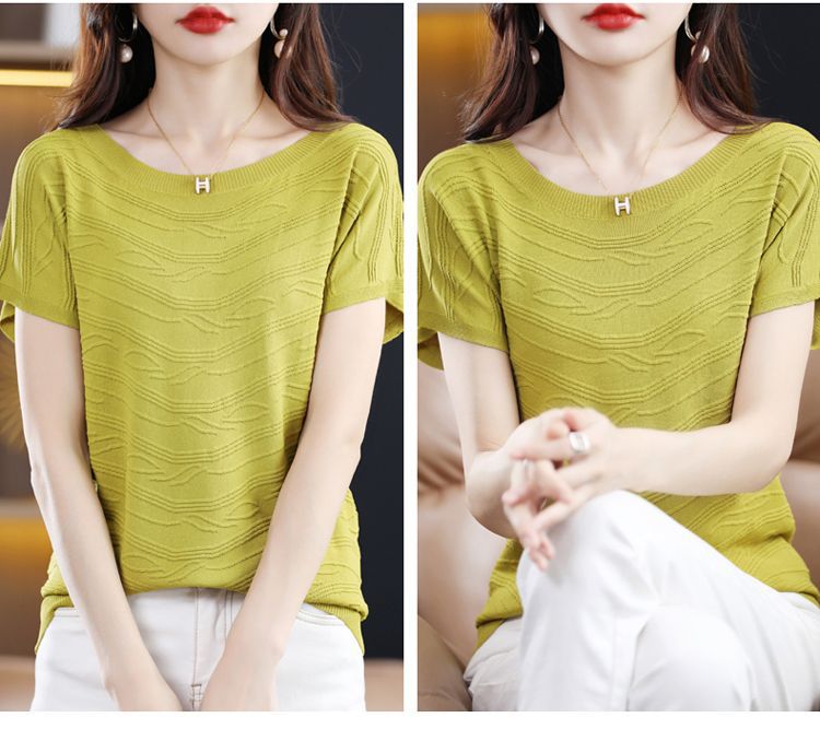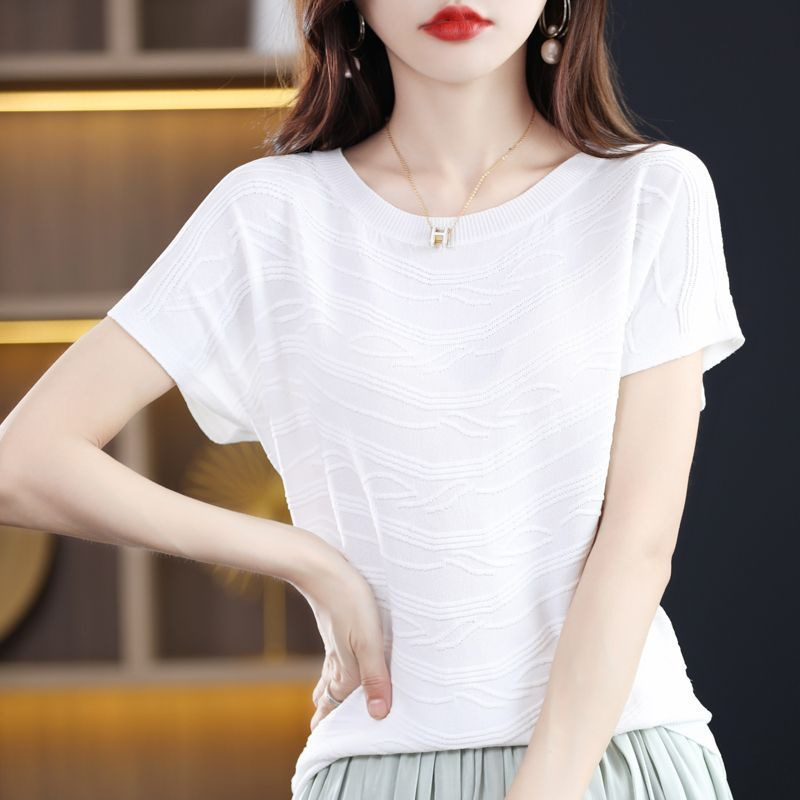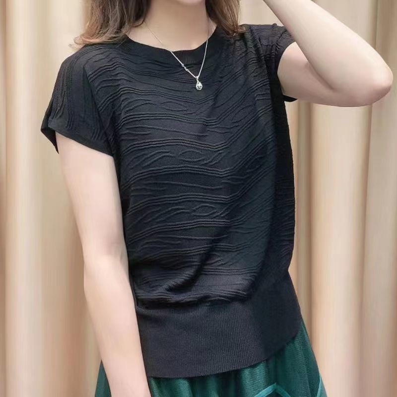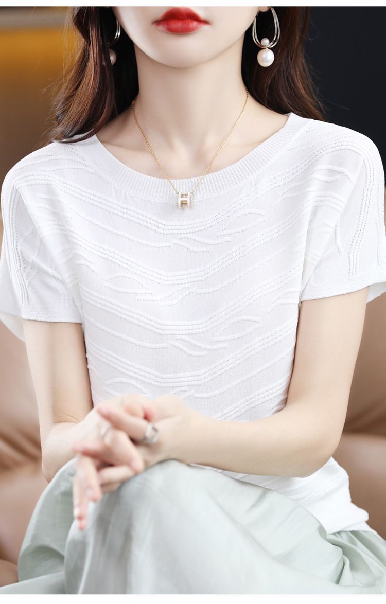 2024 년 여름 새로운 유행 느슨한 아이스 실크 반팔 티셔츠 여자 하이 엔드 크루 넥 올 매치 자카드 니트 탑