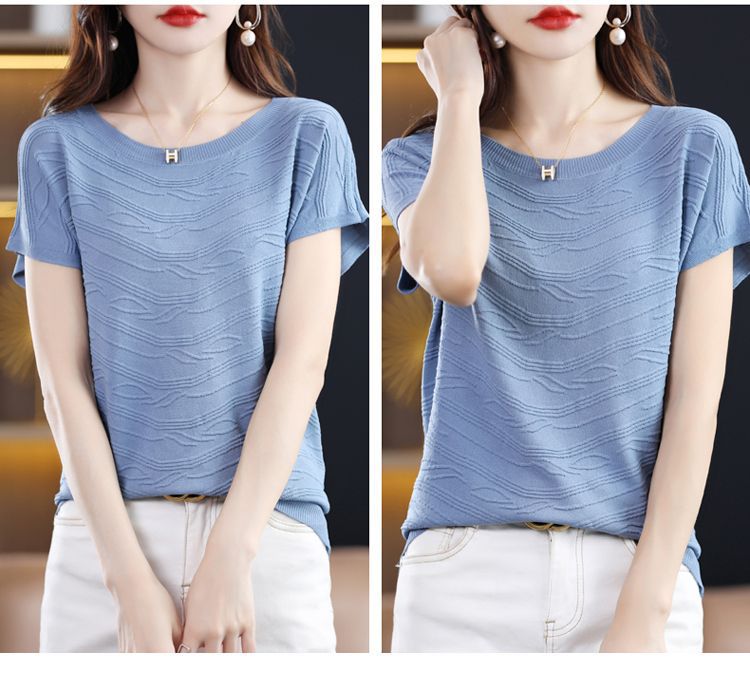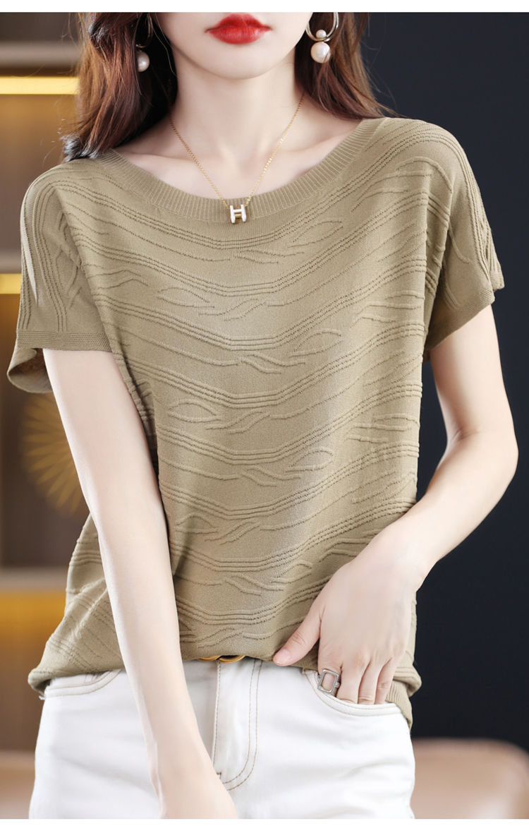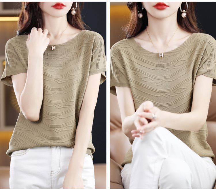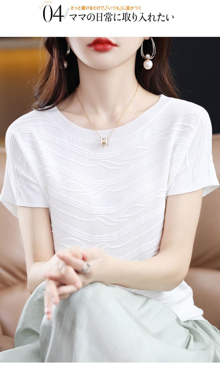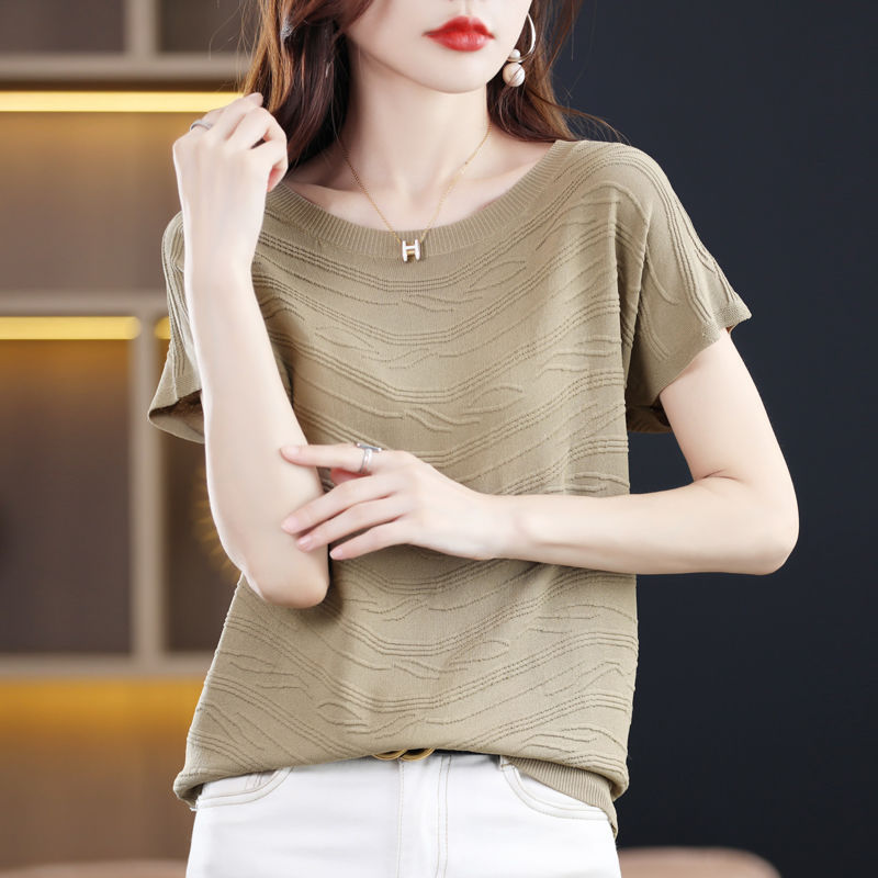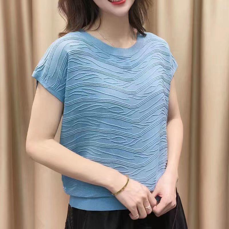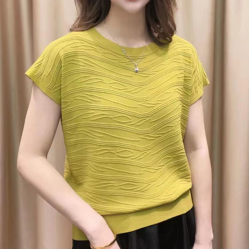 2024 년 여름 새로운 유행 느슨한 아이스 실크 반팔 티셔츠 여자 하이 엔드 크루 넥 올 매치 자카드 니트 탑