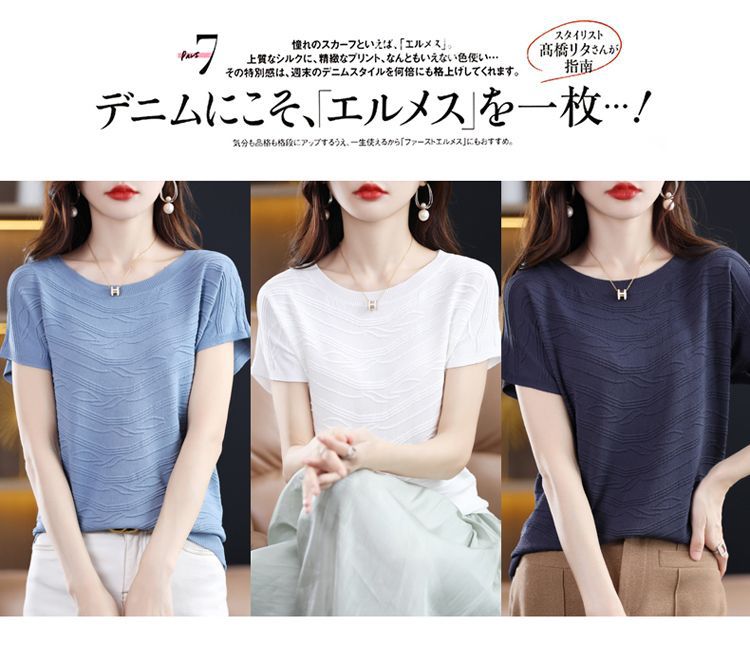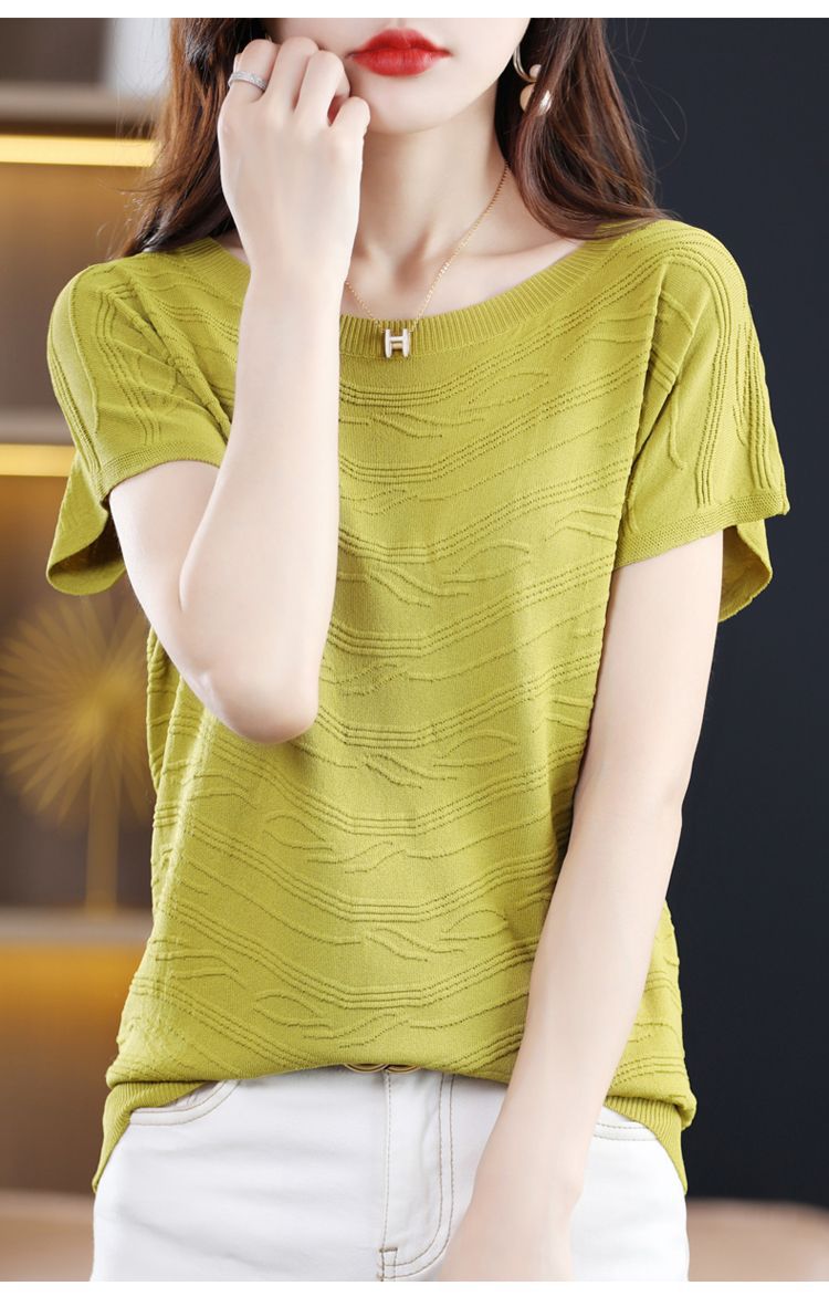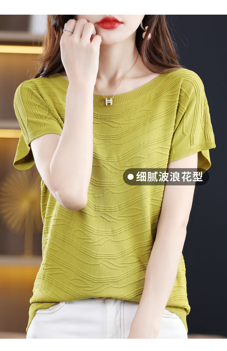 2024 년 여름 새로운 유행 느슨한 아이스 실크 반팔 티셔츠 여자 하이 엔드 크루 넥 올 매치 자카드 니트 탑스토어 가기