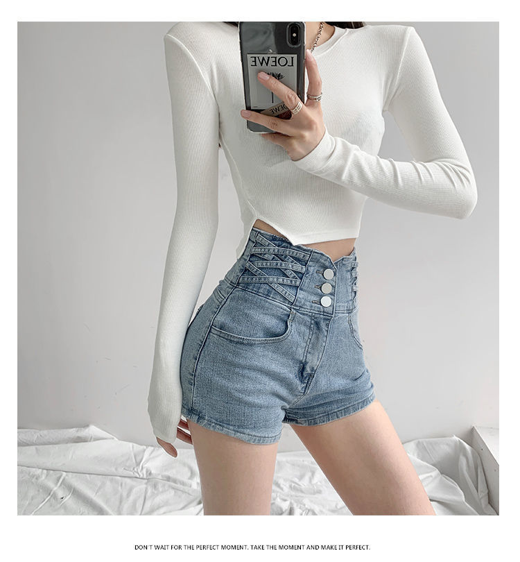유럽과 미국의 뜨거운 소녀 스타일 높은 허리 데님 반바지 여성의 봄과 여름 탄성 디자인 통통녀 플러스 사이즈 검은 색 핫 팬츠 조수.스토어 가기