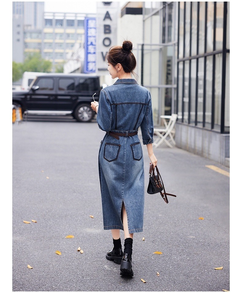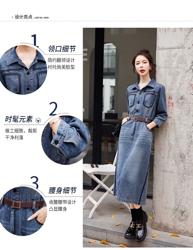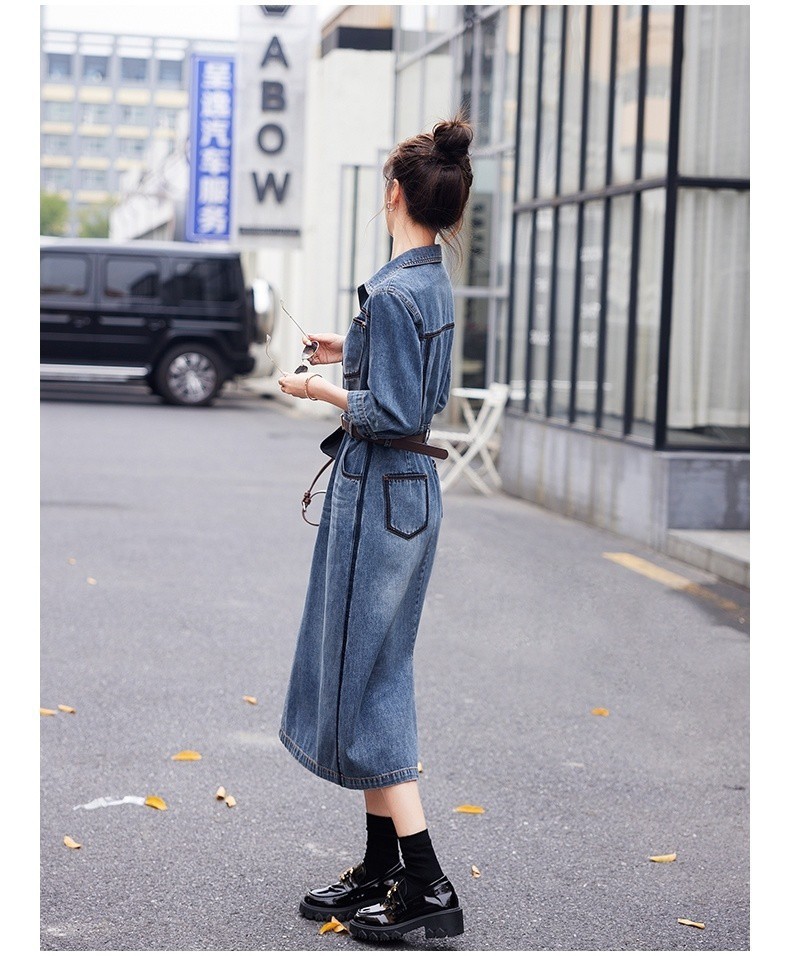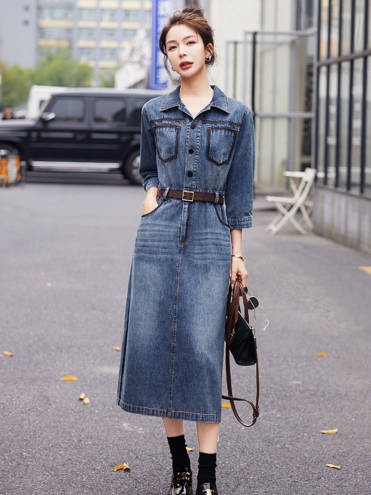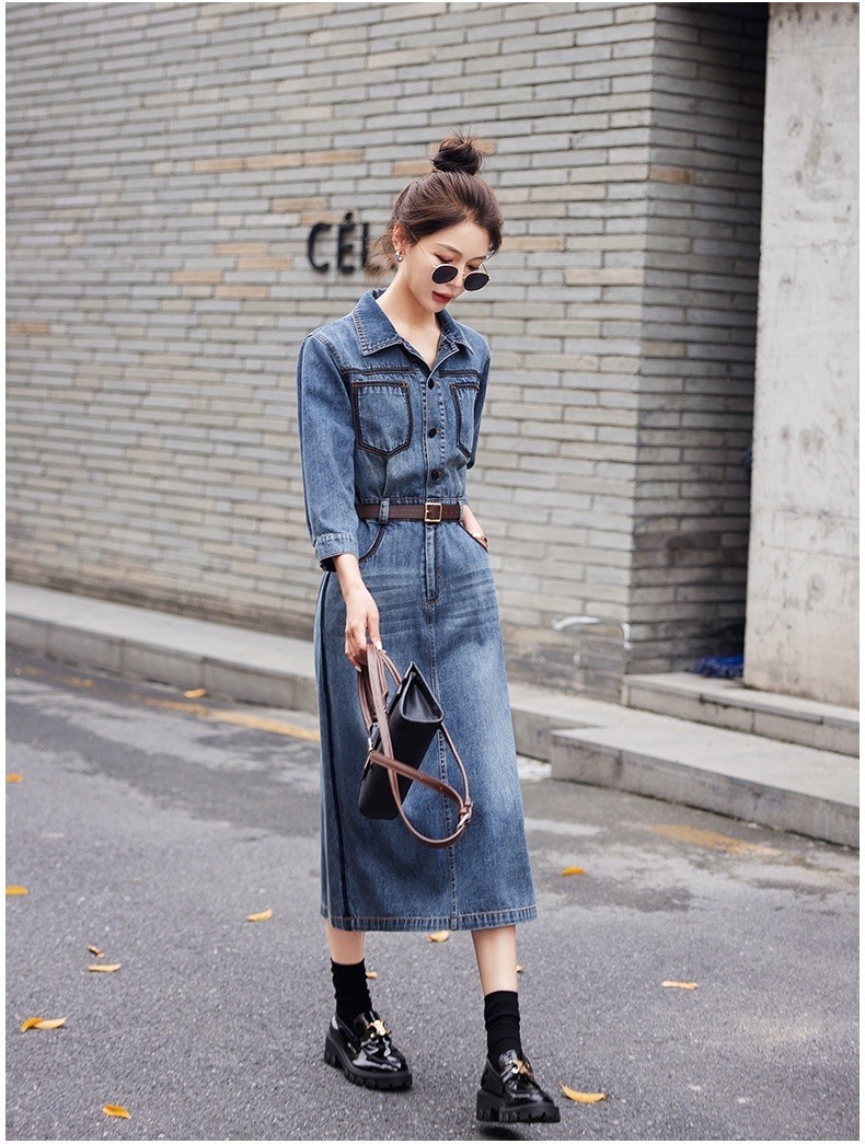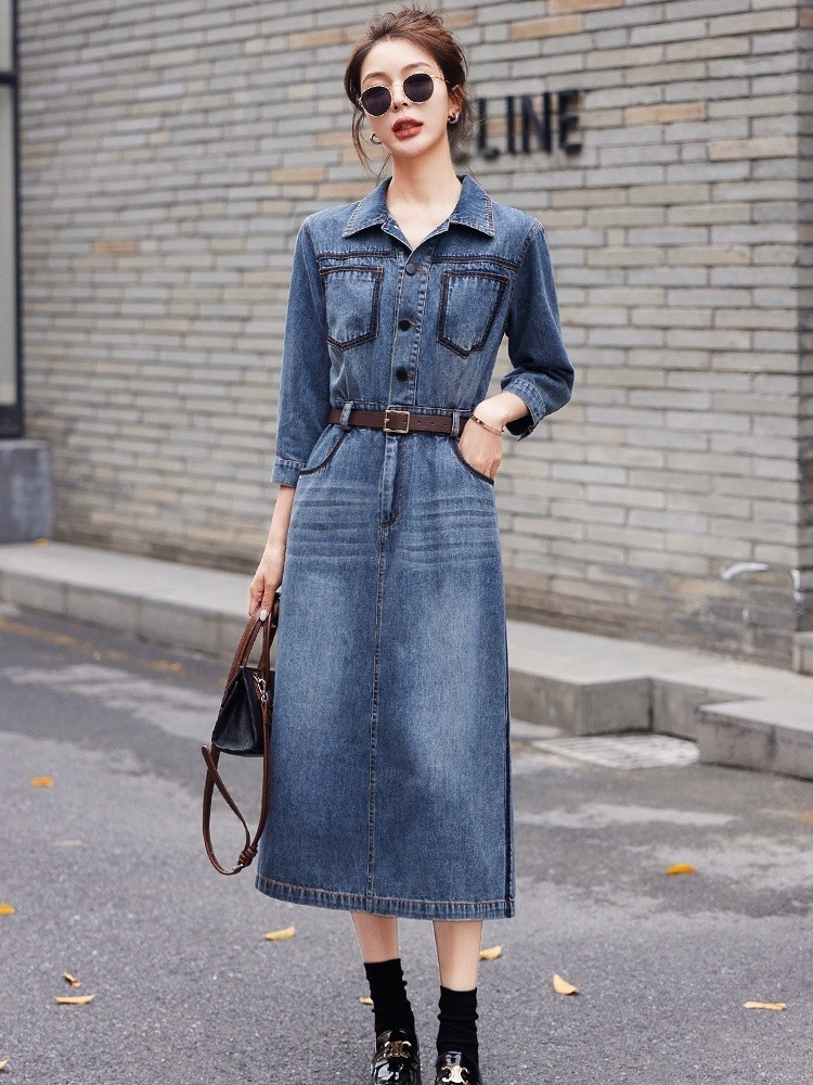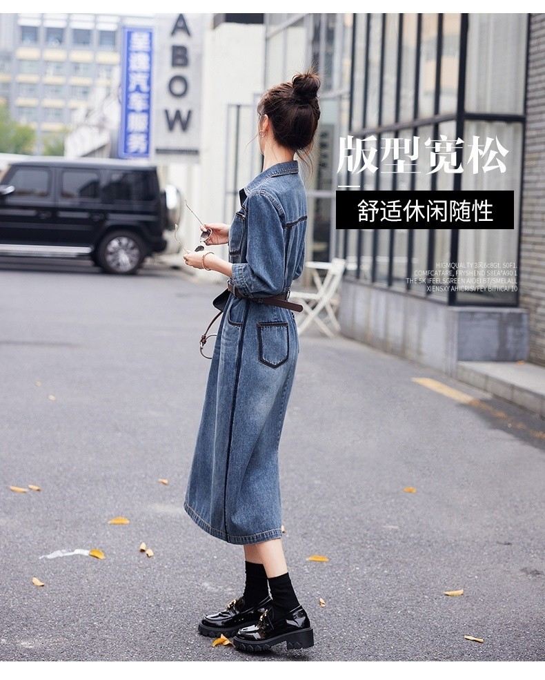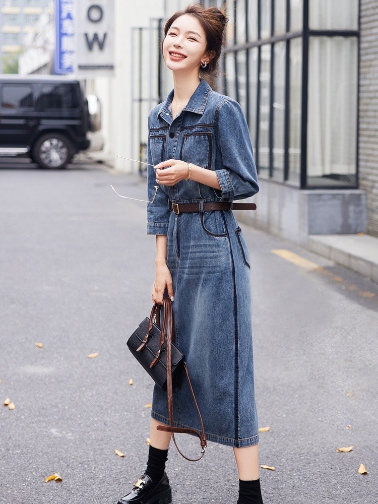 프렌치 레트로 패션 디자인 데님 원피스 여성용 가을 허리 조임 셔츠 원피스 슬림하고 트렌디한 기질의 드레스스토어 가기