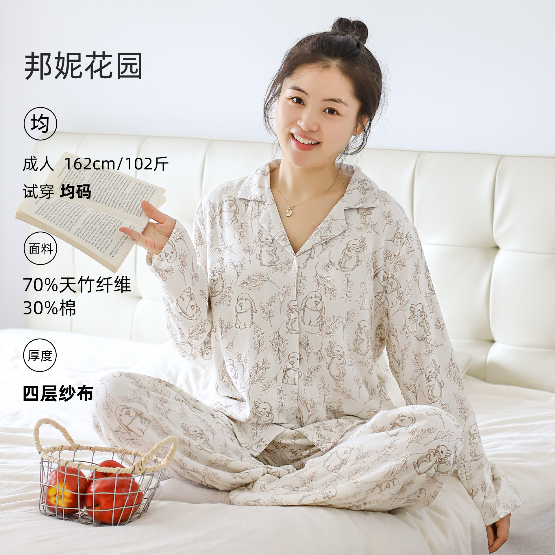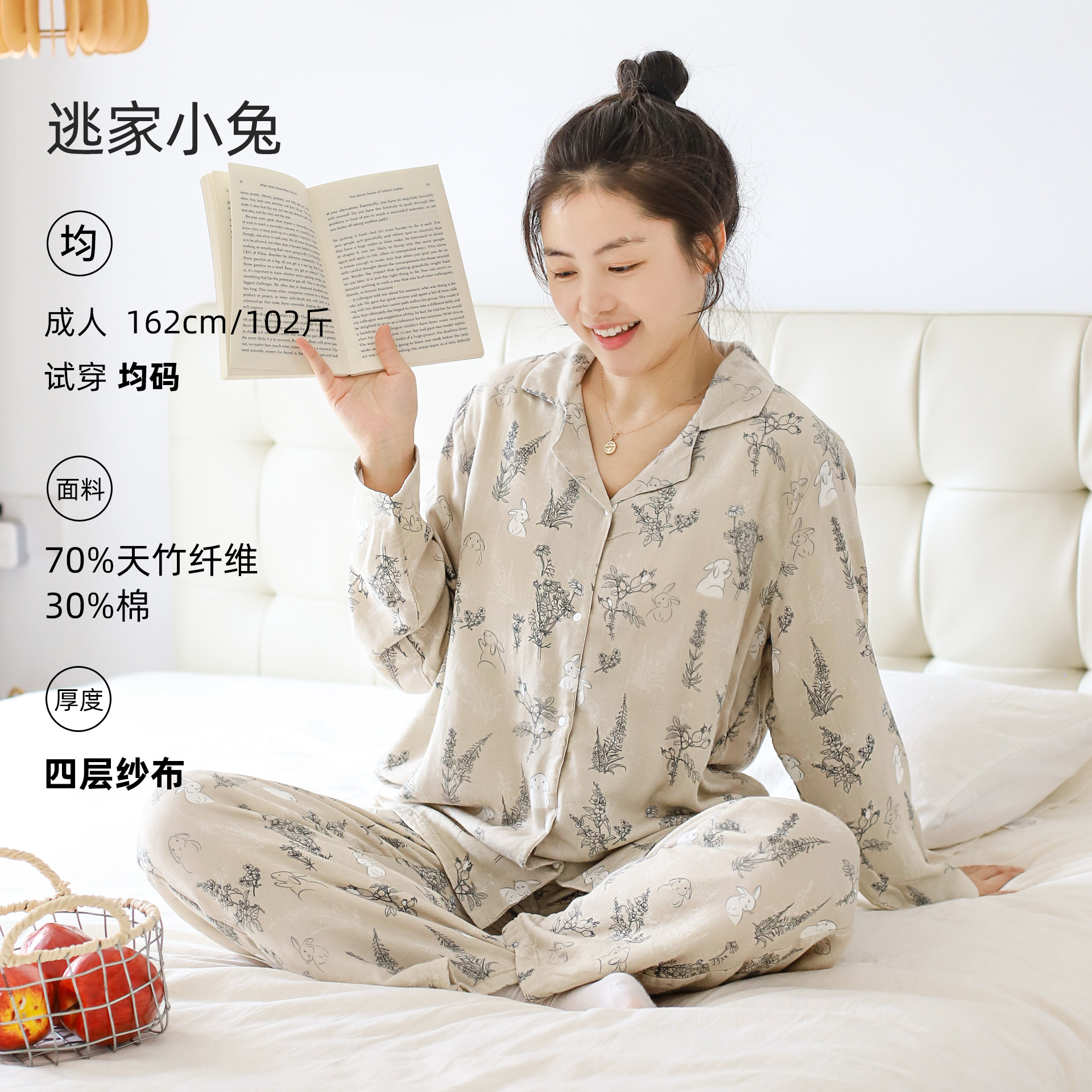 A급 봄가을 여성 긴팔 홈웨어 세트 산후복 사중직물 대나무 면 거즈 잠옷 통기성 좋고 편안함스토어 가기