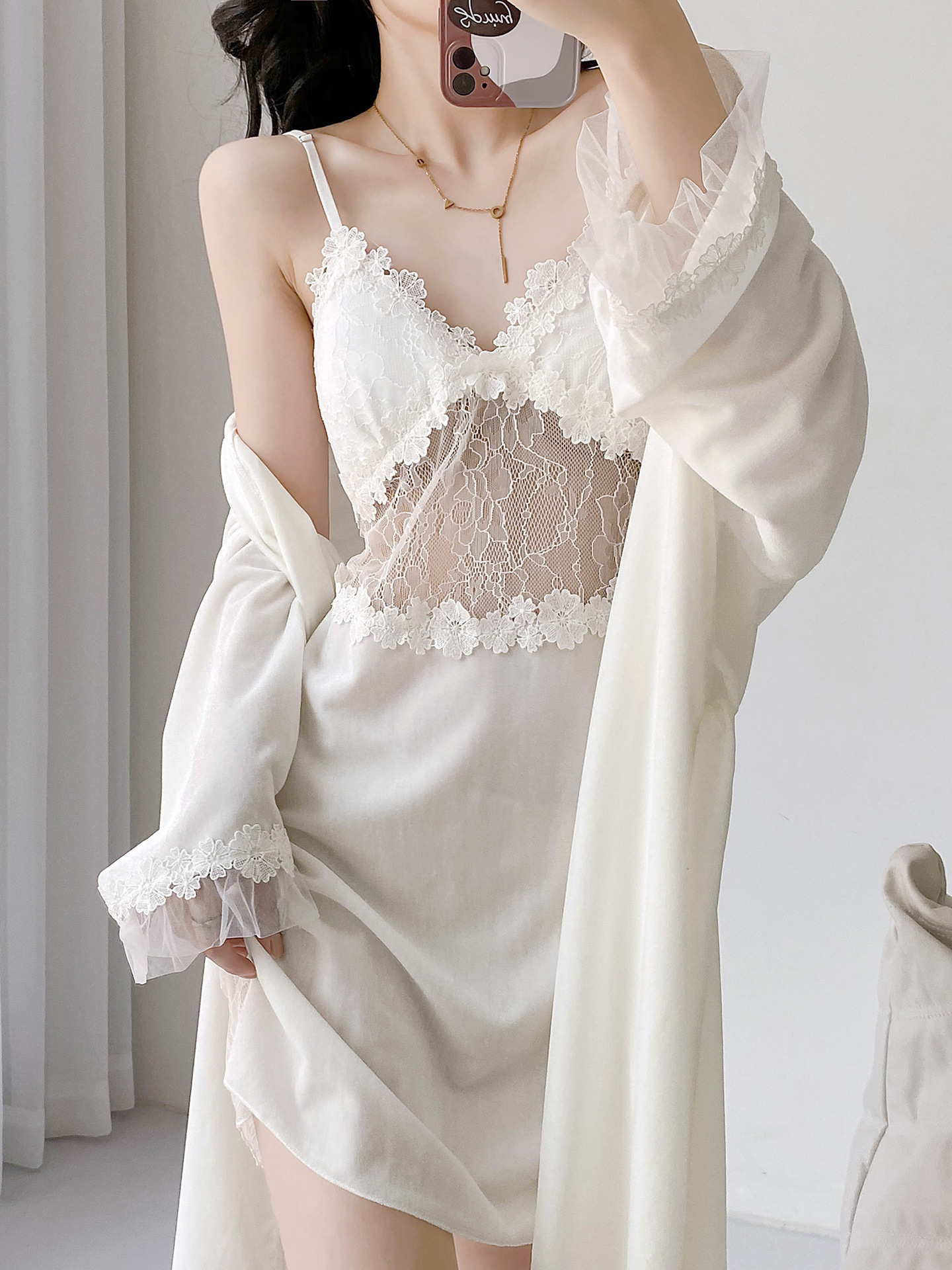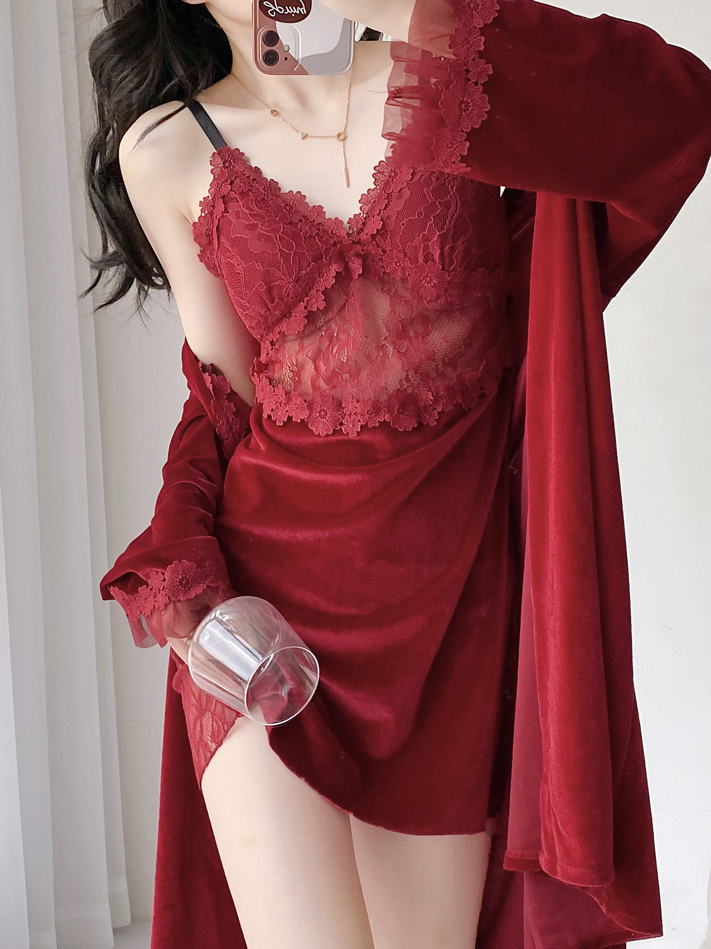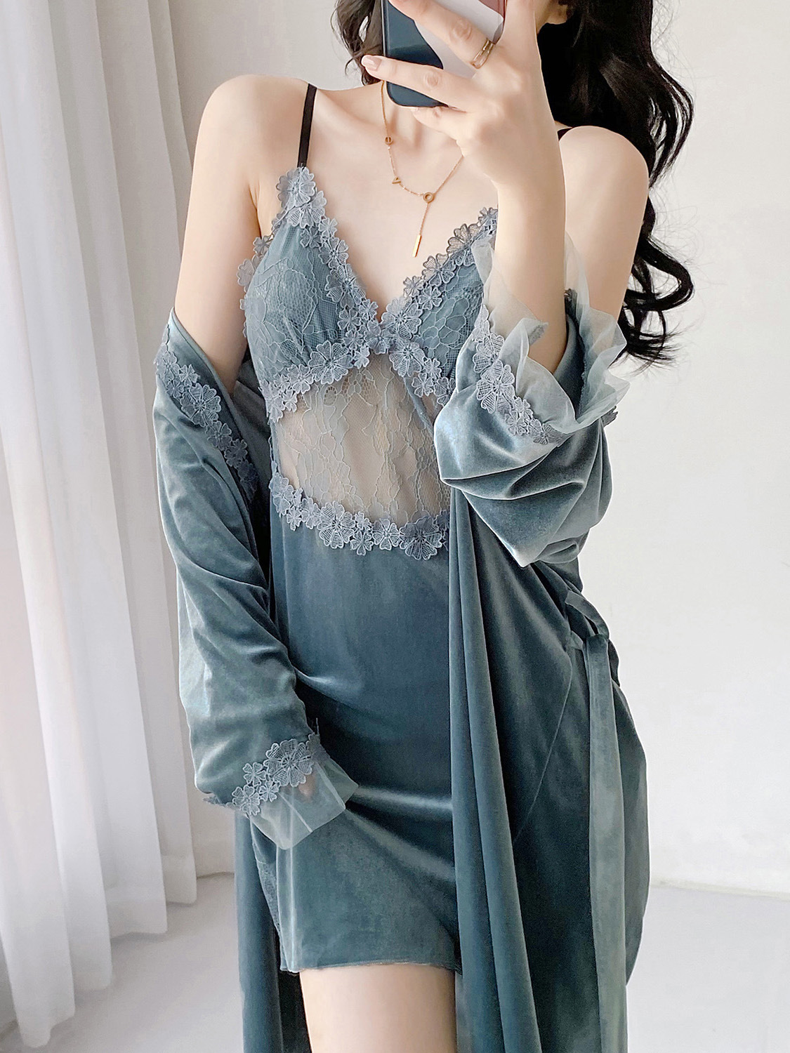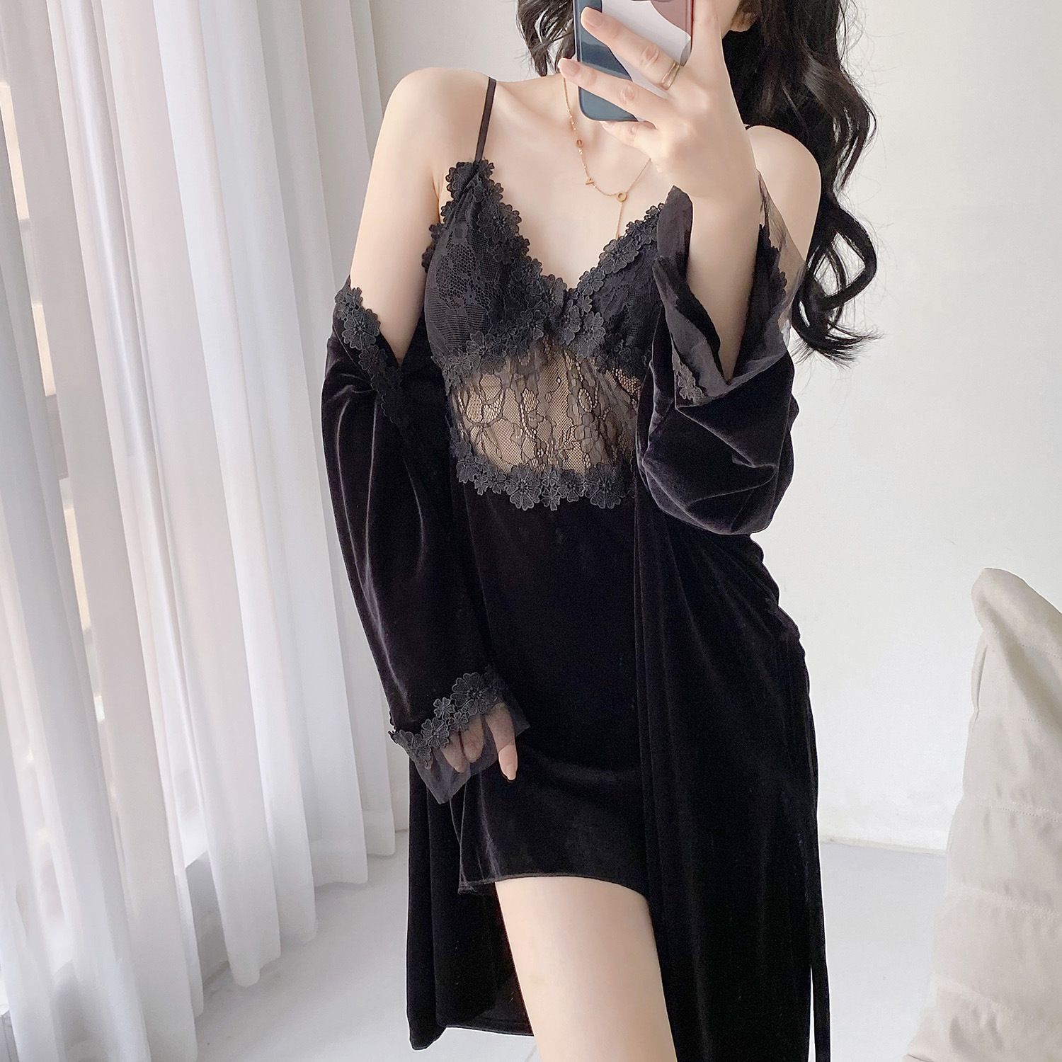 골든 벨벳 파자마 여성 가을 · 겨울 한국식 긴팔 잠옷 세트 겨울 섹시 레이스 슬링 나이트가운 투피스 세트스토어 가기