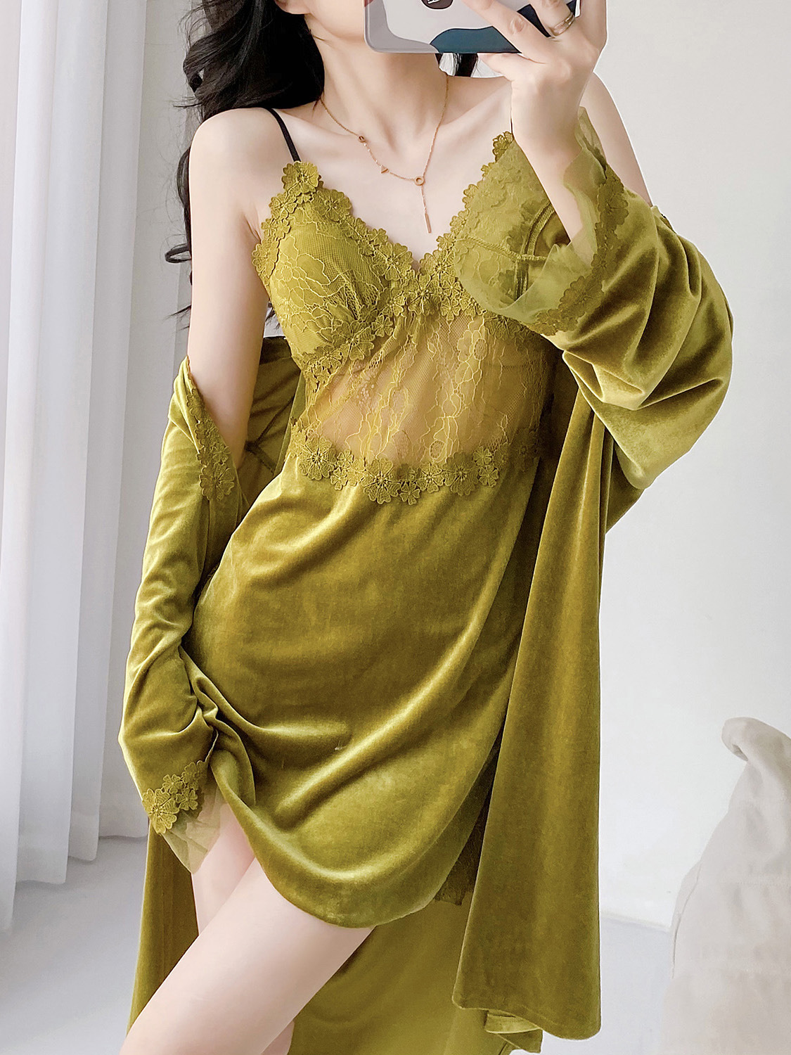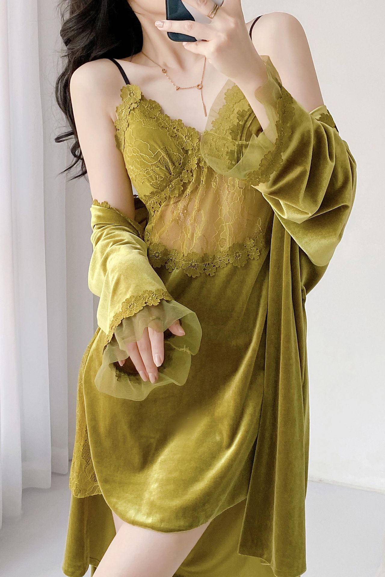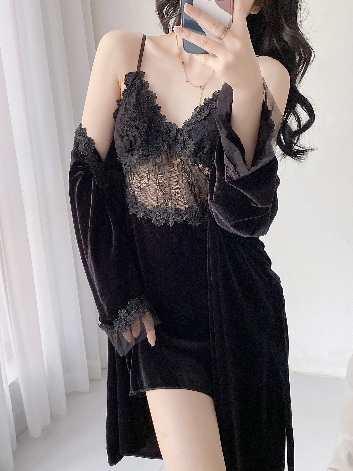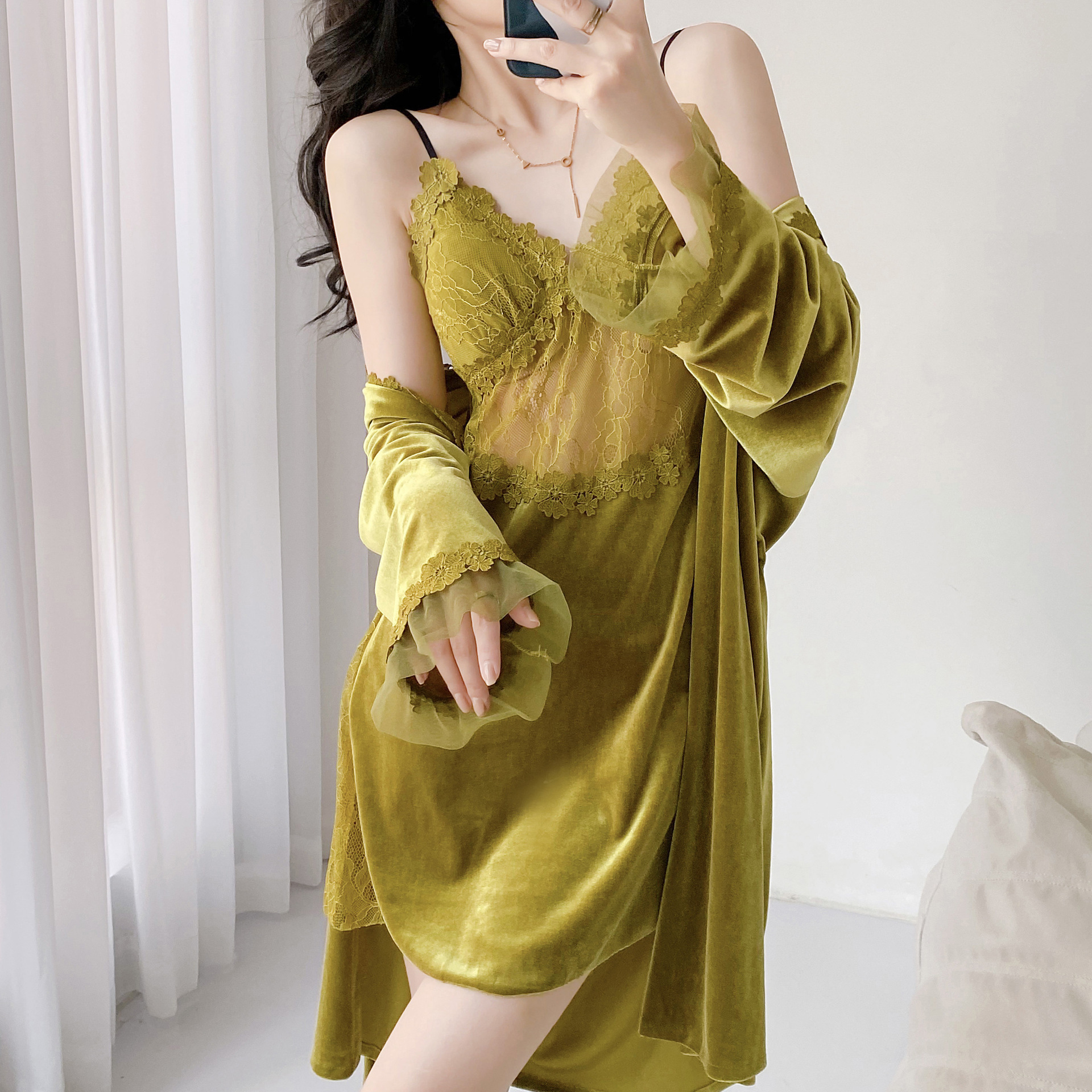 골든 벨벳 파자마 여성 가을 · 겨울 한국식 긴팔 잠옷 세트 겨울 섹시 레이스 슬링 나이트가운 투피스 세트
