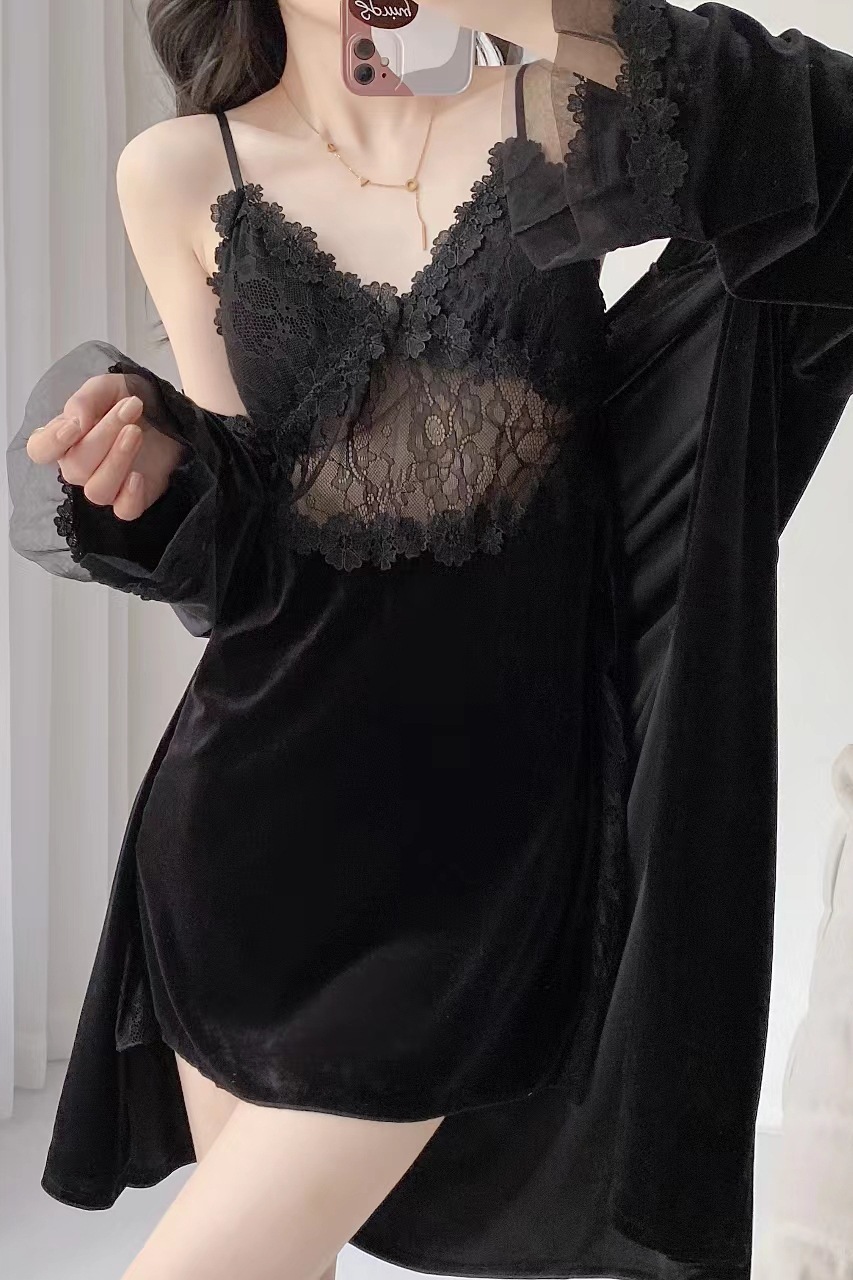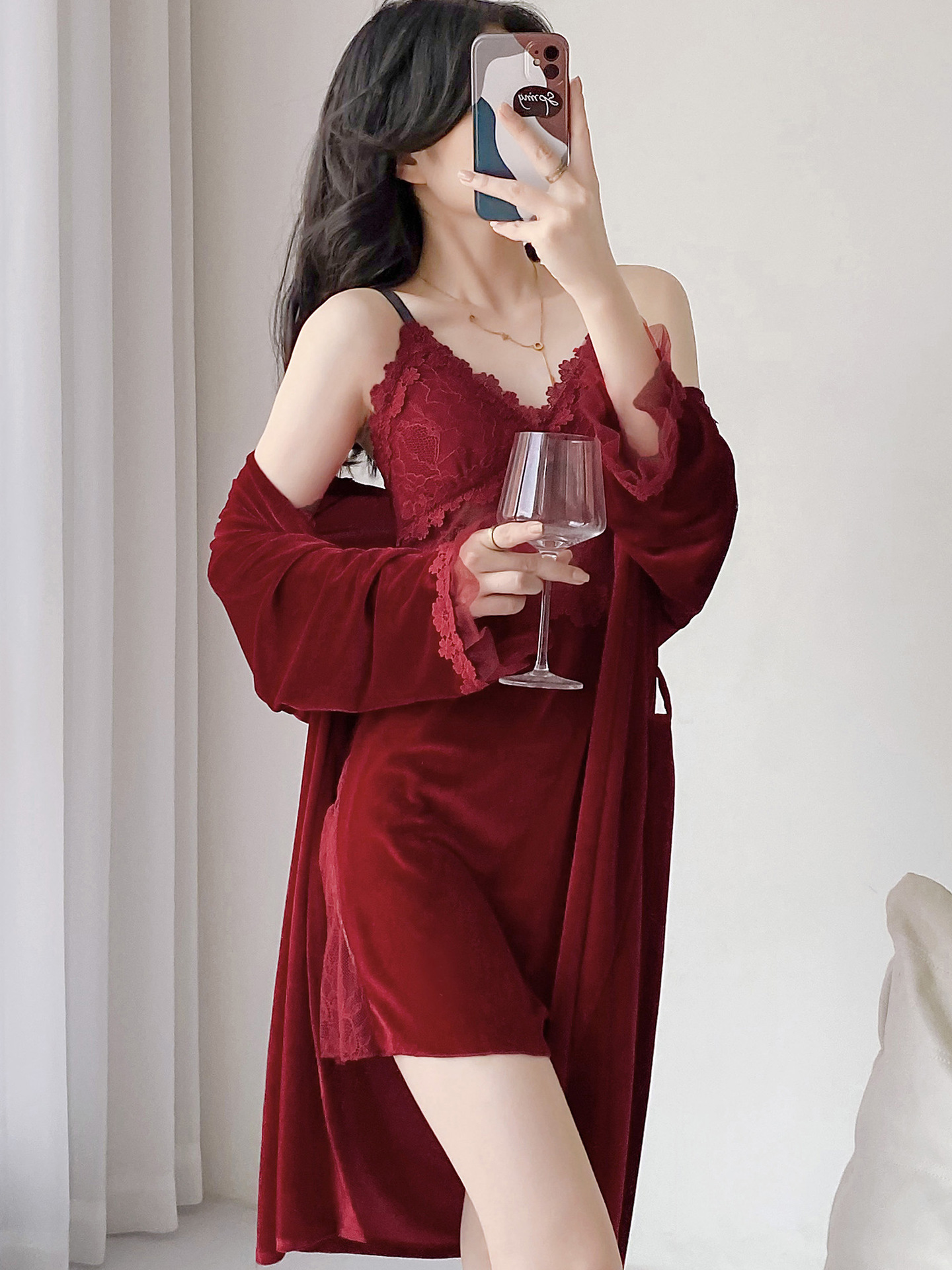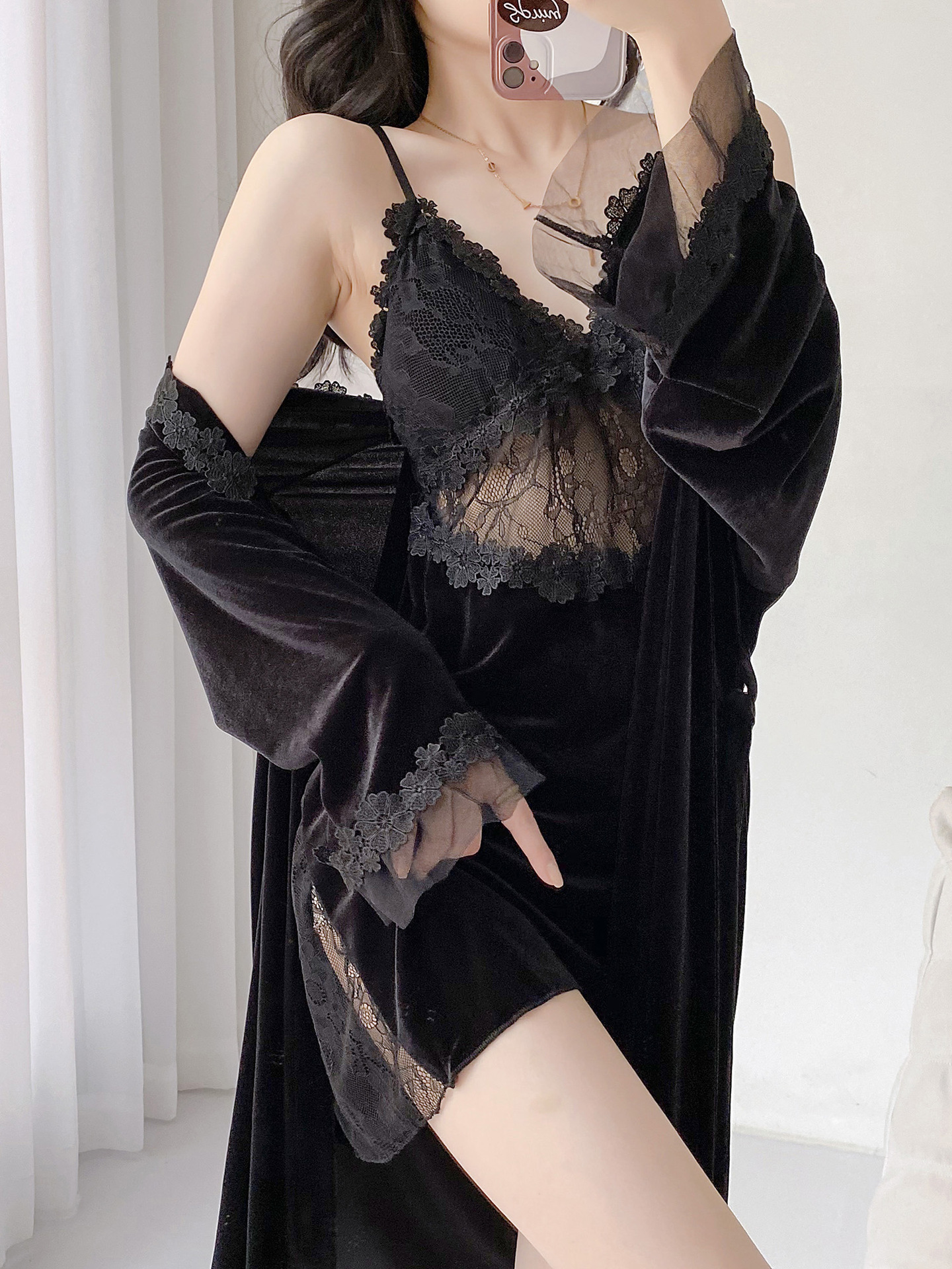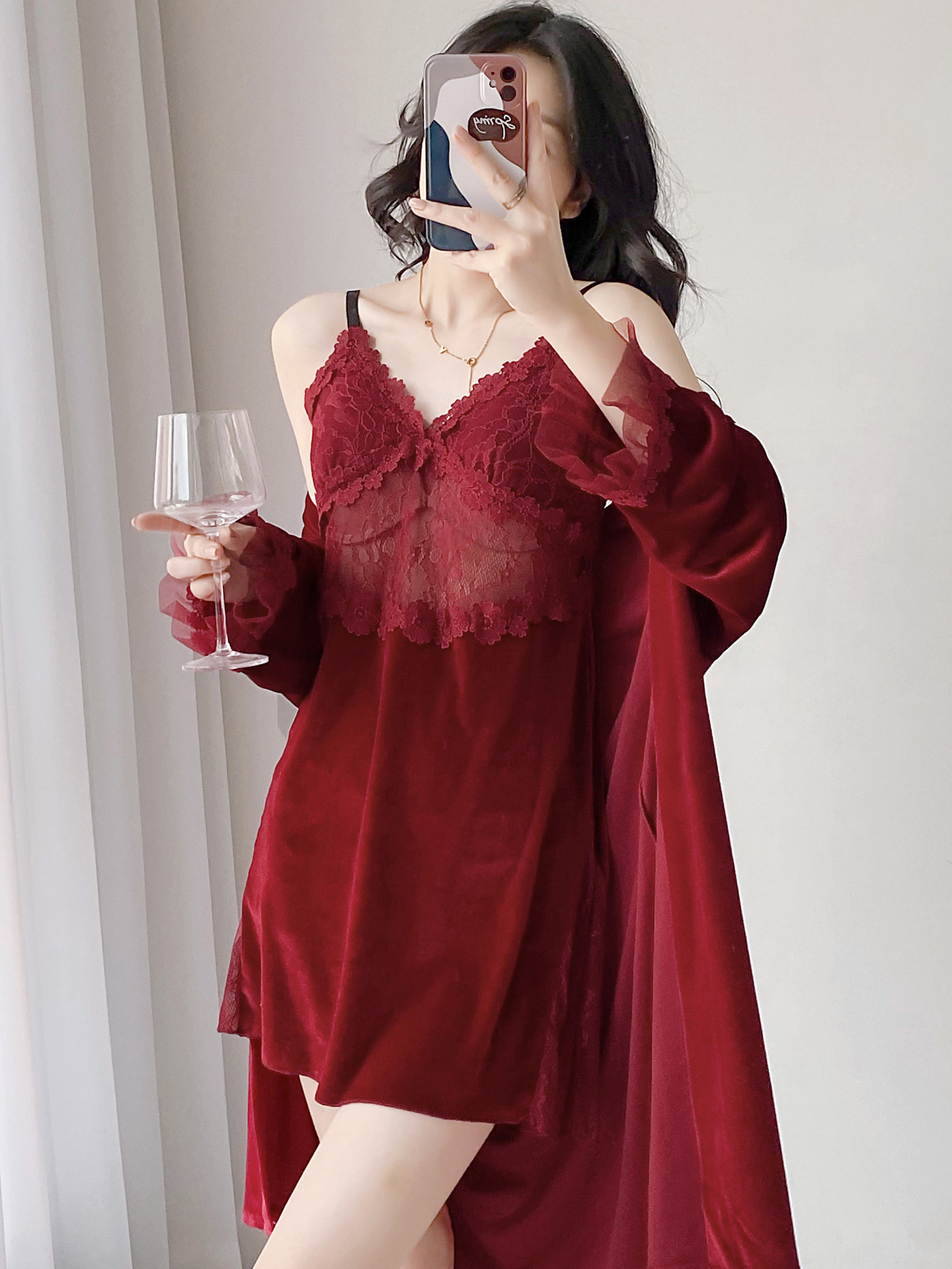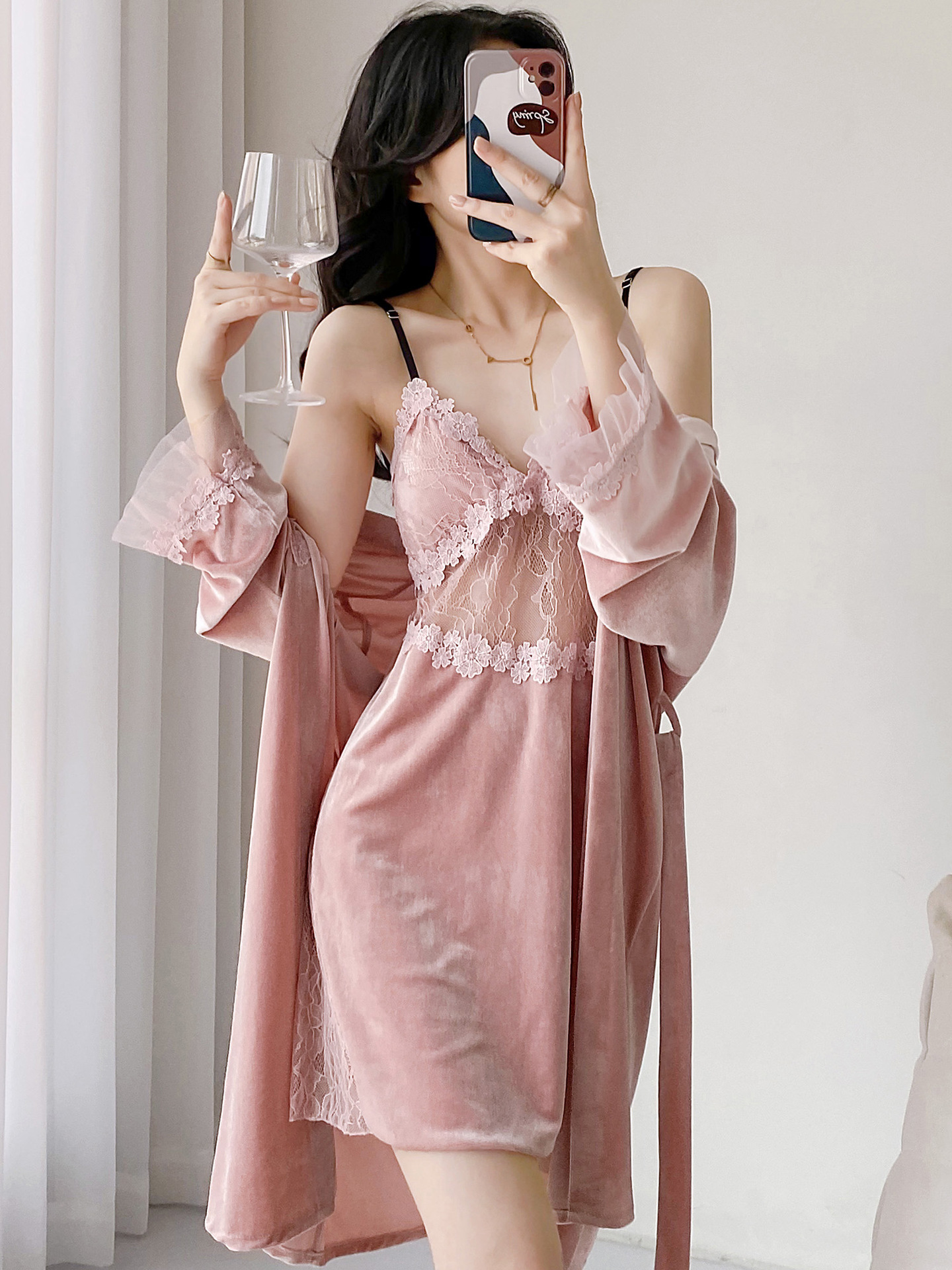골든 벨벳 파자마 여성 가을 · 겨울 한국식 긴팔 잠옷 세트 겨울 섹시 레이스 슬링 나이트가운 투피스 세트