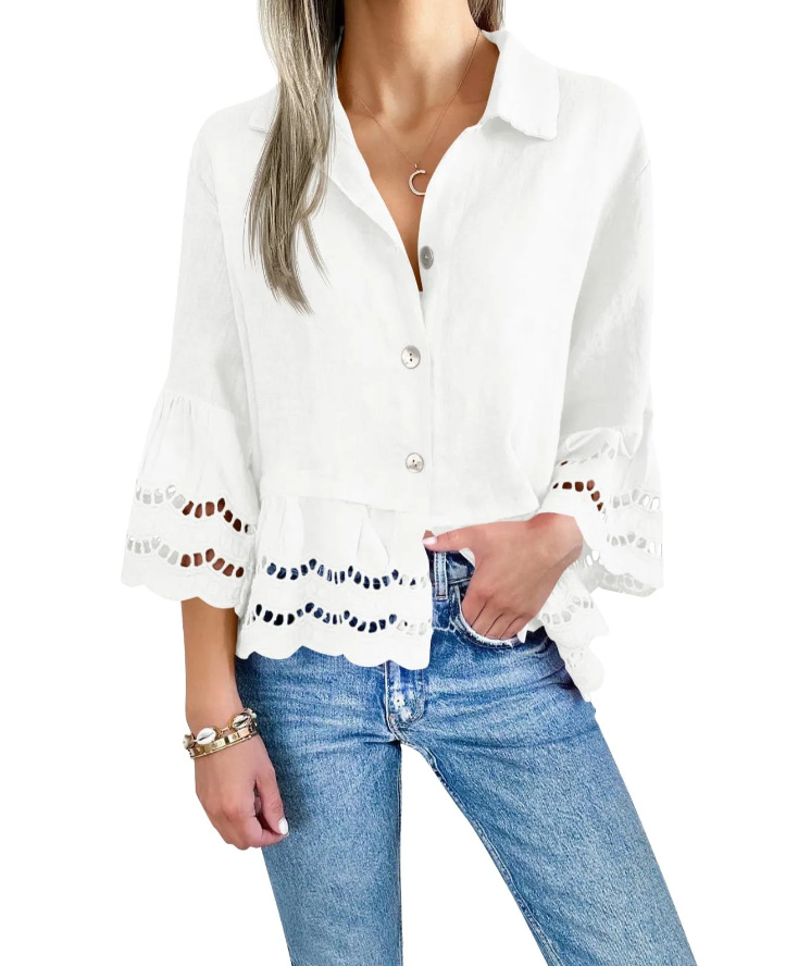 2024 새로운 봄과 여름 유럽과 미국의 국경 여성 대형 레이스 트럼펫 슬리브 할로우 레이스 셔츠스토어 가기