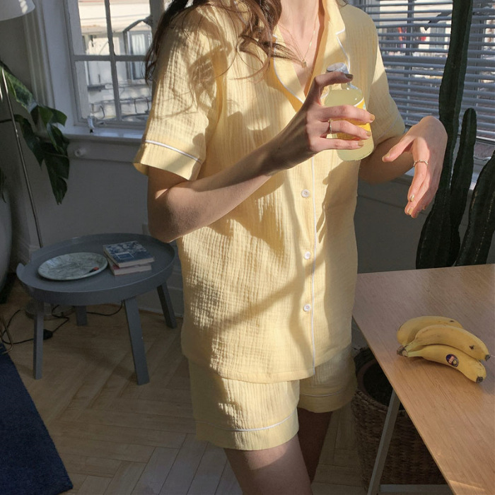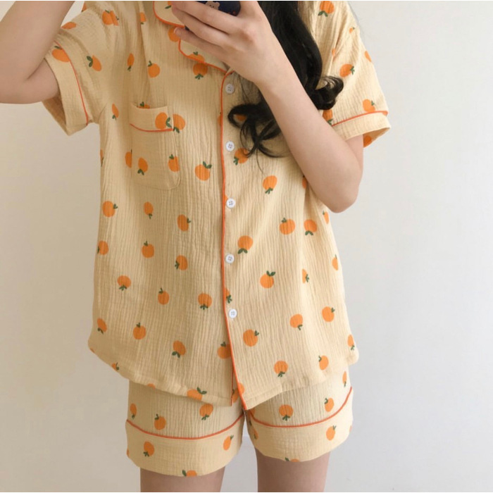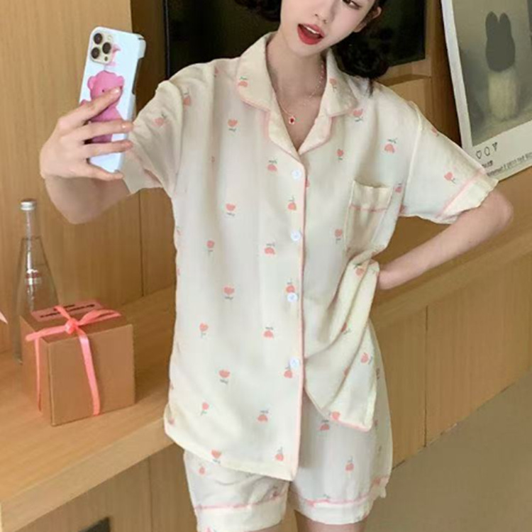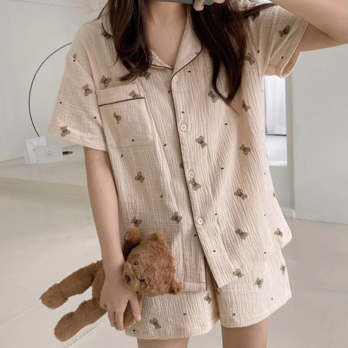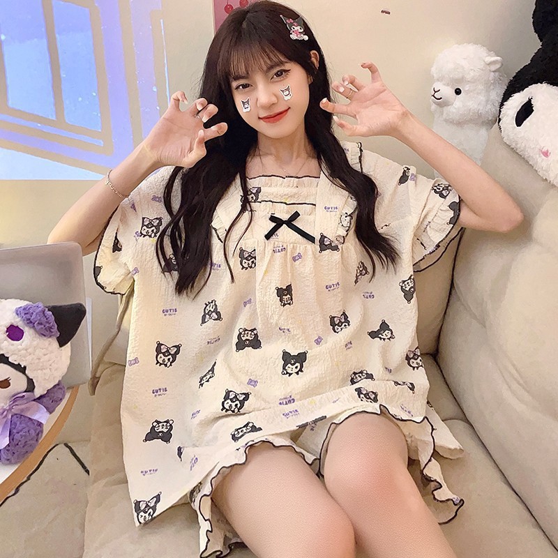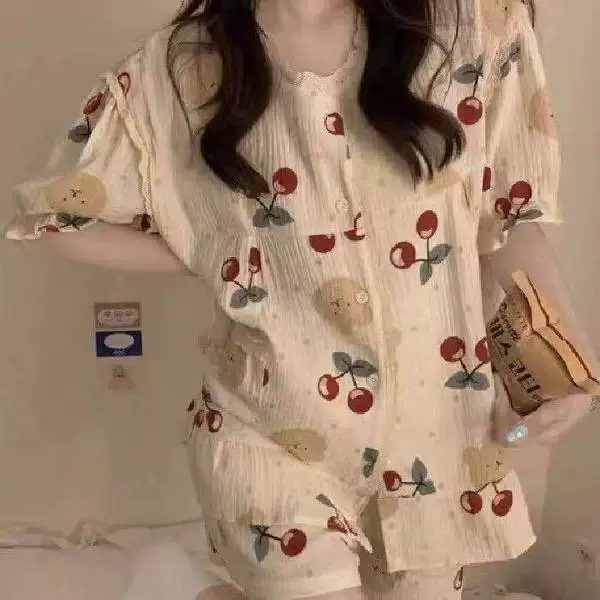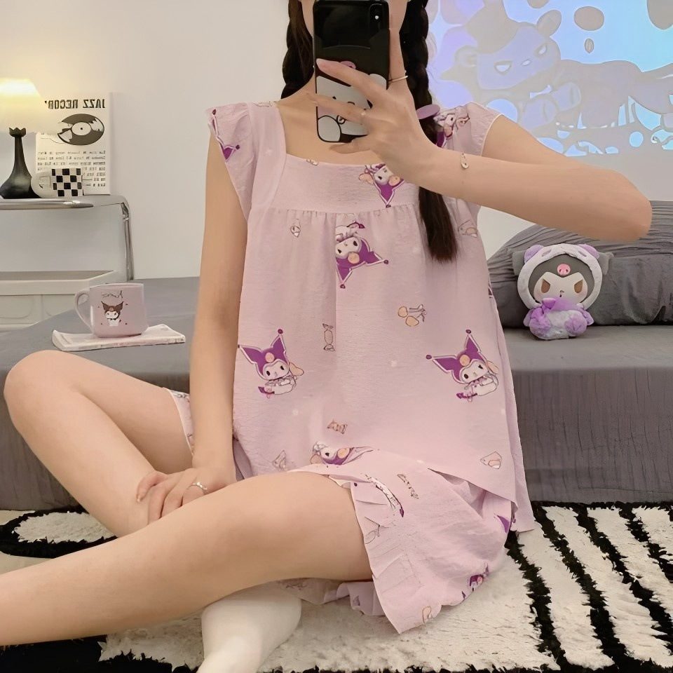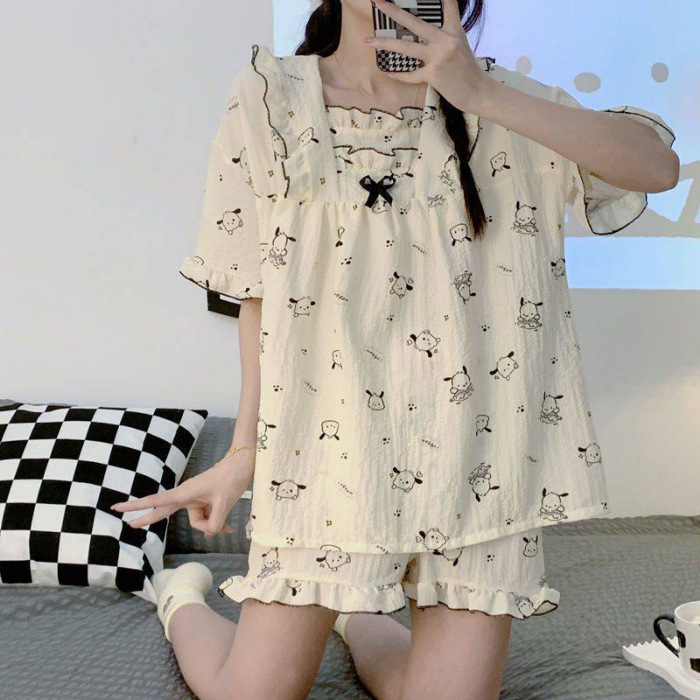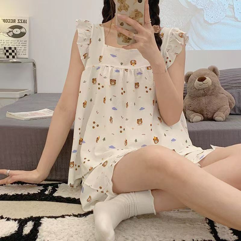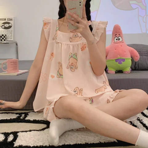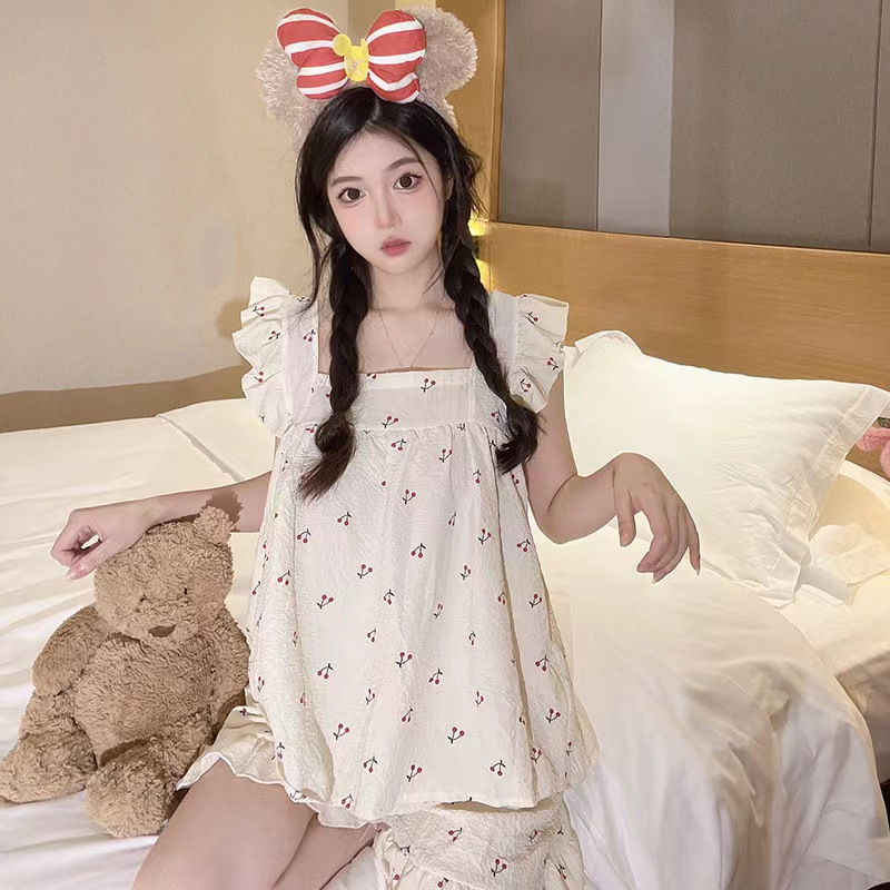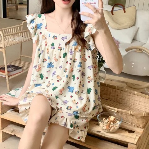여름 작은 비행 소매 잠옷 여성 거품 주름 만화 귀여운 카미솔 두 조각 한국 스타일 홈 의류 세트 여성스토어 가기