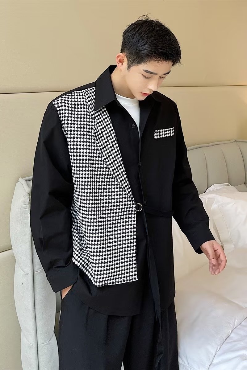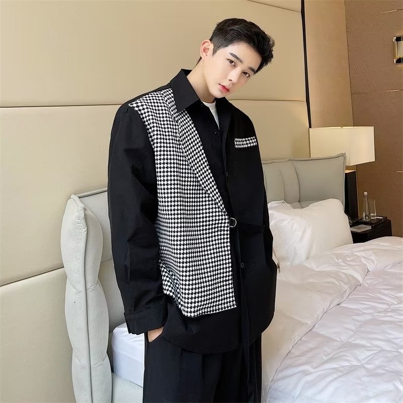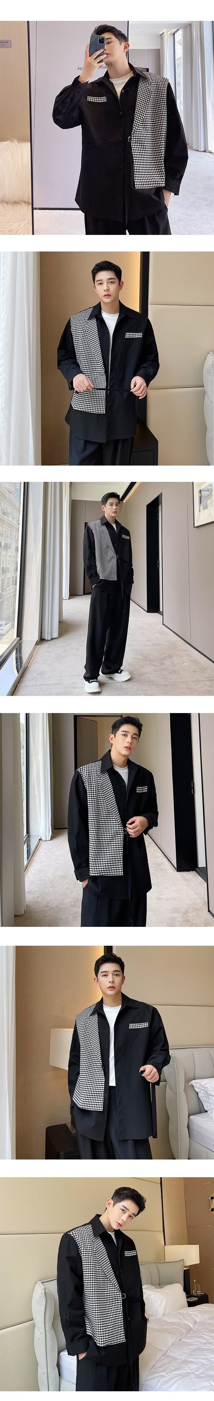 한국식 하이 엔드 콘트라스트 컬러 세트 칼라 디자인 틈새 셔츠 남성용 가짜 투피스 인 러피 잘 생긴 헤어 스타일리스트 탑스토어 가기