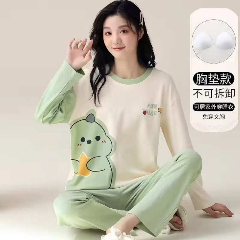 긴 소매 만화 귀여운 세트 여성의 안티 범프 풀오버 홈 옷을 입고 가을과 겨울 가슴 패드 잠옷과 함께 온다스토어 가기