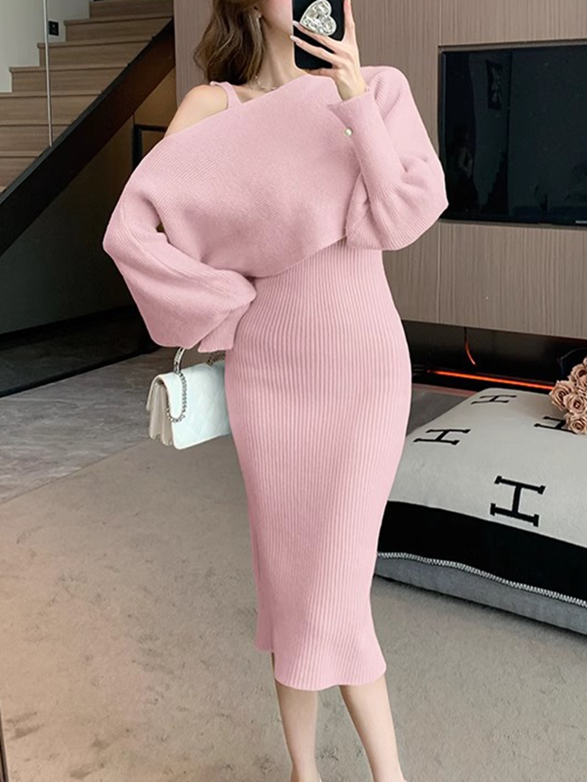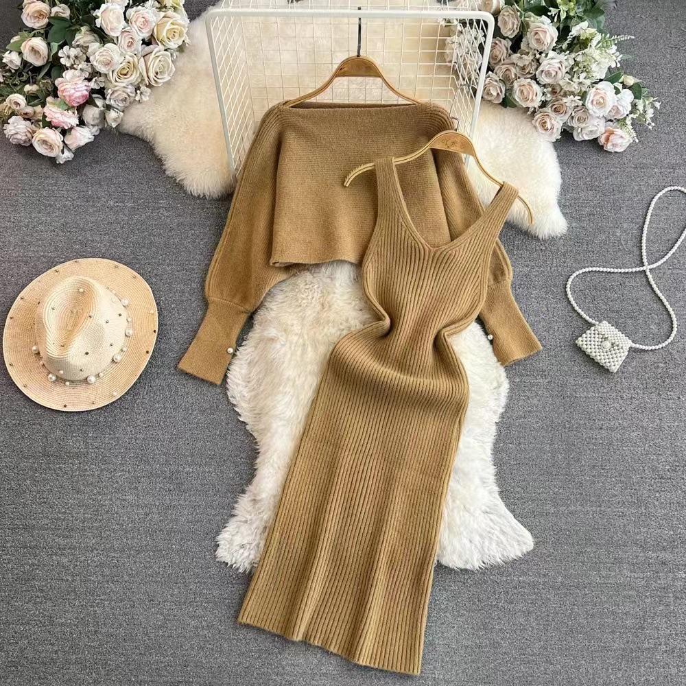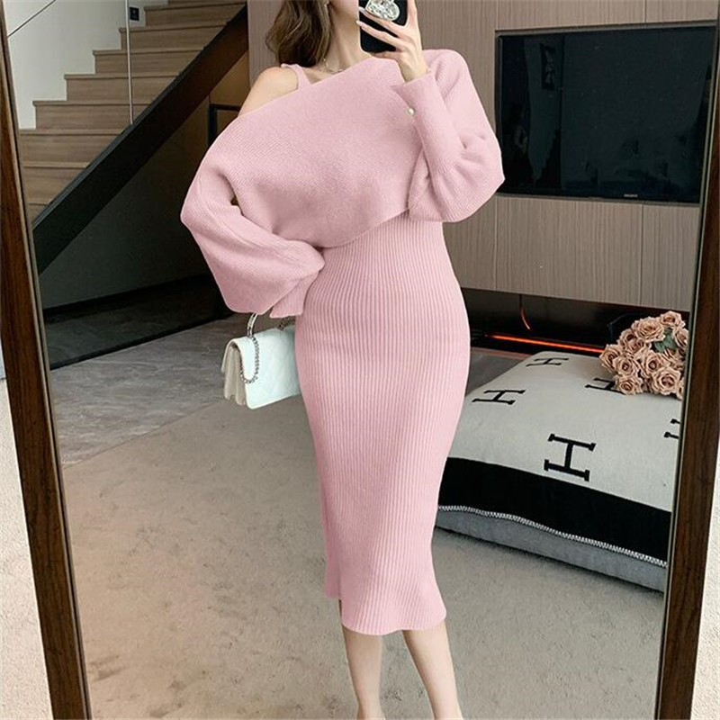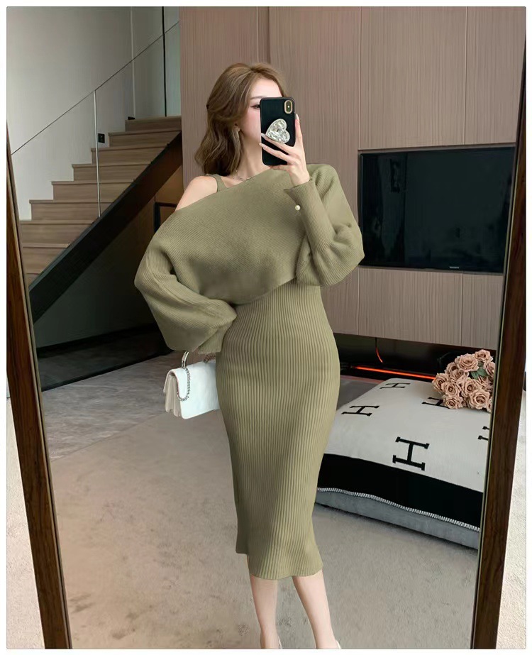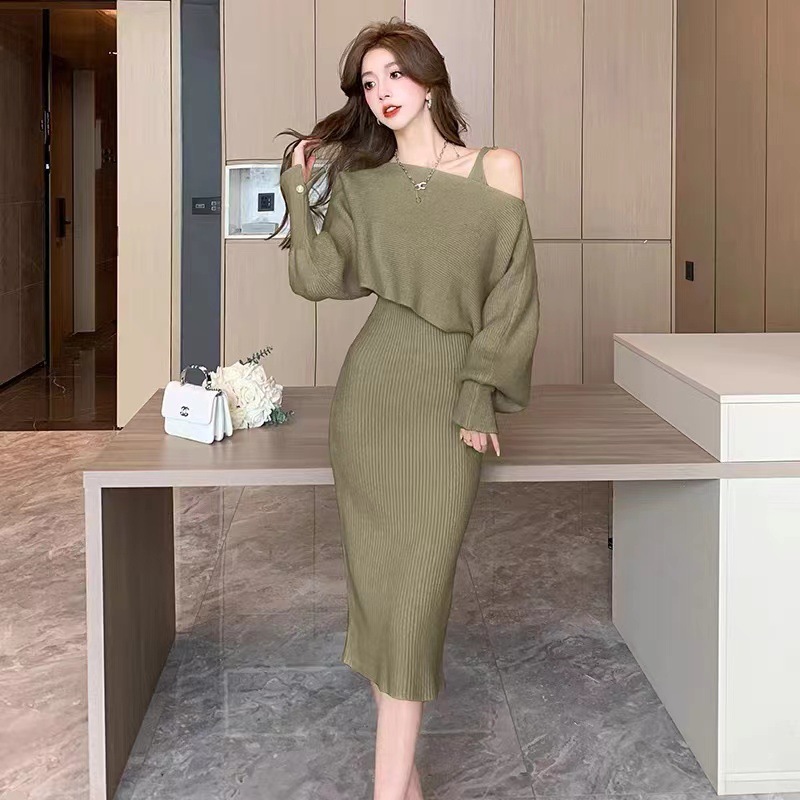 니트 스웨터 여성의 2024 년 새로운 가을과 겨울 스웨터 스택 스커트 여성 투피스 긴팔 유행 어깨 노출 원피스