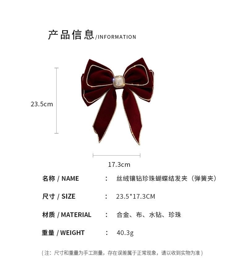2024 새로운 벨벳 다이아몬드가 박힌 진주 활 머리핀 한국 패션 과장된 봄 클립 우아한 머리핀 헤어 액세서리