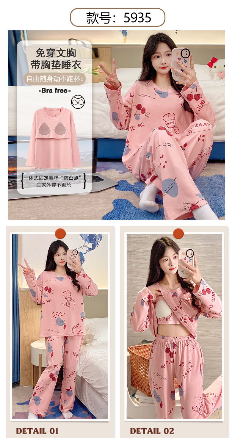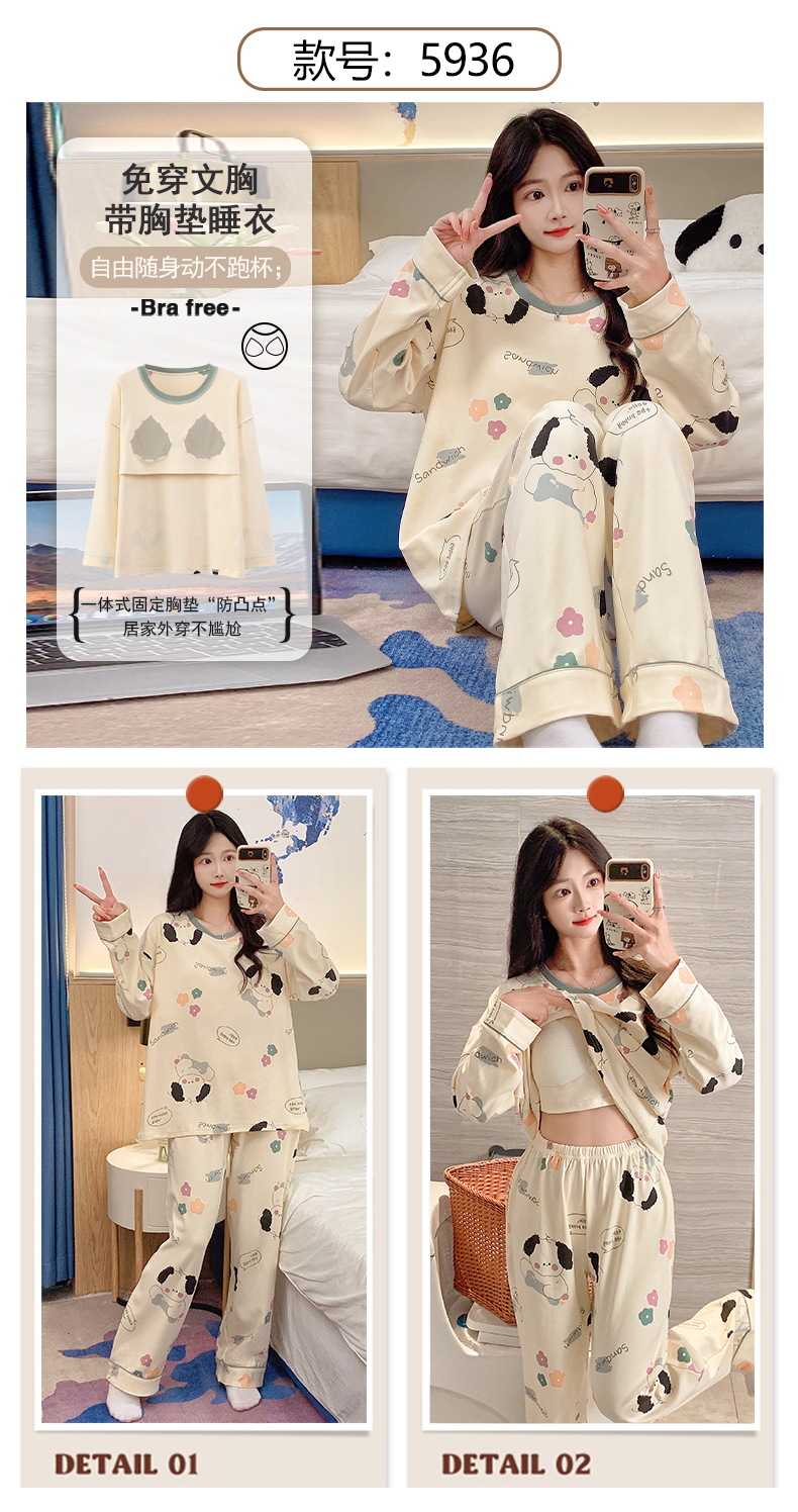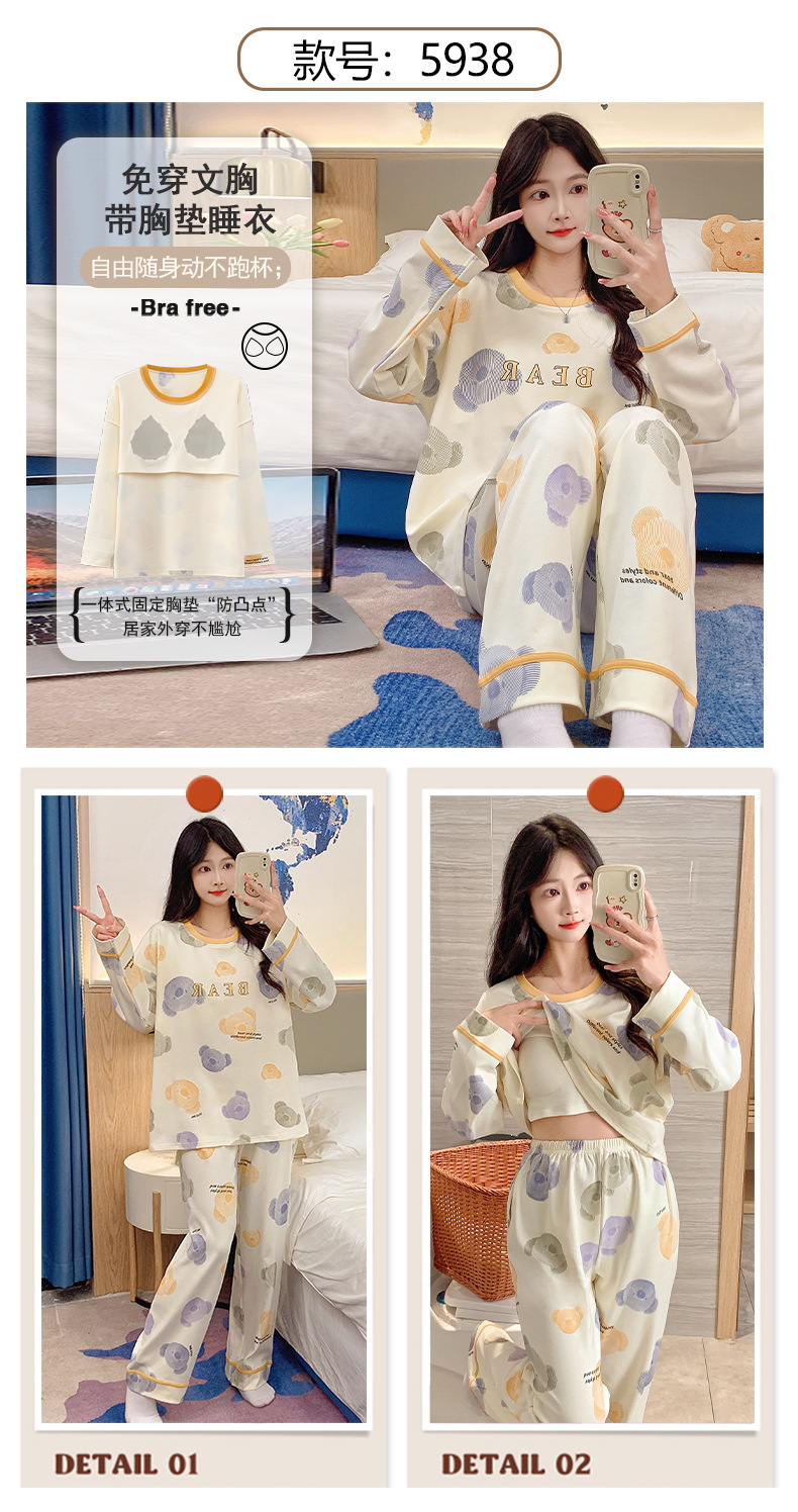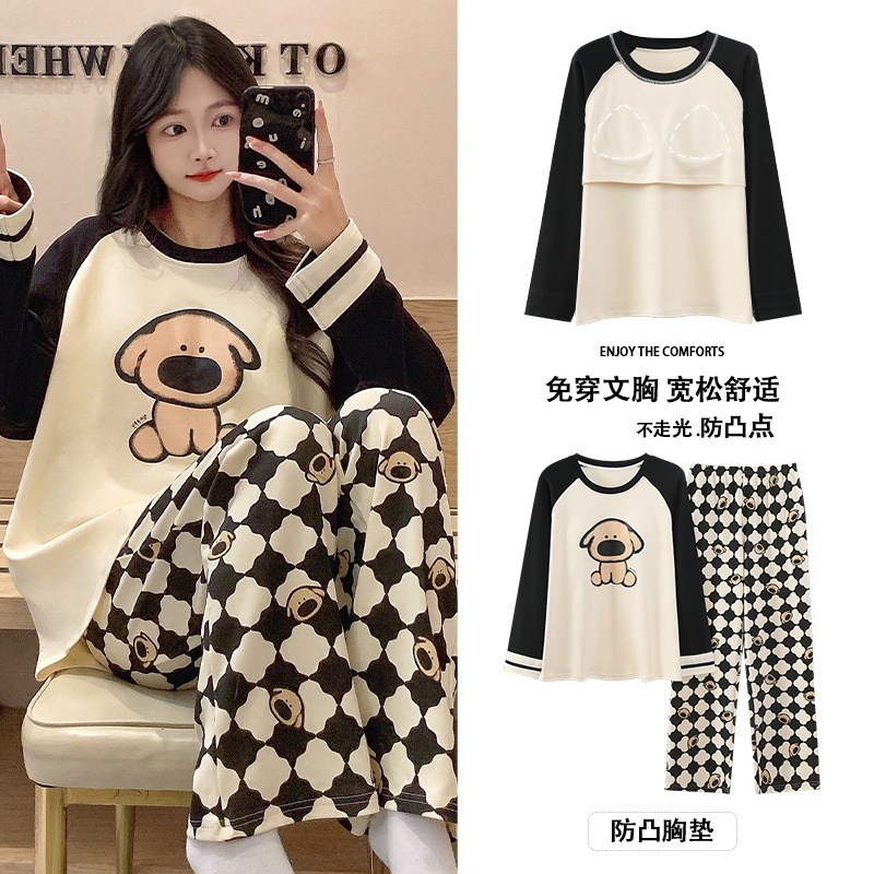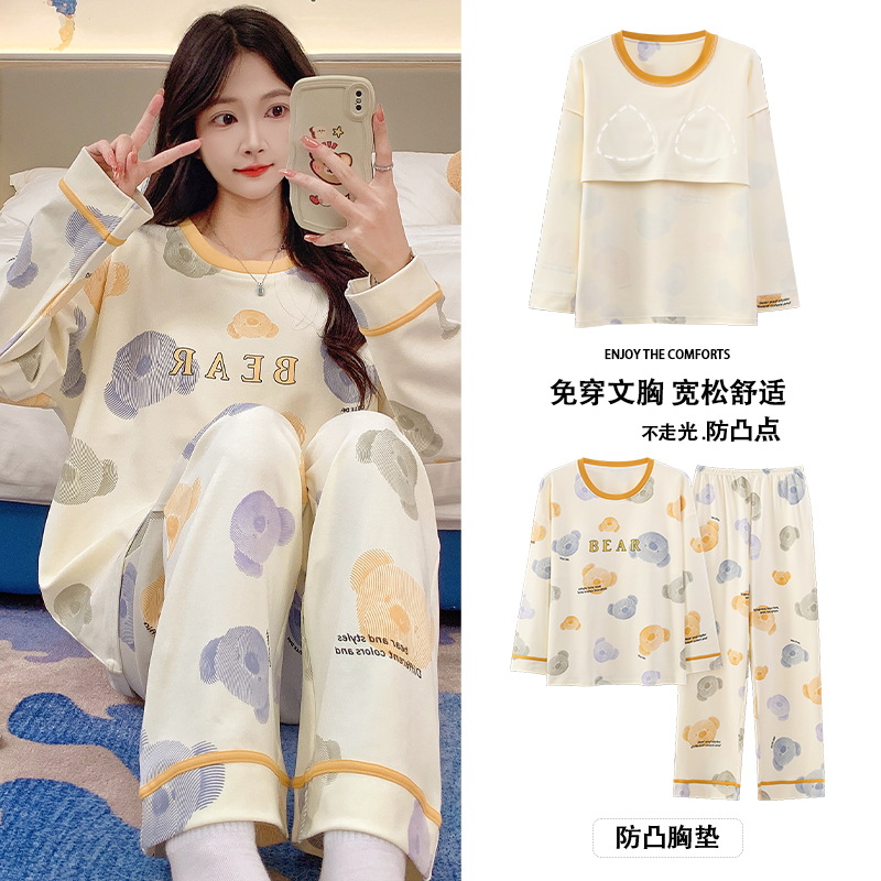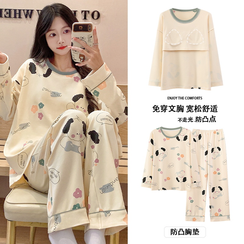 긴 소매 바지 파자마 여성의 봄과 가을 면 가슴 패드와 함께 귀여운 여성 소녀의 집 옷 2024 새로운 가을과 겨울스토어 가기