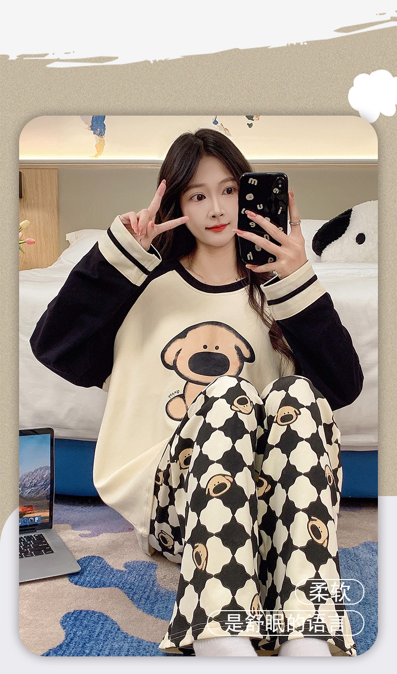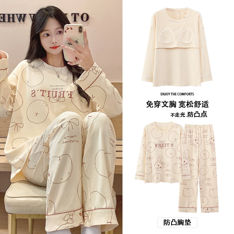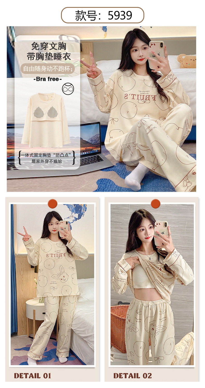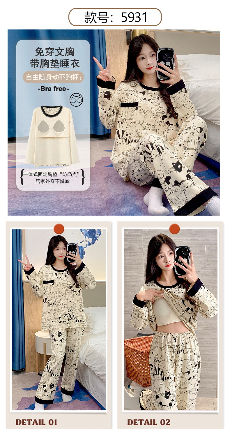 긴 소매 바지 파자마 여성의 봄과 가을 면 가슴 패드와 함께 귀여운 여성 소녀의 집 옷 2024 새로운 가을과 겨울스토어 가기