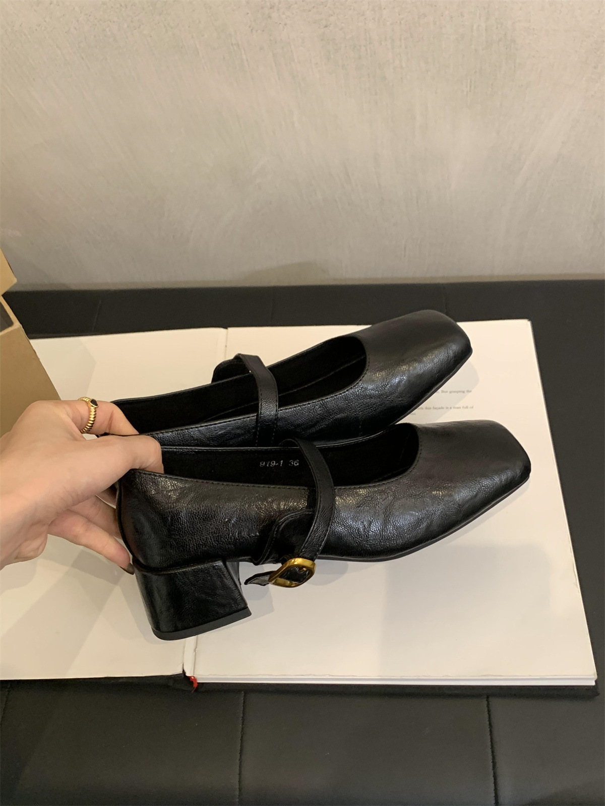프랑스 레트로 스퀘어 발가락 얕은 입 싱글 레이어 신발 여성 미드 힐 봄과 가을 저녁 스타일 우아한 요정 두꺼운 힐 메리 제인 작은 가죽 신발