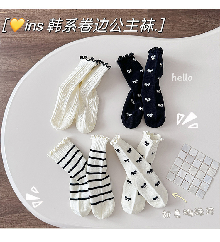 4 쌍의 어린이 양말 도매 가을 및 겨울 어린이 면화 양말 한국 뼈없는 흑백 줄무늬 나비 헴 소녀 양말스토어 가기