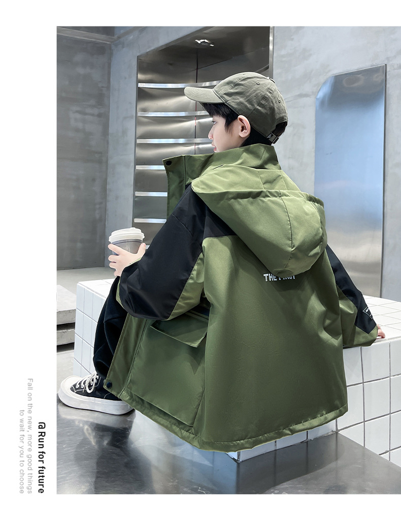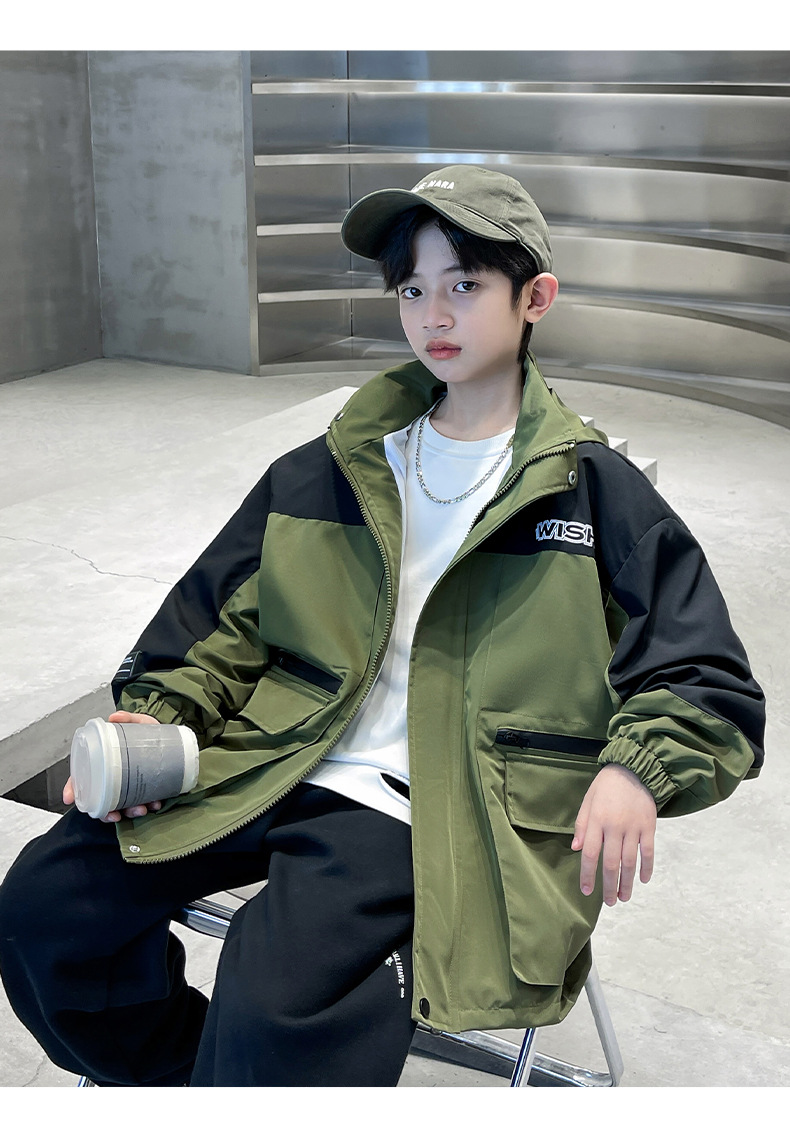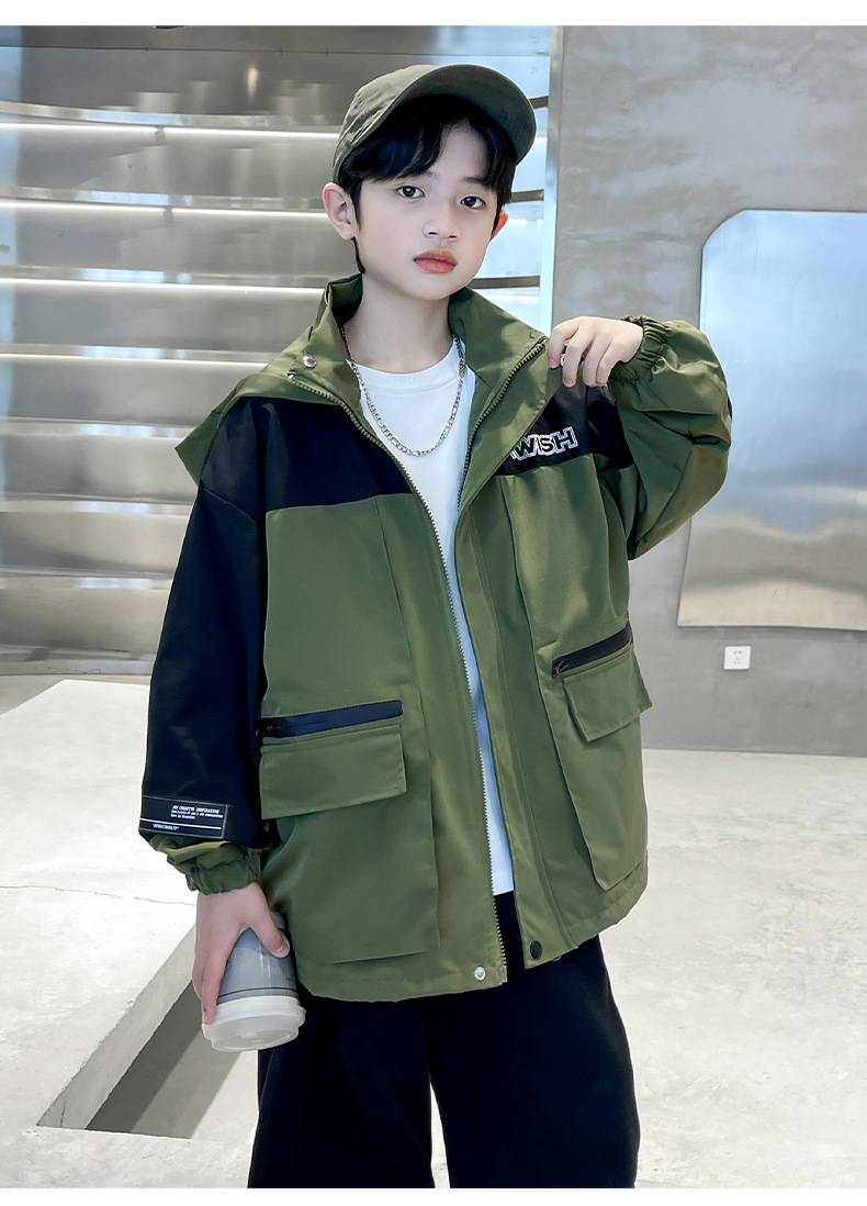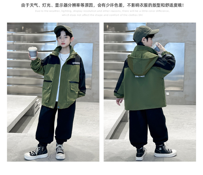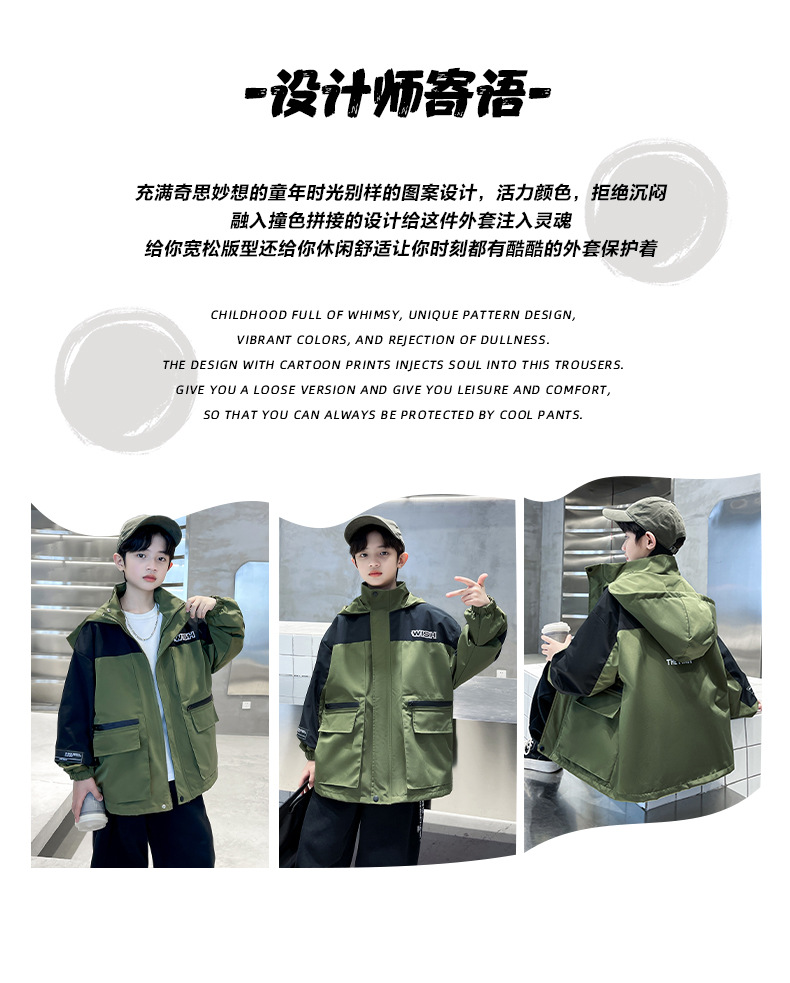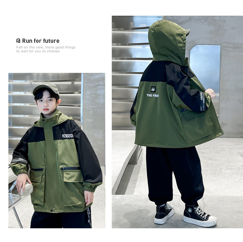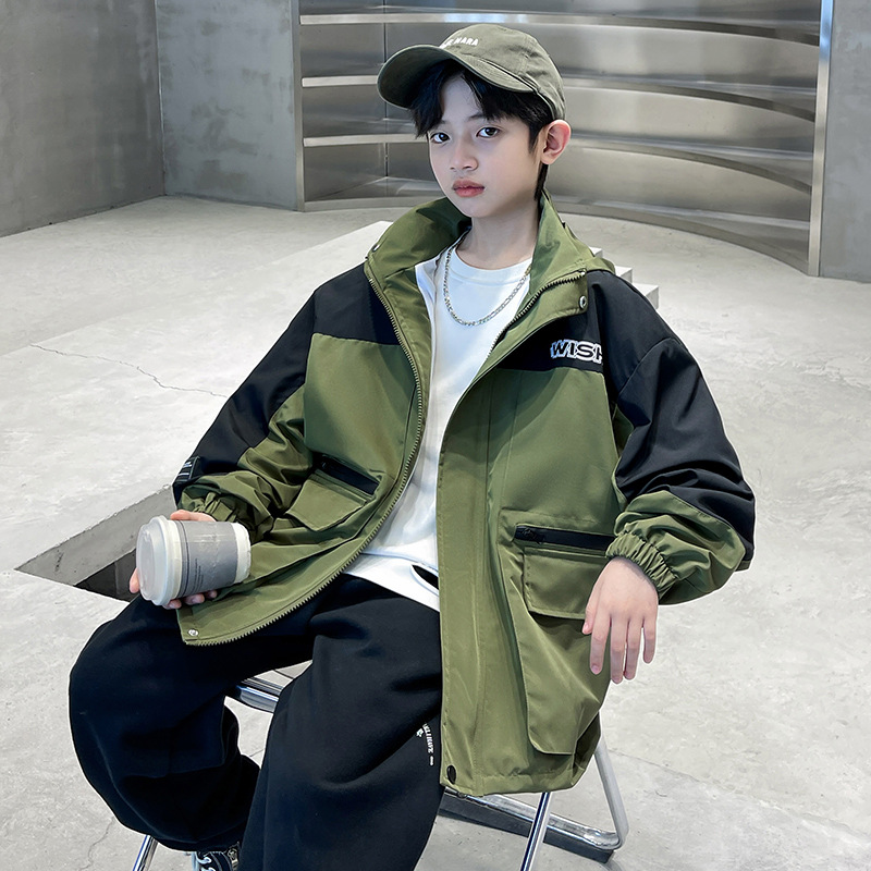 어린이 코트 봄과 가을 소년의 후드 코트 2024 새로운 도착 중대형 소년의 잘 생긴 가을 재킷 탑스토어 가기