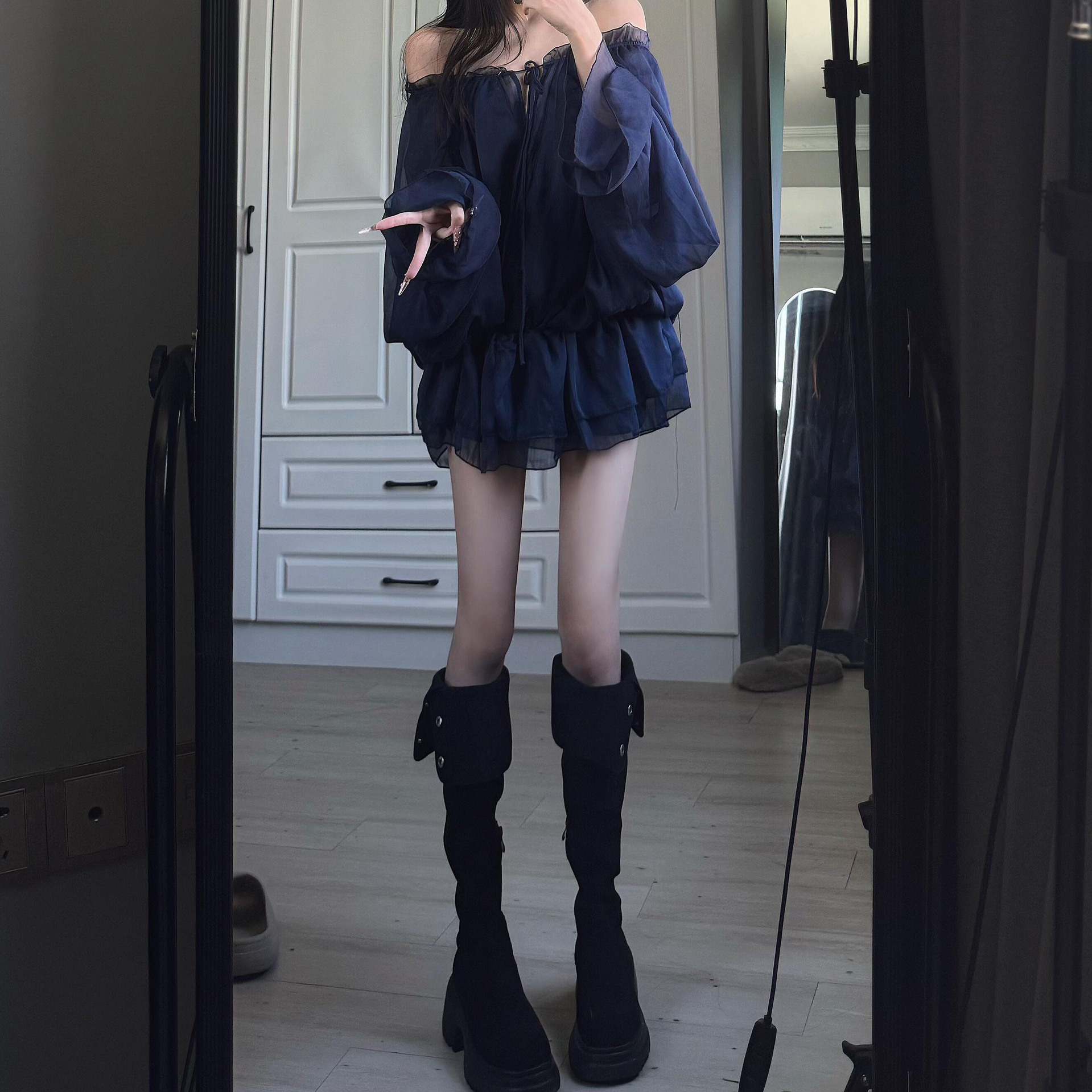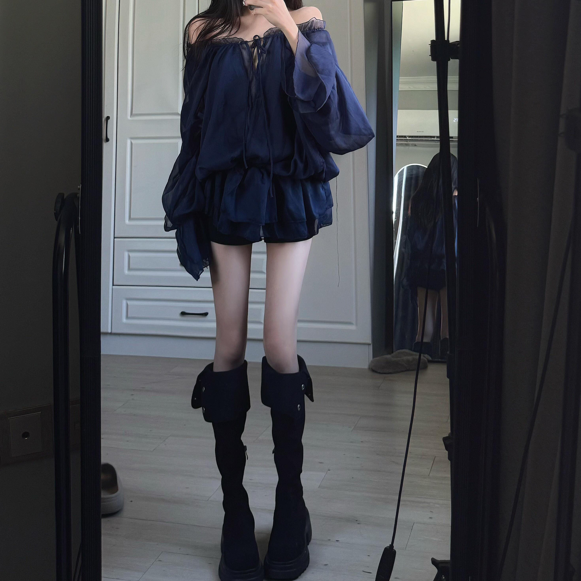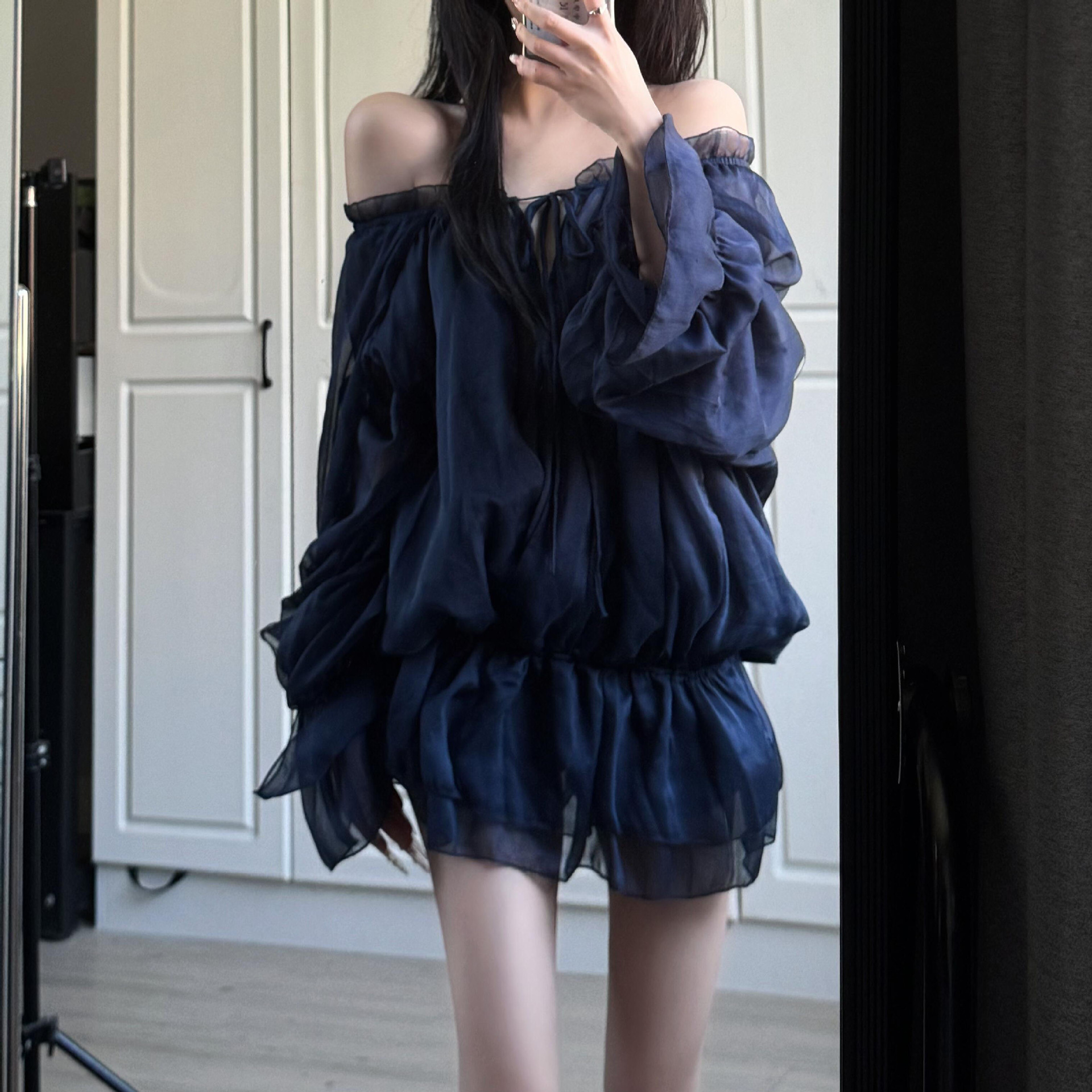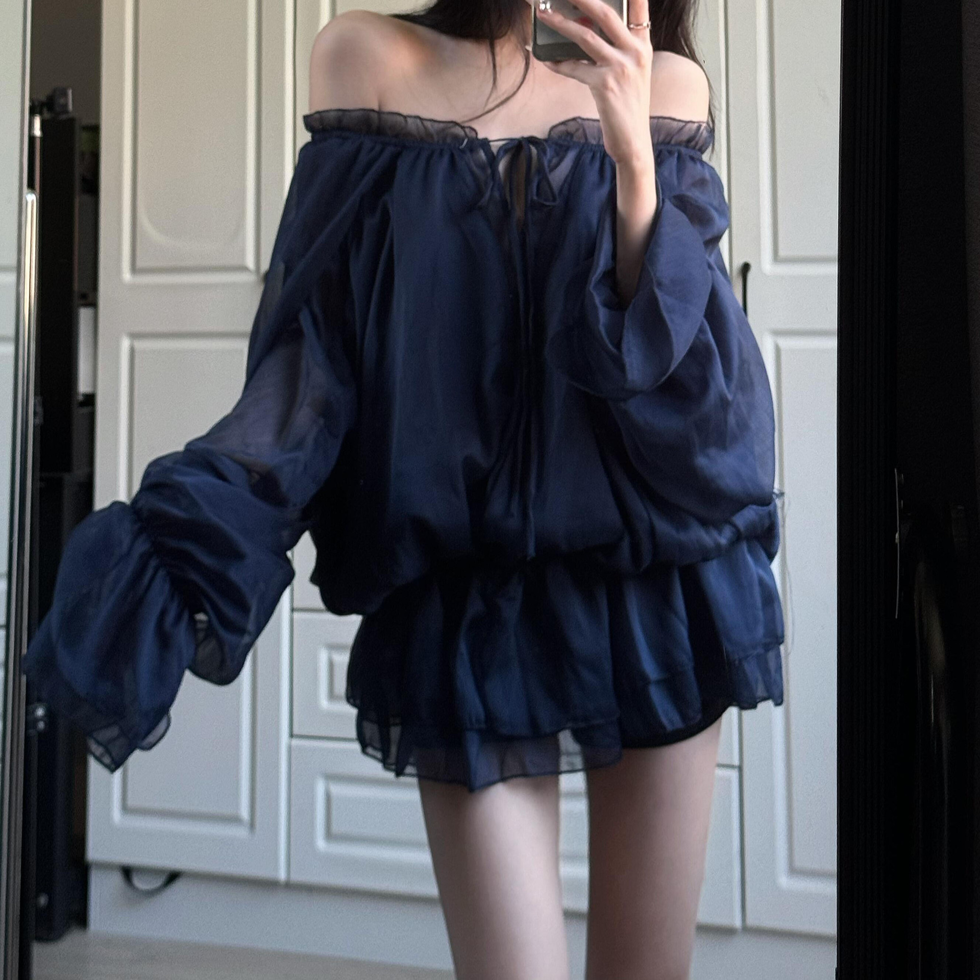 프렌치 블루 오프 숄더 긴팔 쉬폰 셔츠 여성의 여름 느슨한 부드러운 디자인 메쉬 아름다운 탑