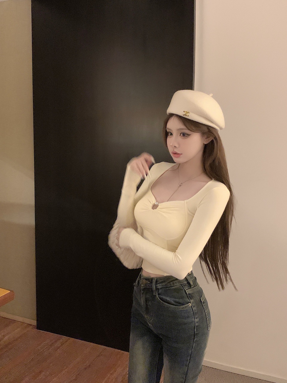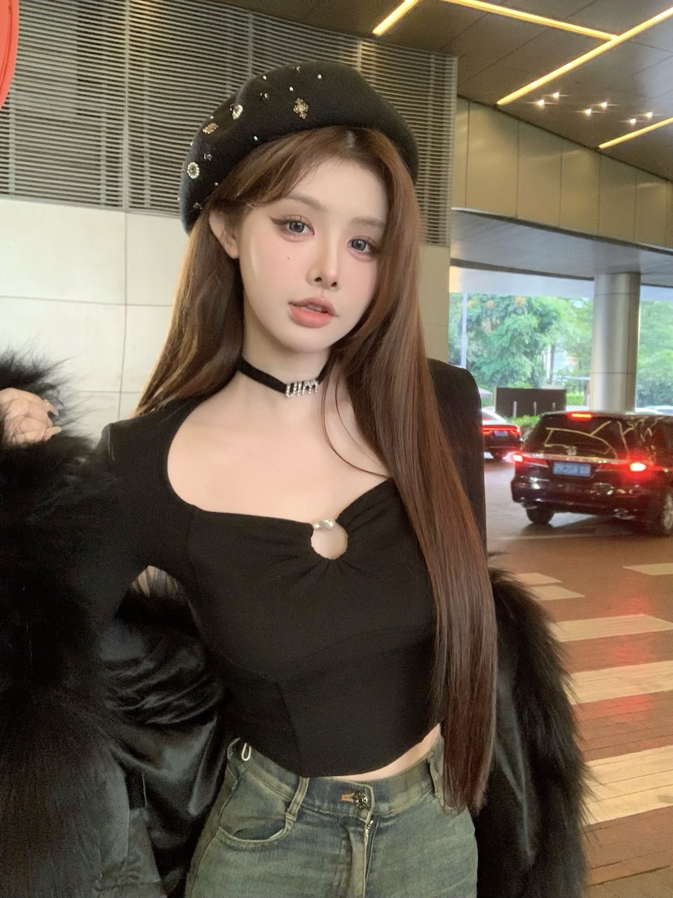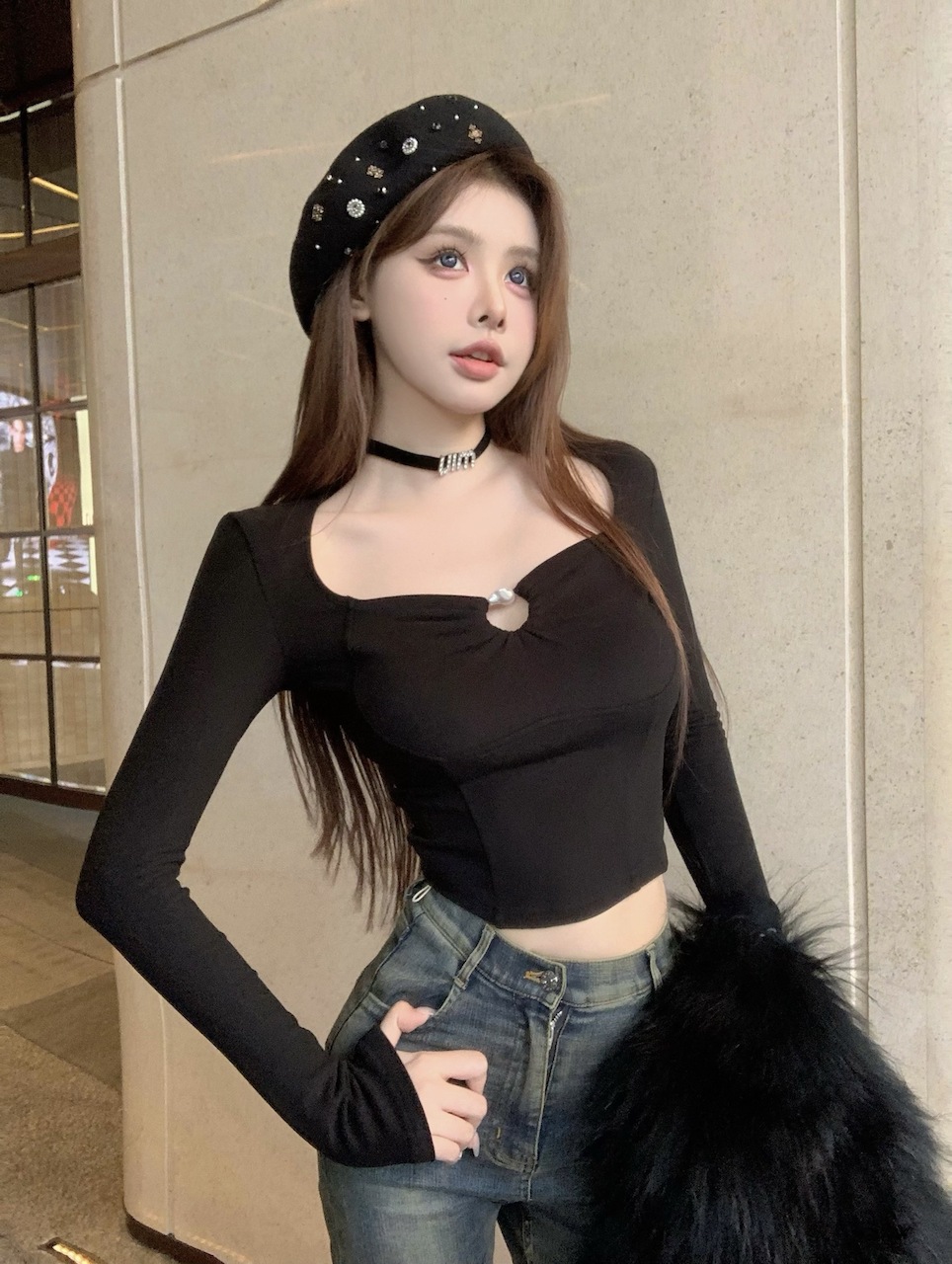 스파이스 걸스 순수한 욕망 스타일 디자인 센스 할로우 세련된 긴팔 티셔츠 여성용 가을과 겨울 슬림 핏 내베이스 셔츠 쇼트 탑