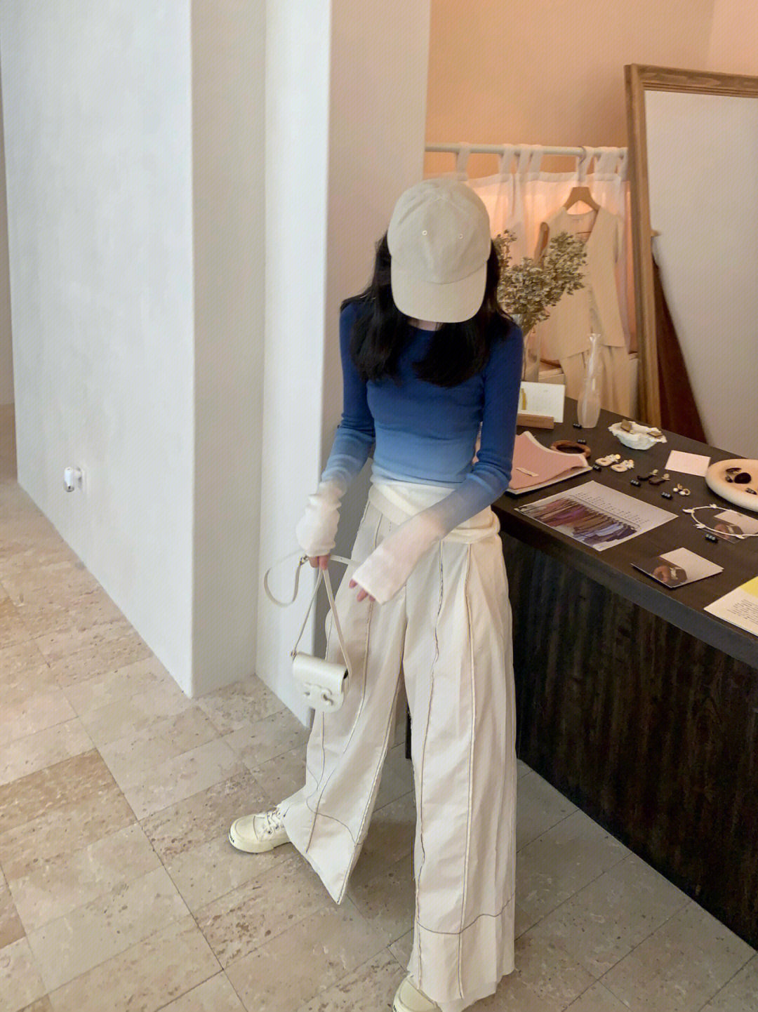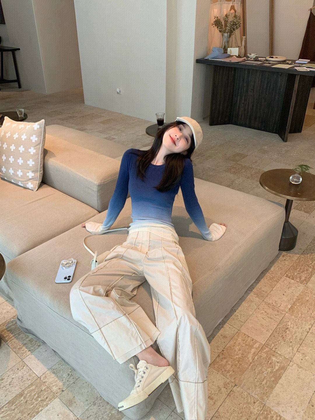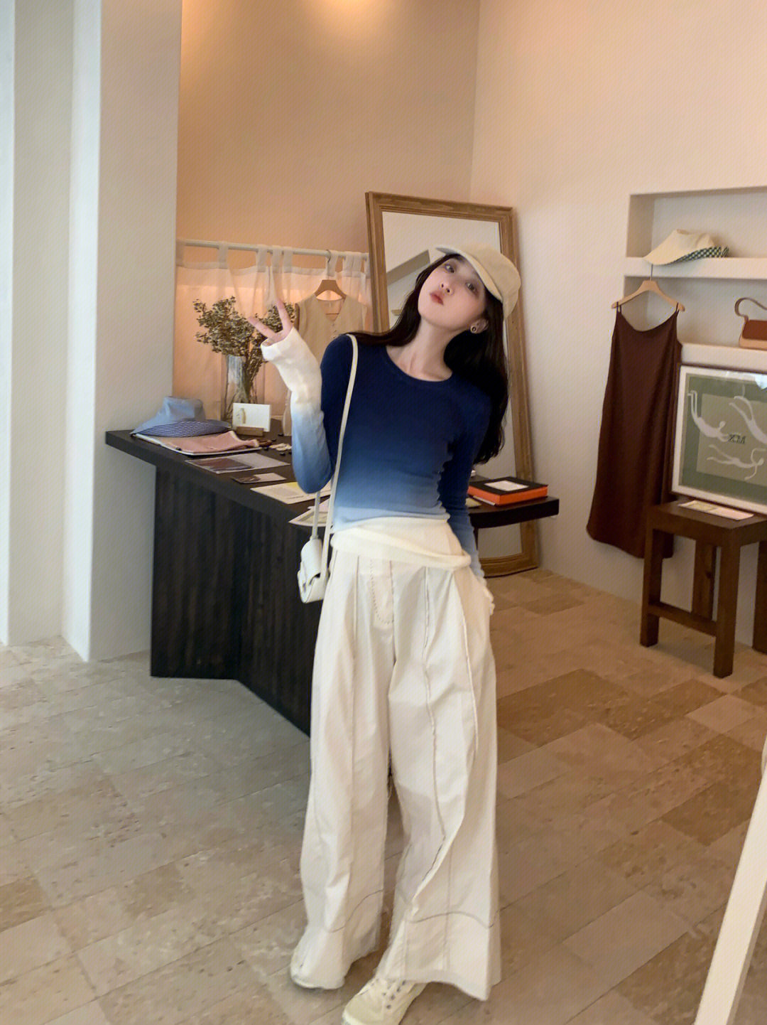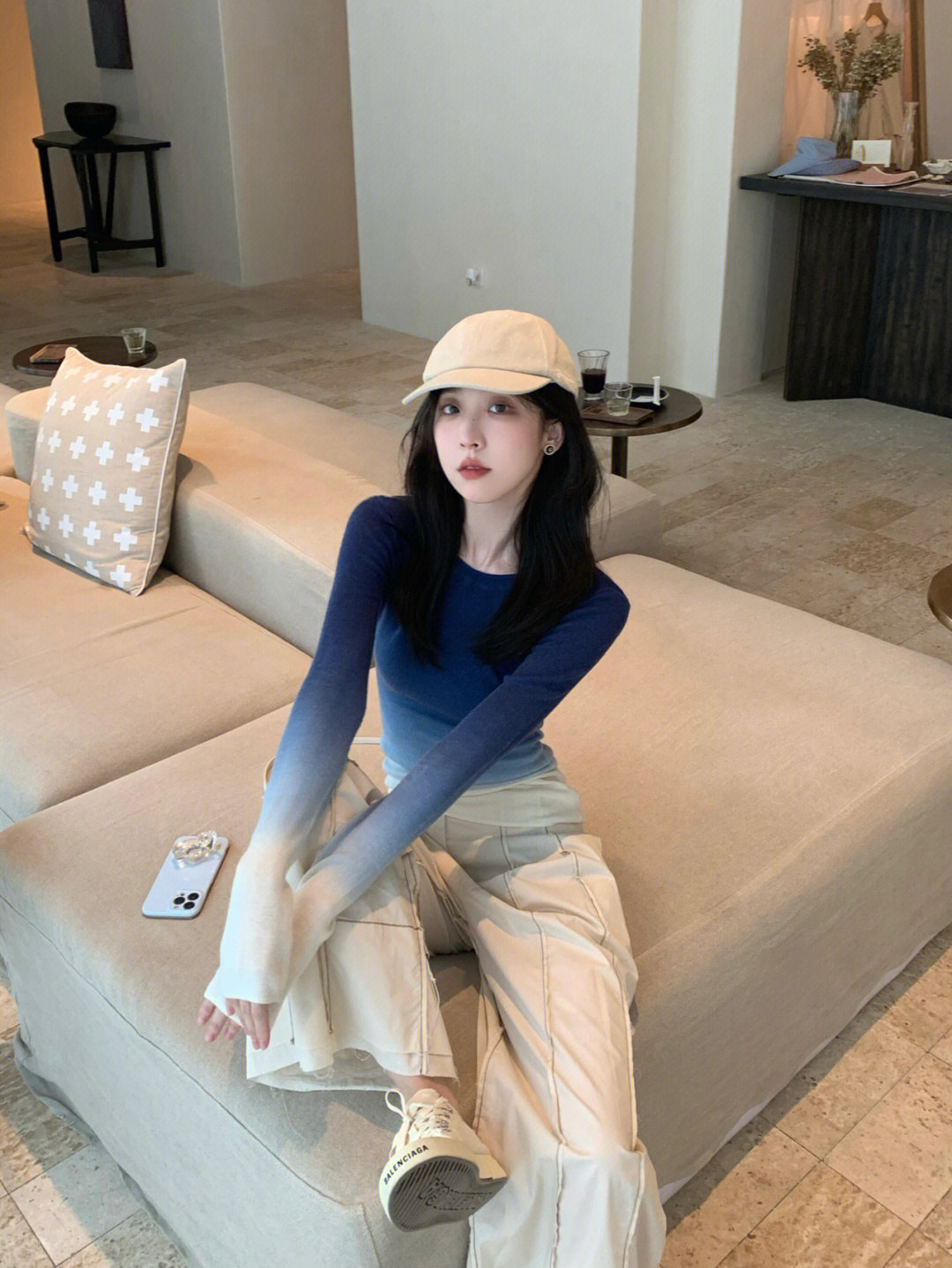 그라디언트 블루 니트 긴팔 티셔츠 여성용 달콤하고 뜨거운 디자인 틈새 슬림 핏 탑, 가을과 겨울을위한 기본 셔츠스토어 가기