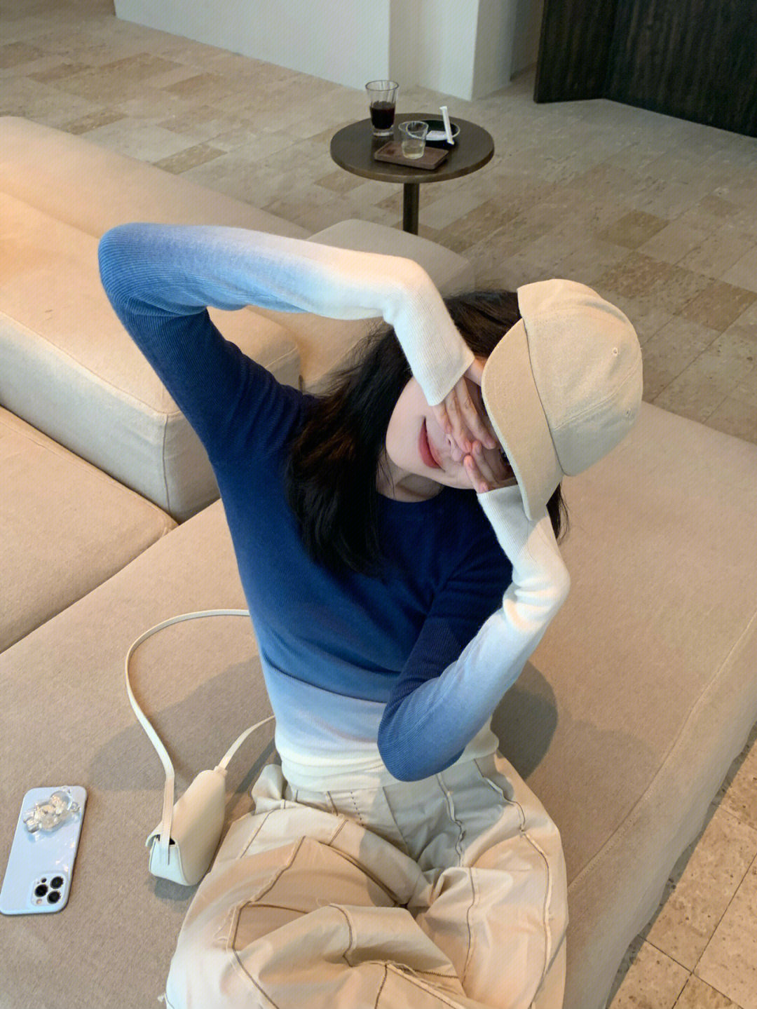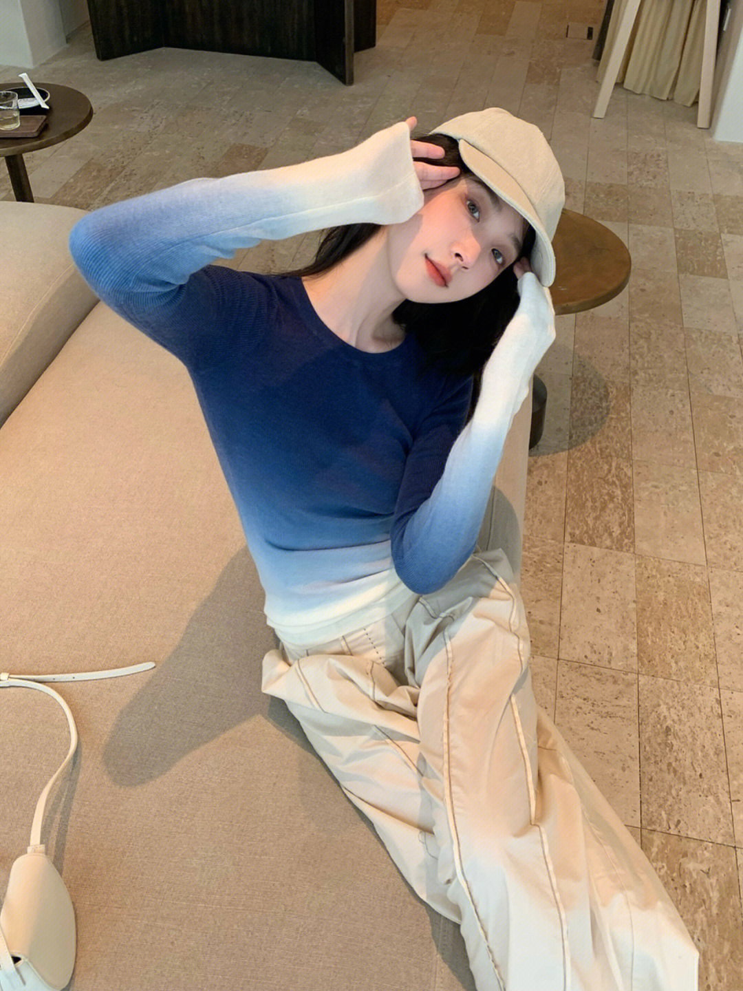 渐变蓝色针织长袖t恤女秋冬季甜辣设计感小众修身上衣内搭打底衫