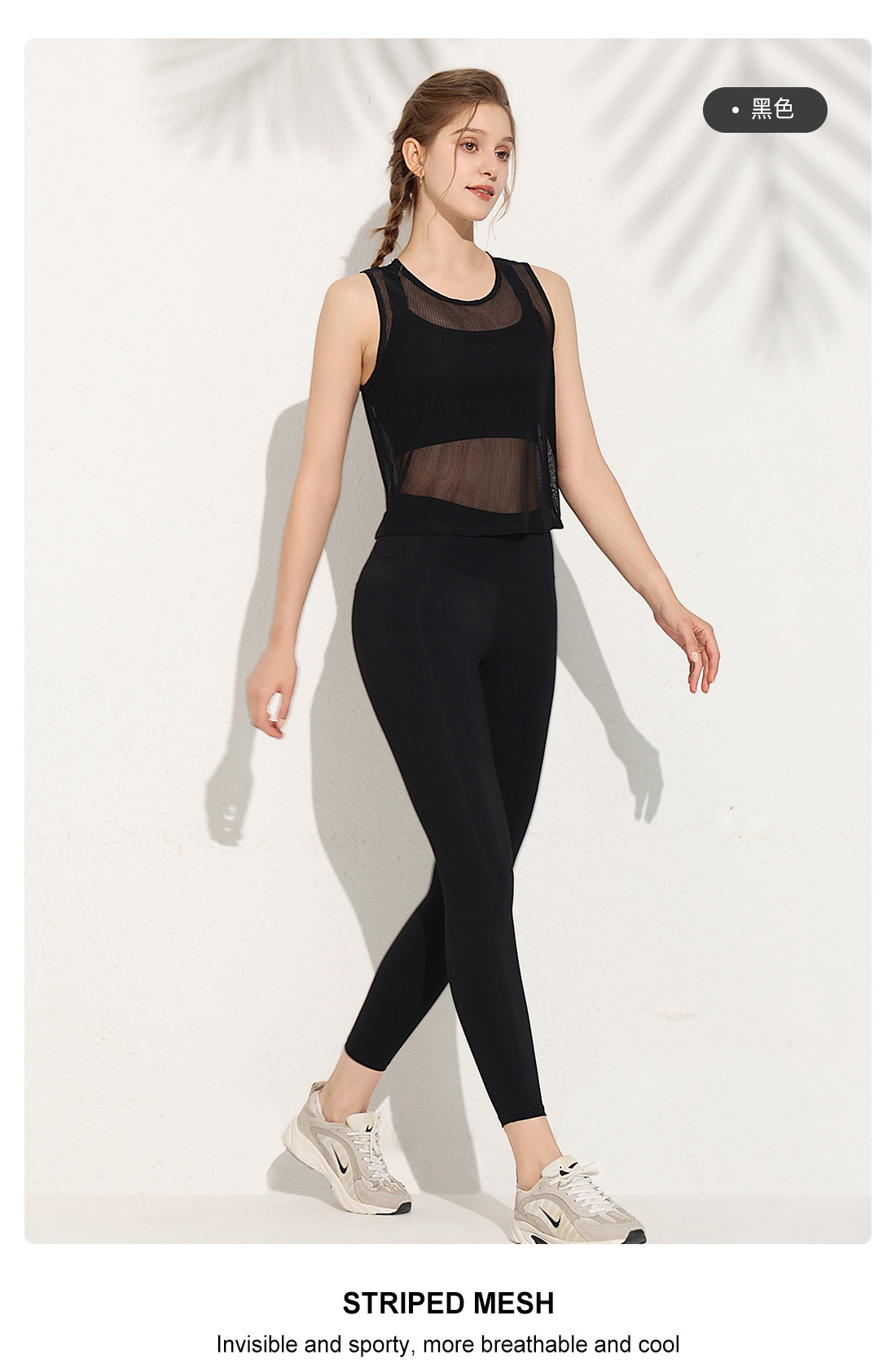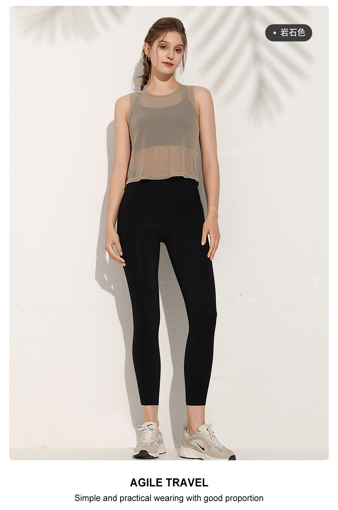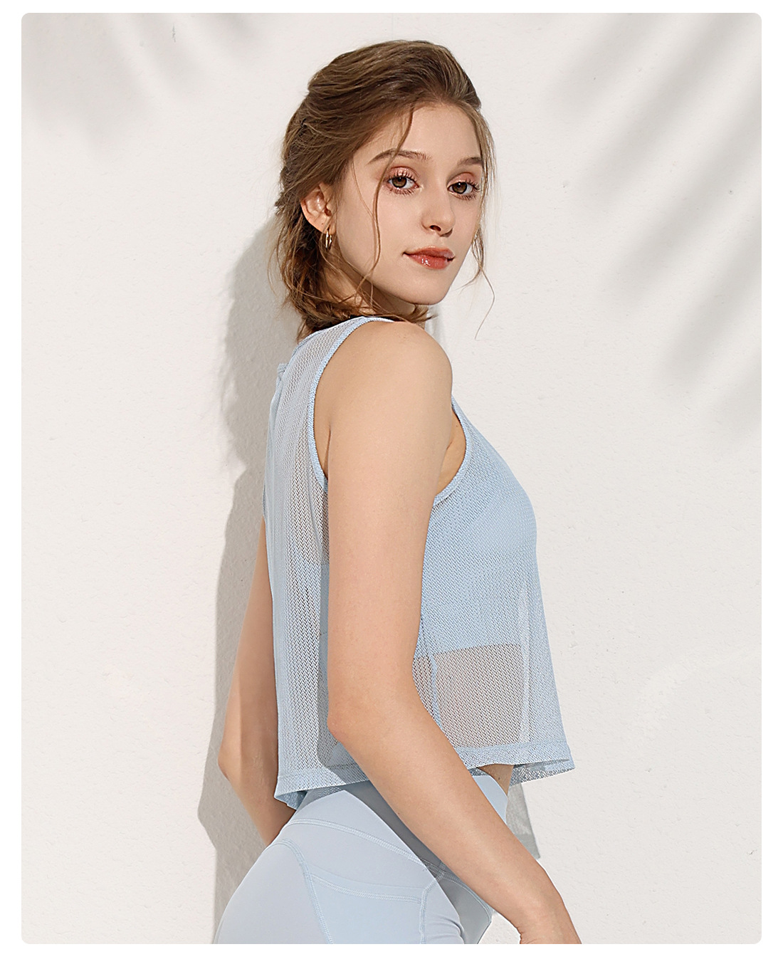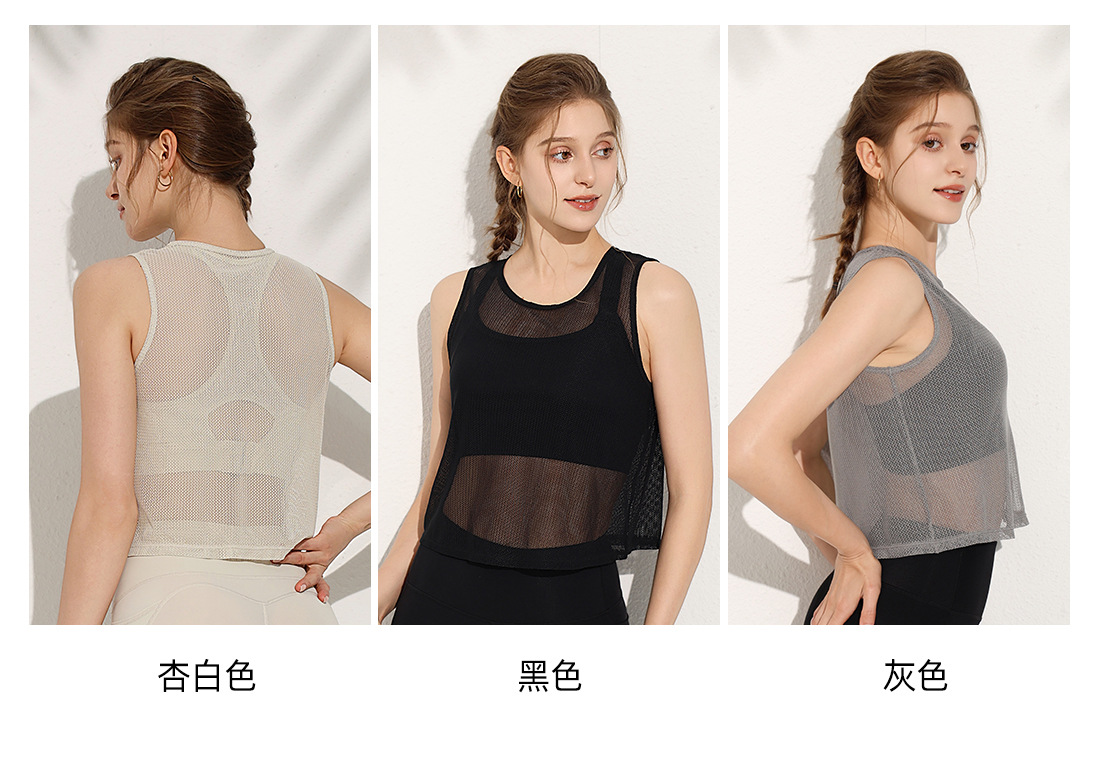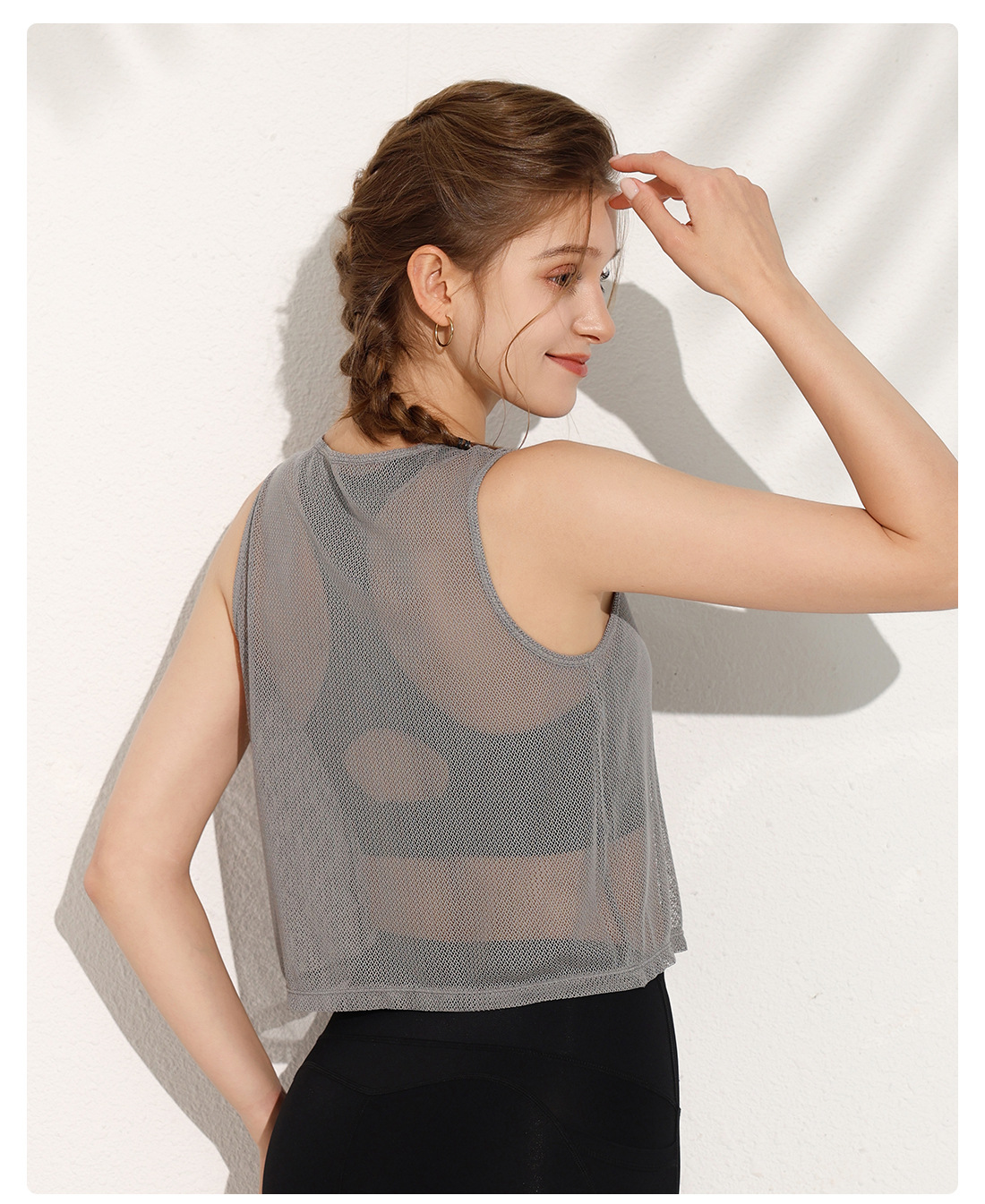 국경 간 새로운 통기성 중공 메쉬 요가 의류 블라우스 여성의 느슨한 민소매 조끼 빠른 건조 스포츠 피트니스 탑