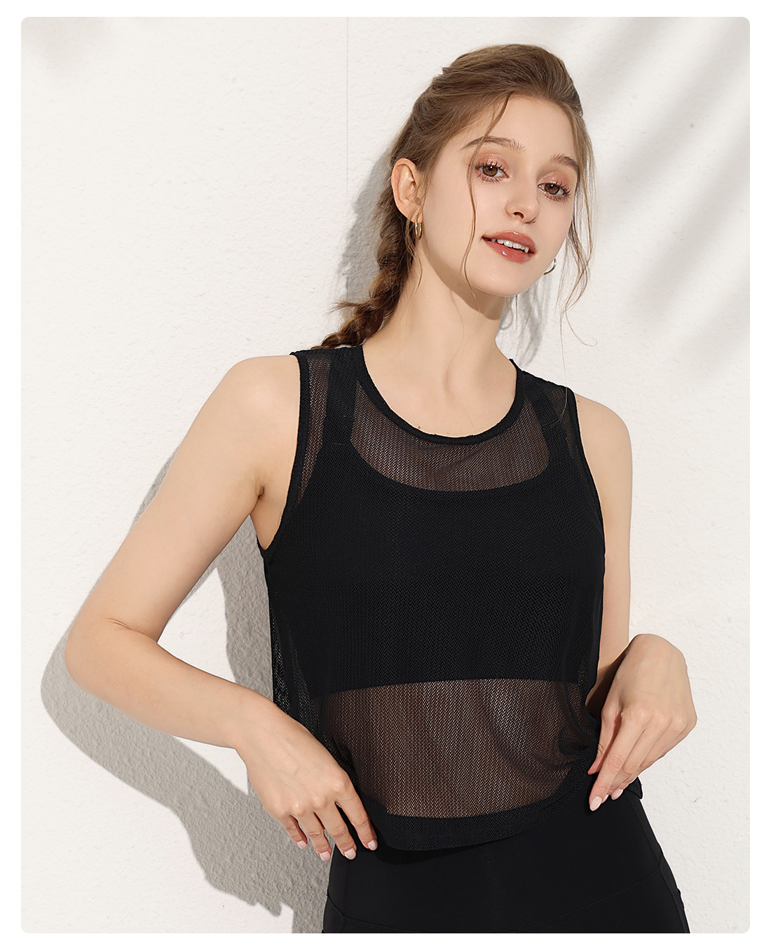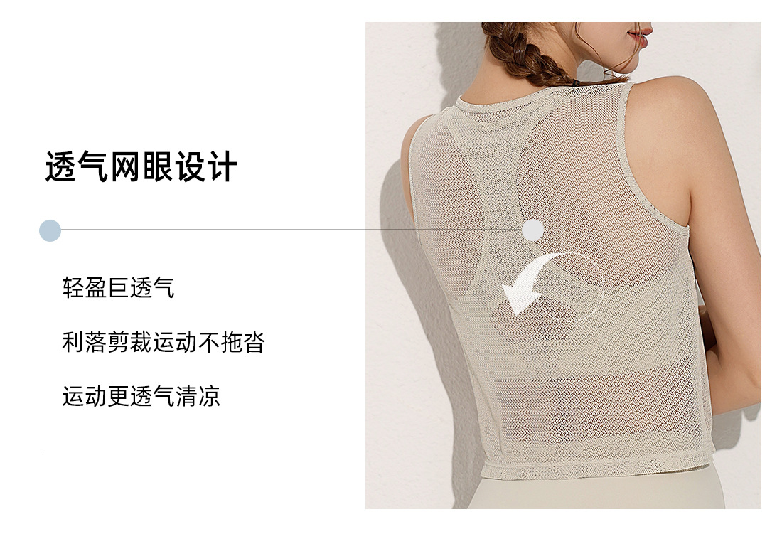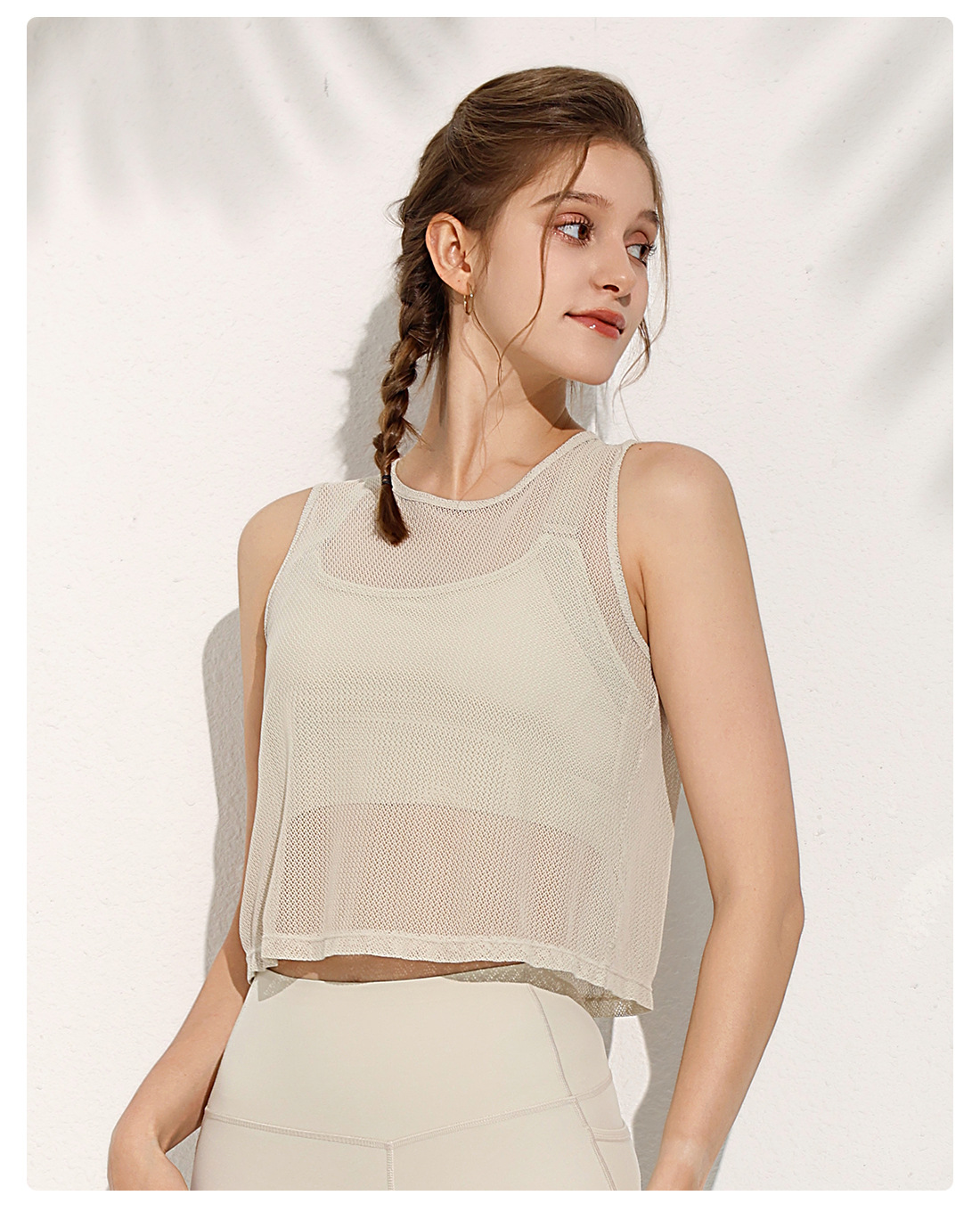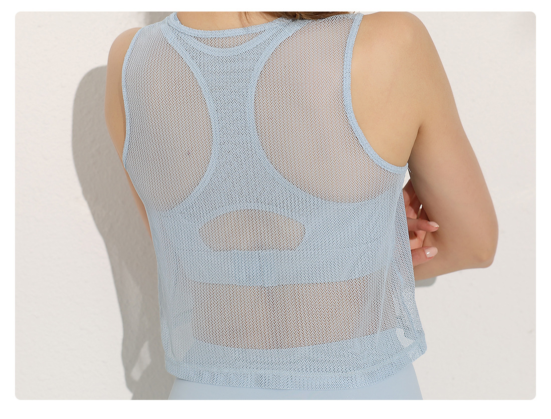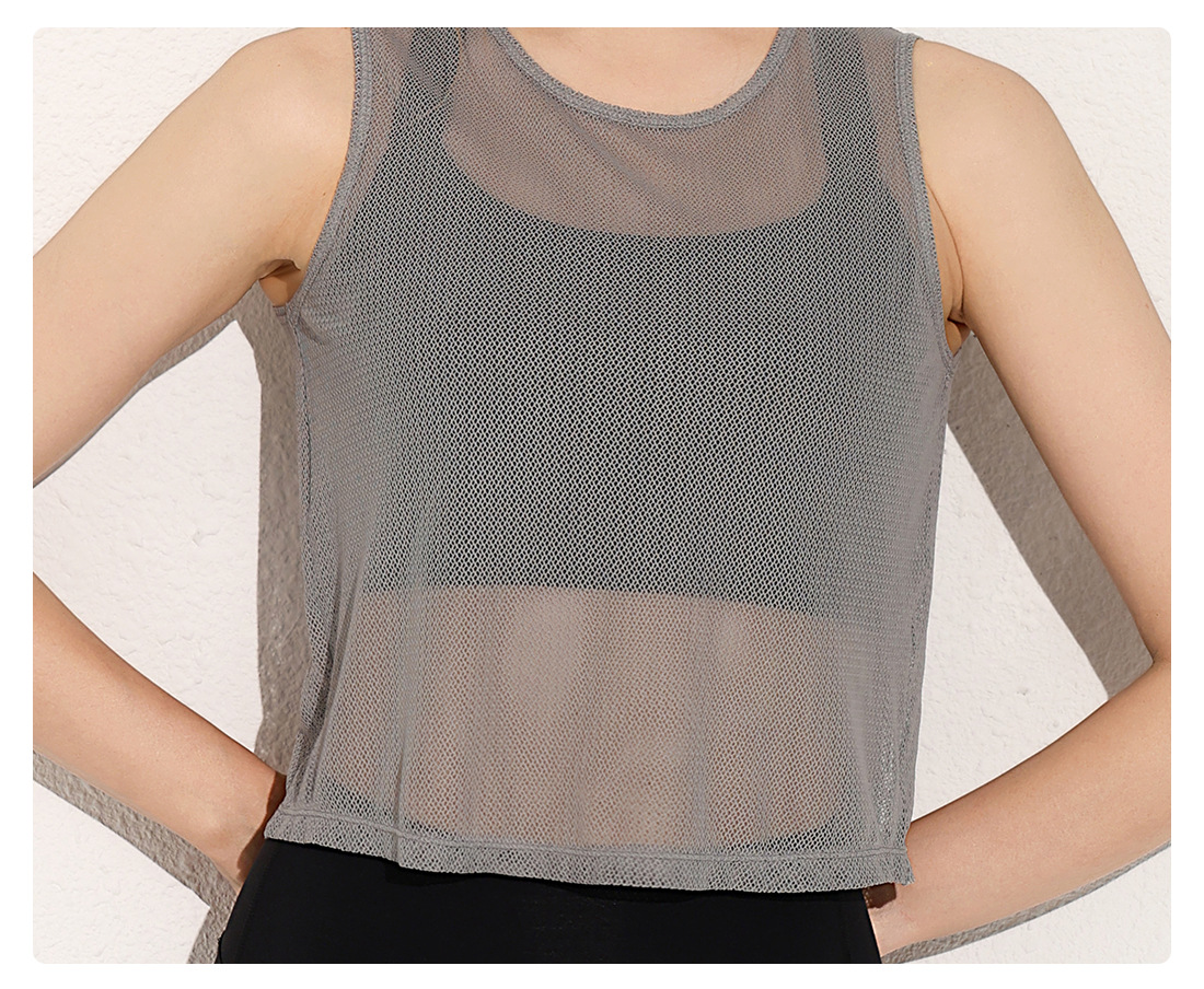 국경 간 새로운 통기성 중공 메쉬 요가 의류 블라우스 여성의 느슨한 민소매 조끼 빠른 건조 스포츠 피트니스 탑