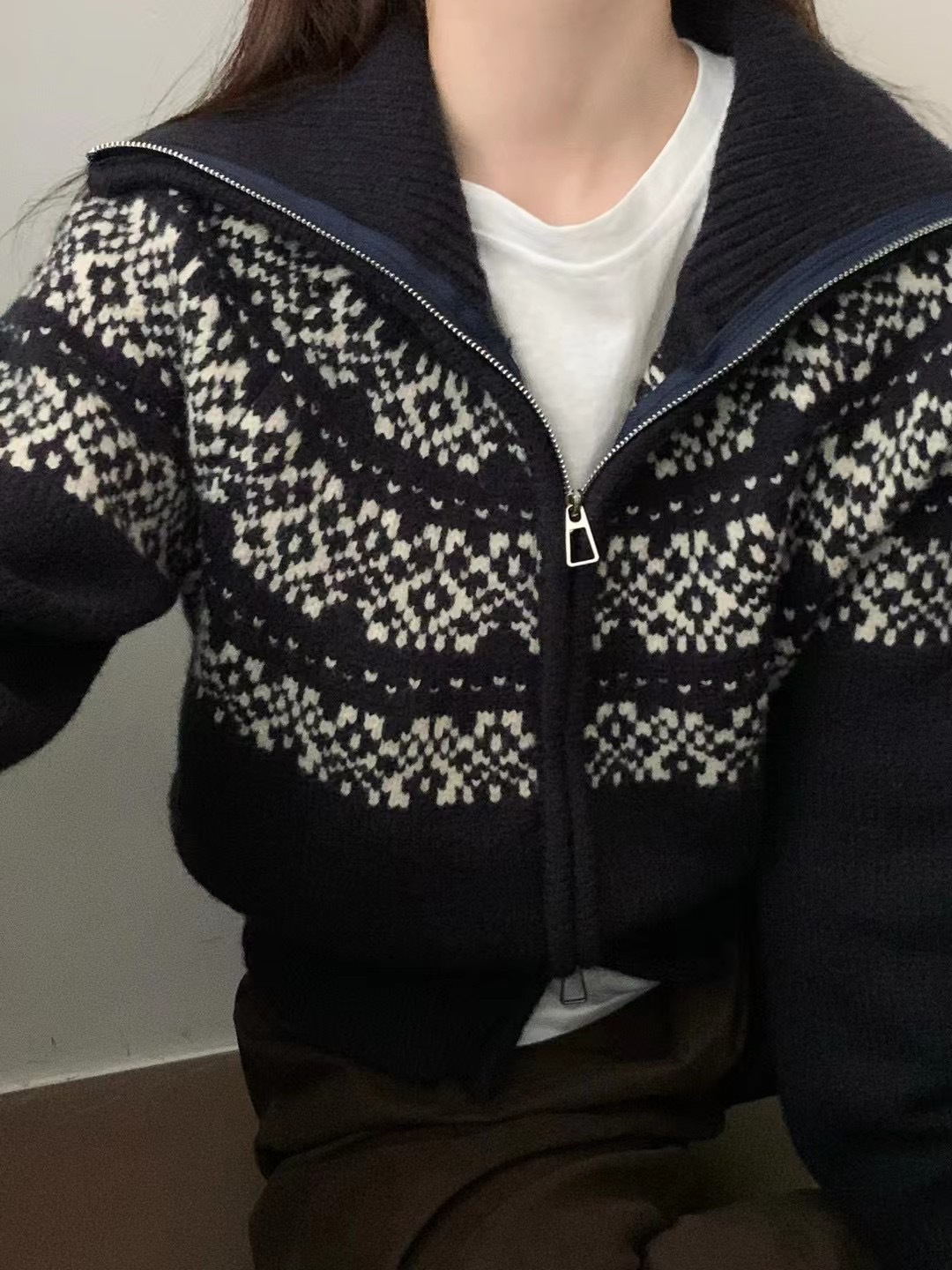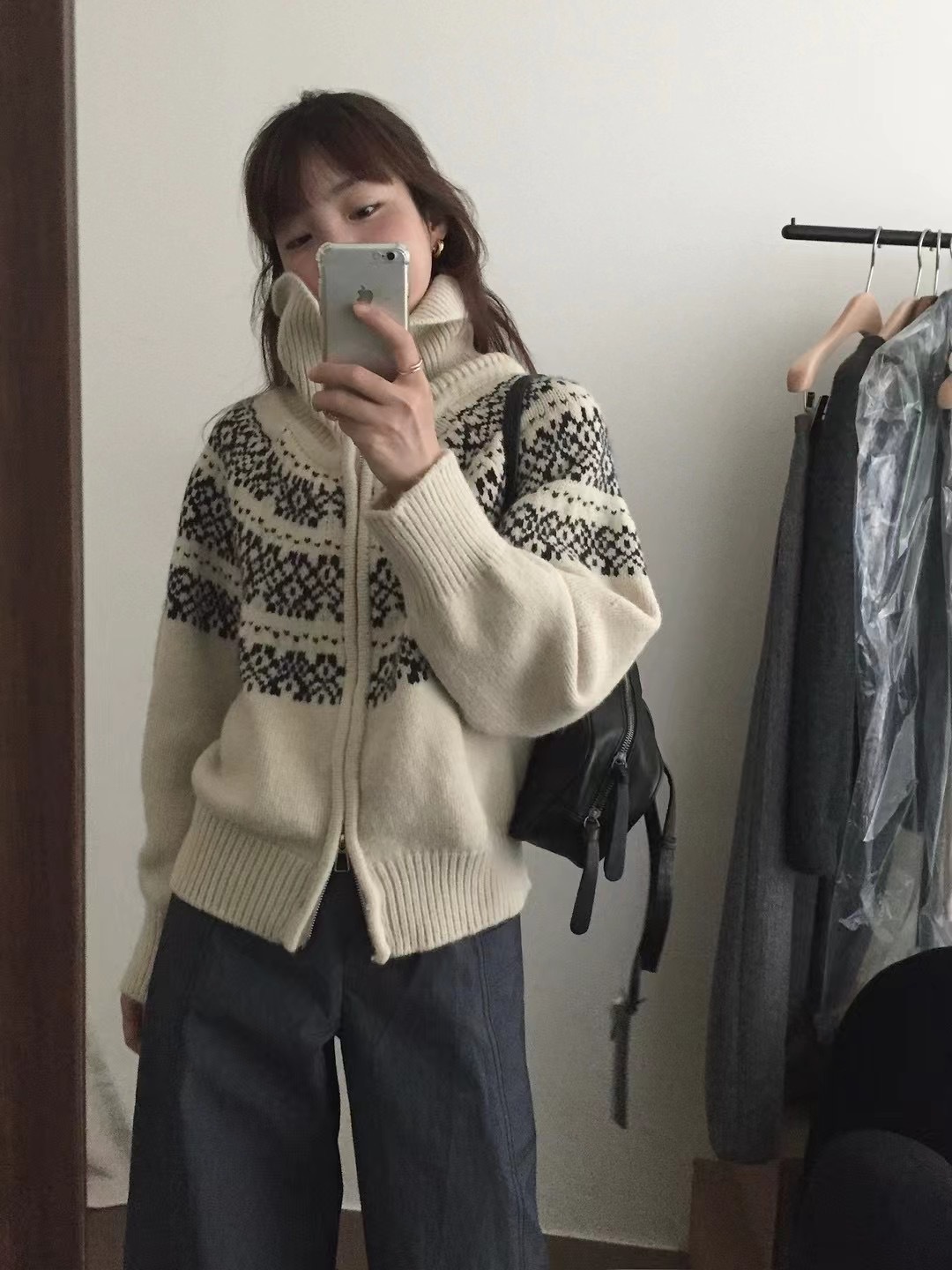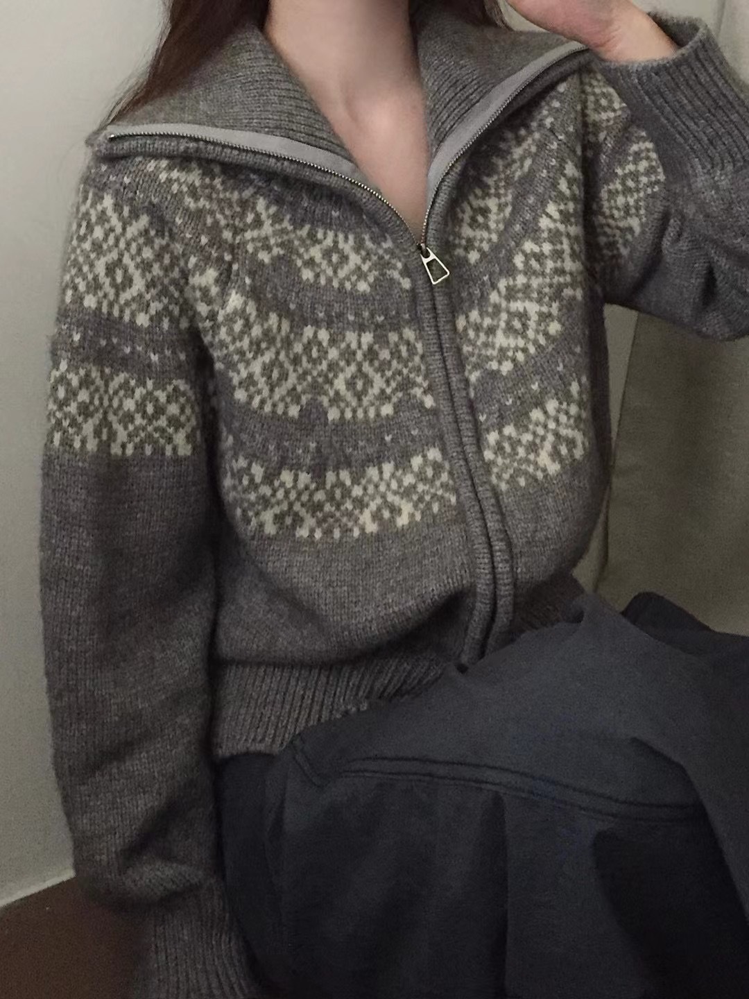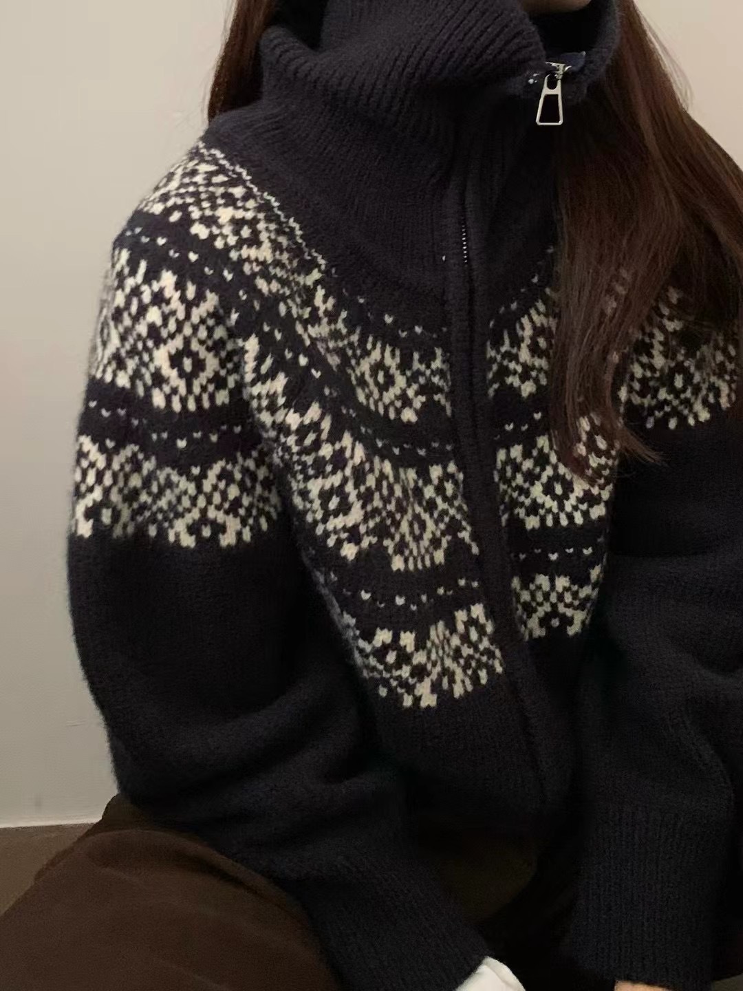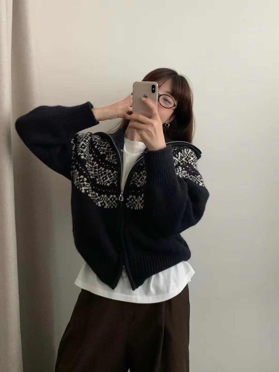예술적 복고풍 스타일 페어아일랜드 자카드 니트 카디건 여성 가을과 겨울 새로운 느슨한 지퍼 스웨터 재킷 트렌디 494