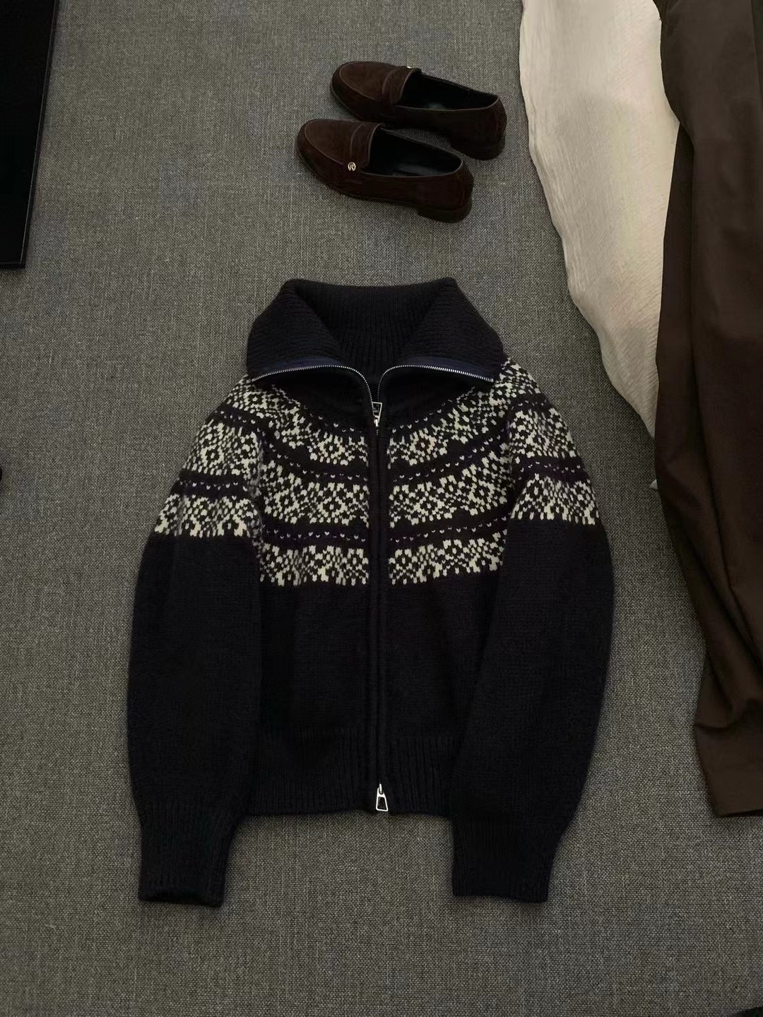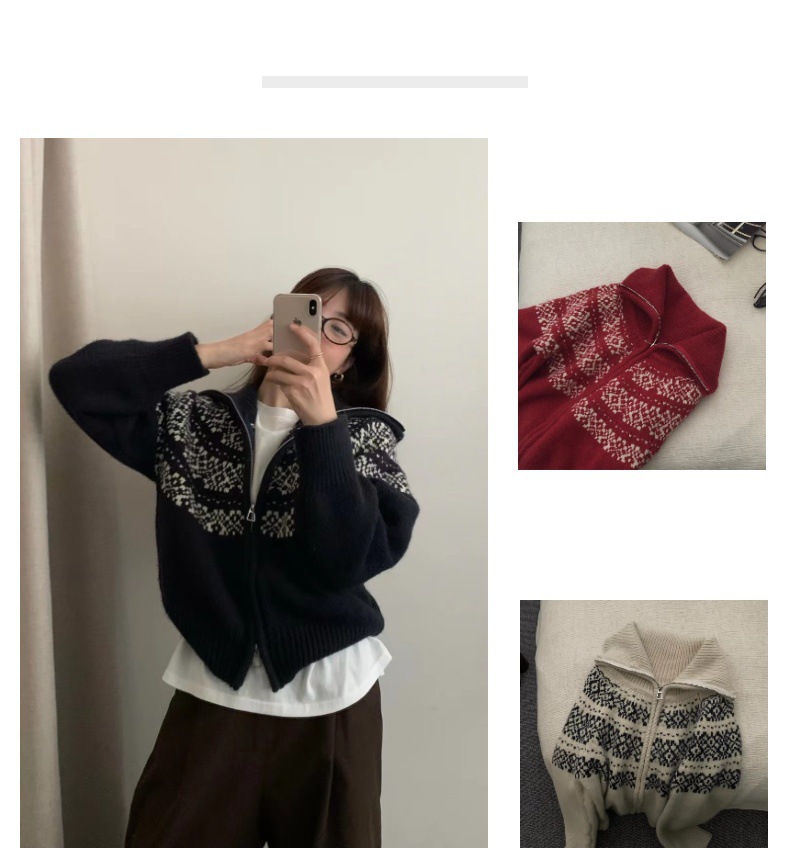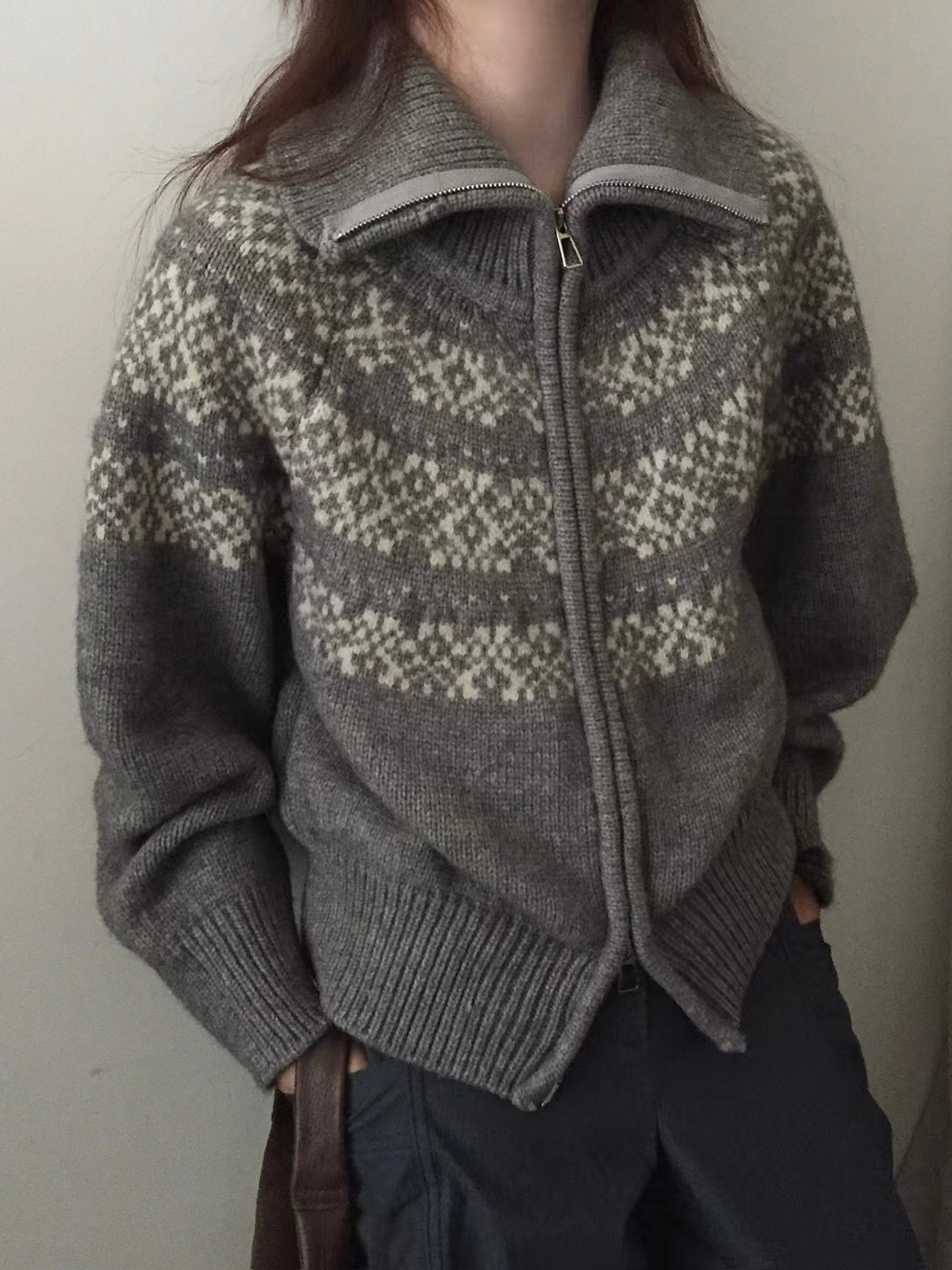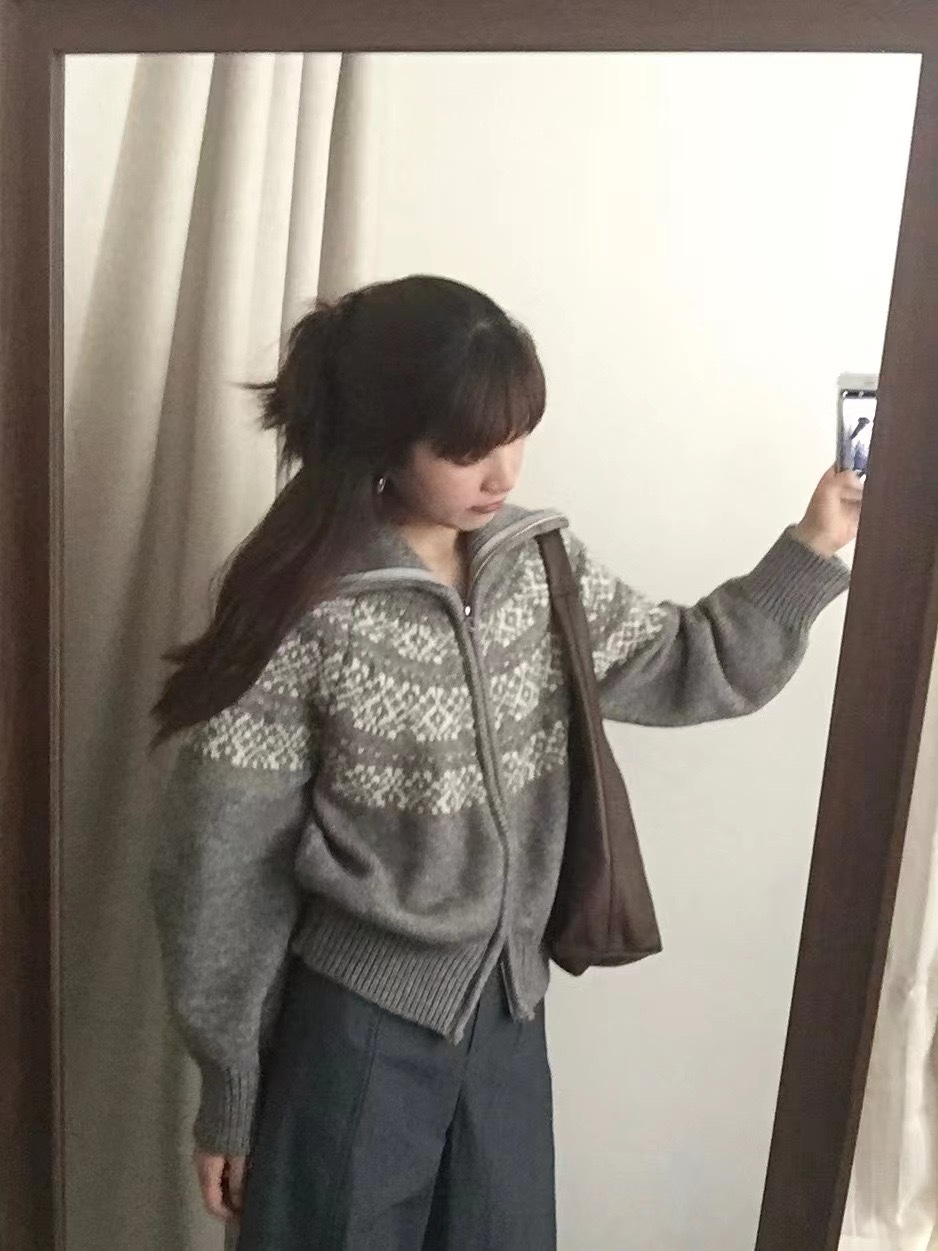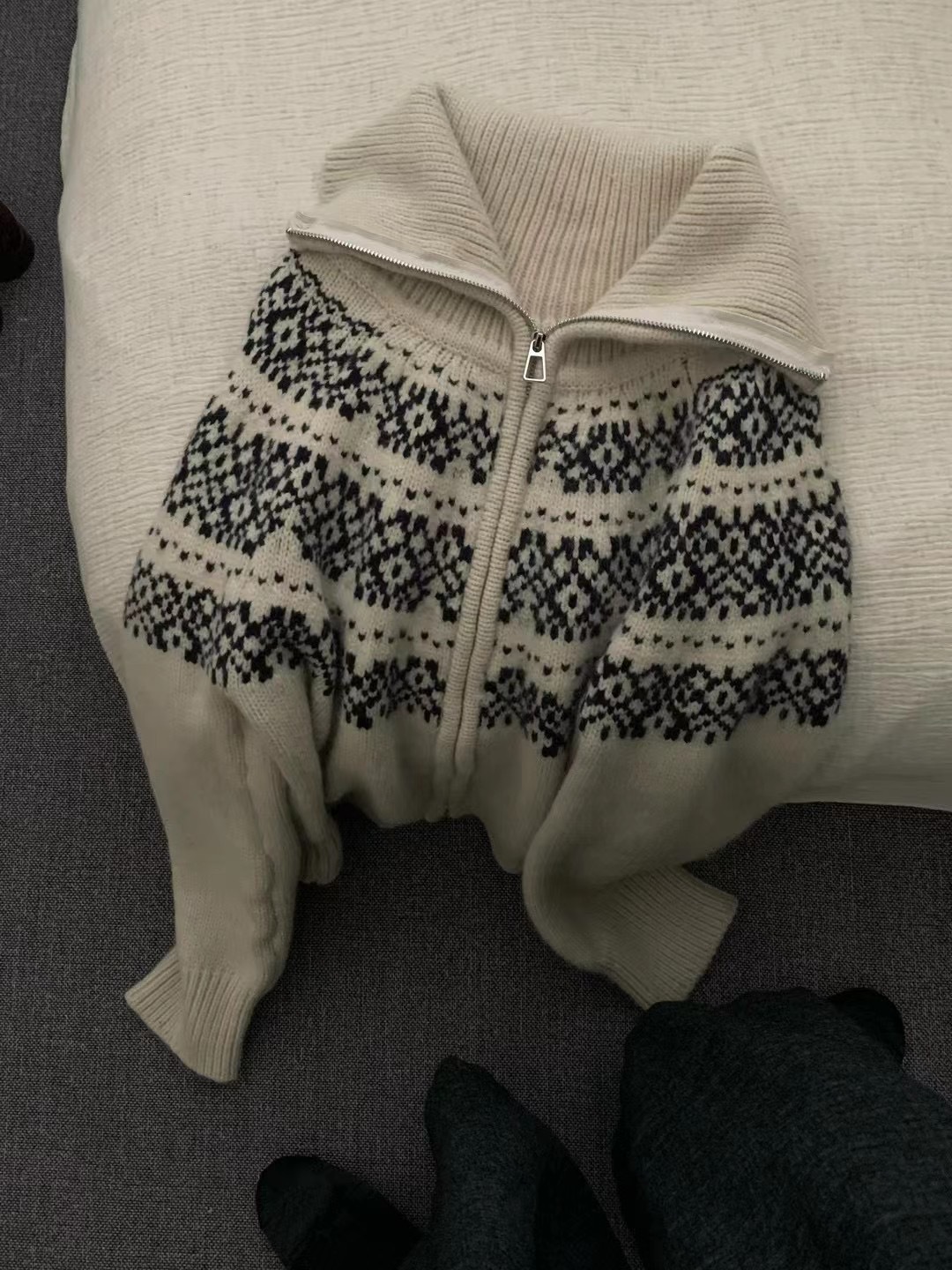 예술적 복고풍 스타일 페어아일랜드 자카드 니트 카디건 여성 가을과 겨울 새로운 느슨한 지퍼 스웨터 재킷 트렌디 494