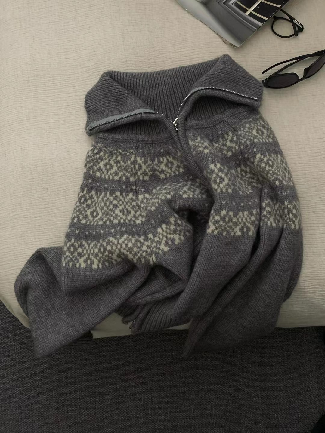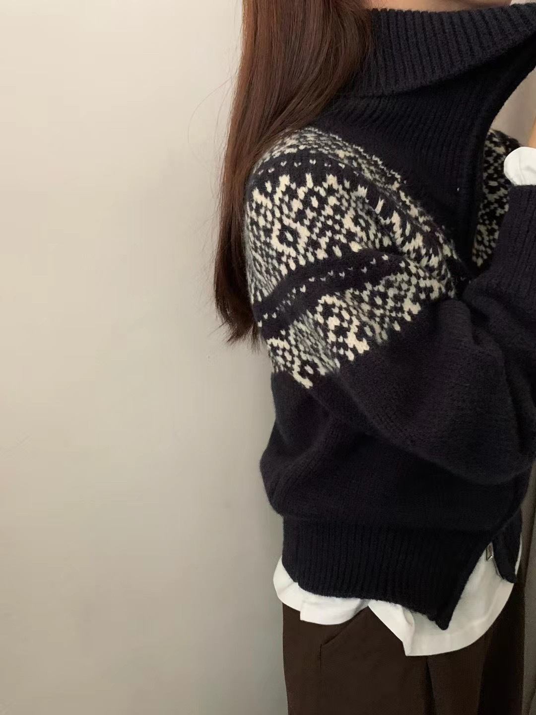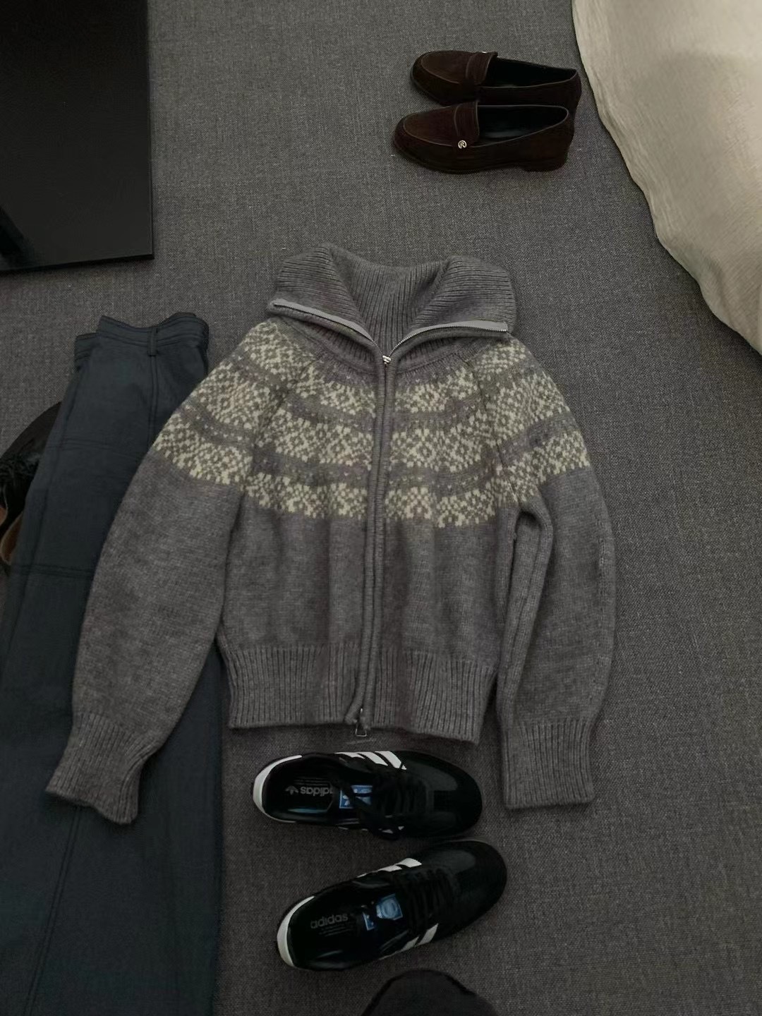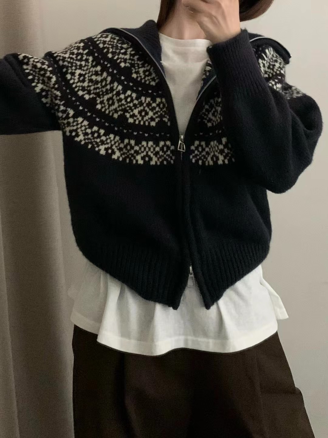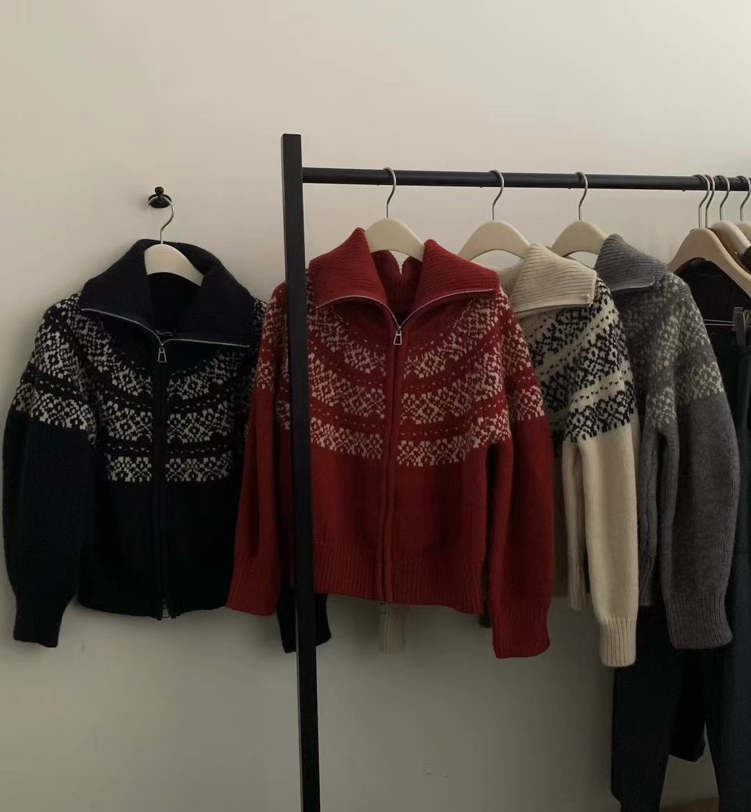 예술적 복고풍 스타일 페어아일랜드 자카드 니트 카디건 여성 가을과 겨울 새로운 느슨한 지퍼 스웨터 재킷 트렌디 494