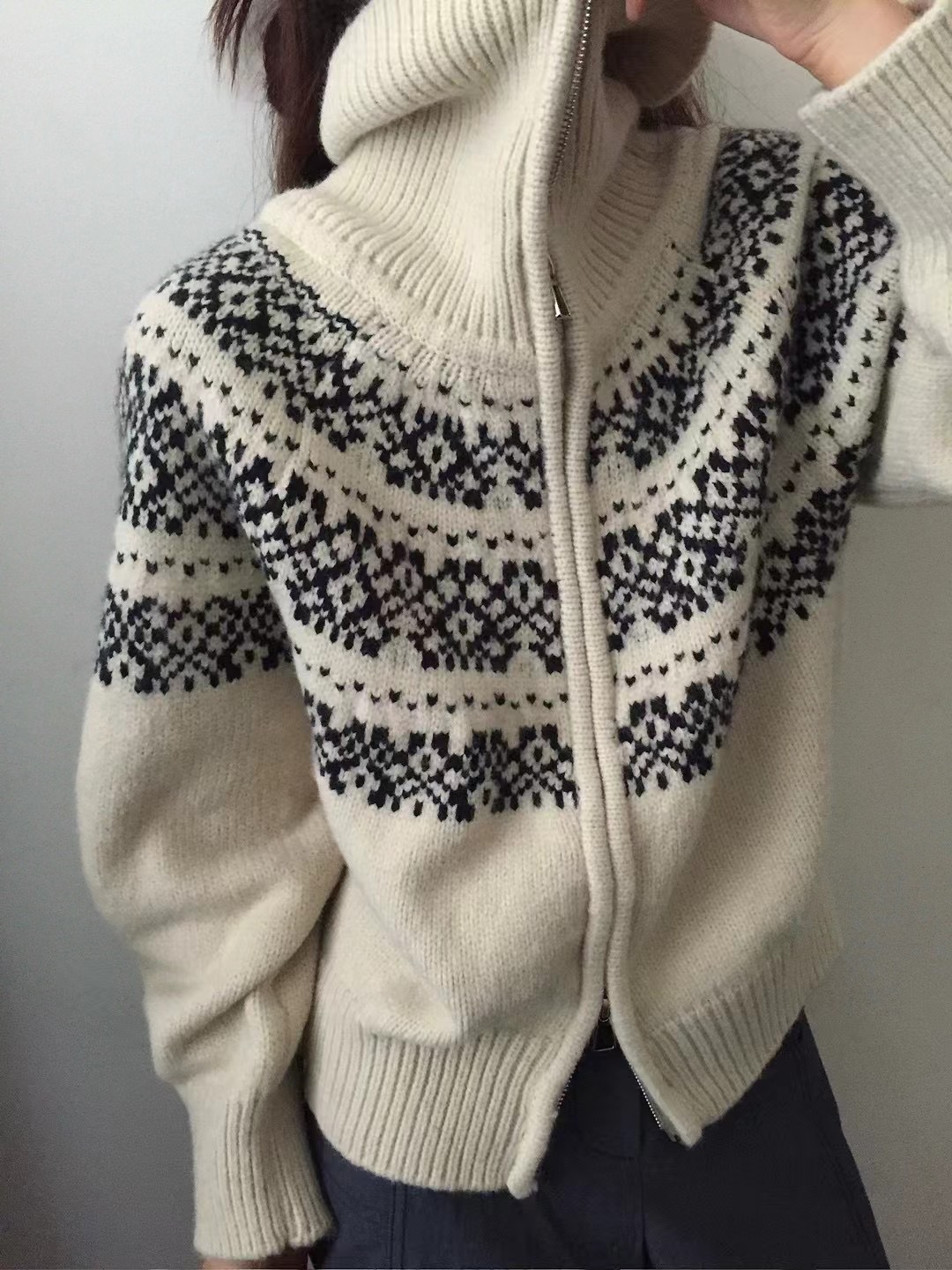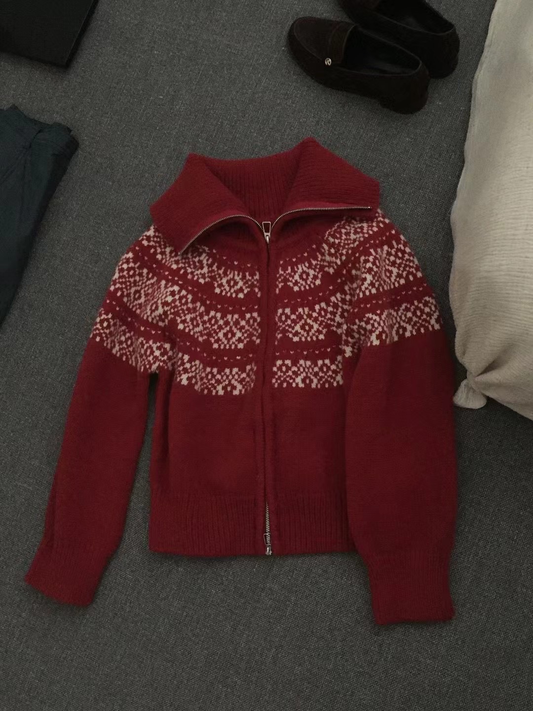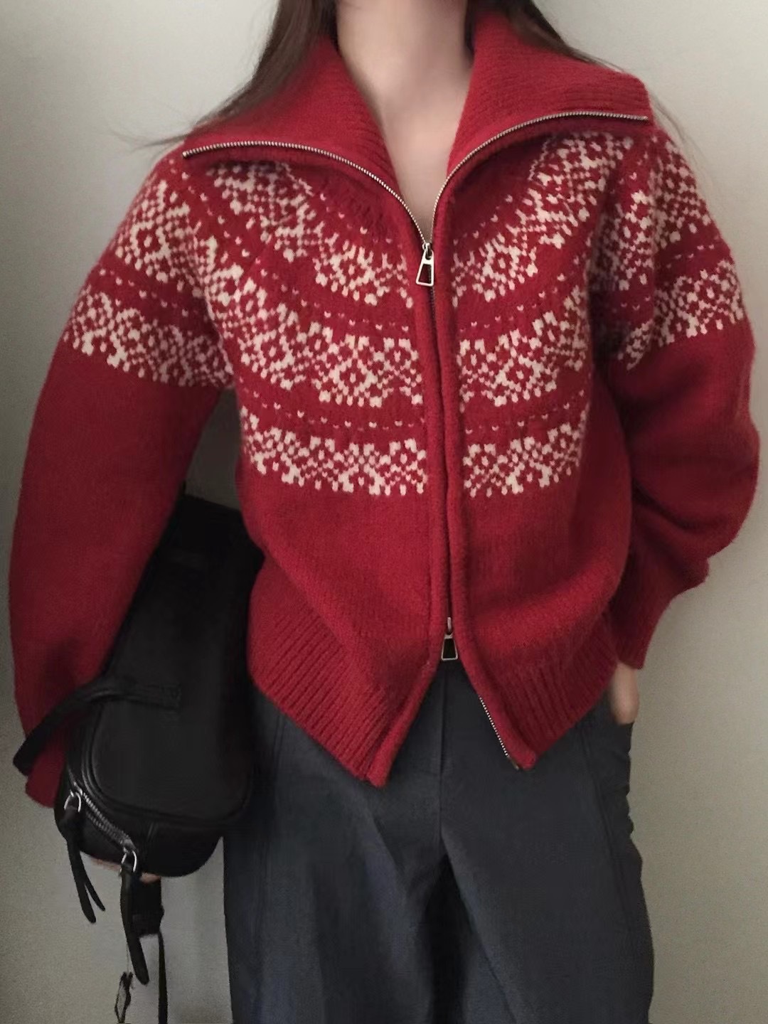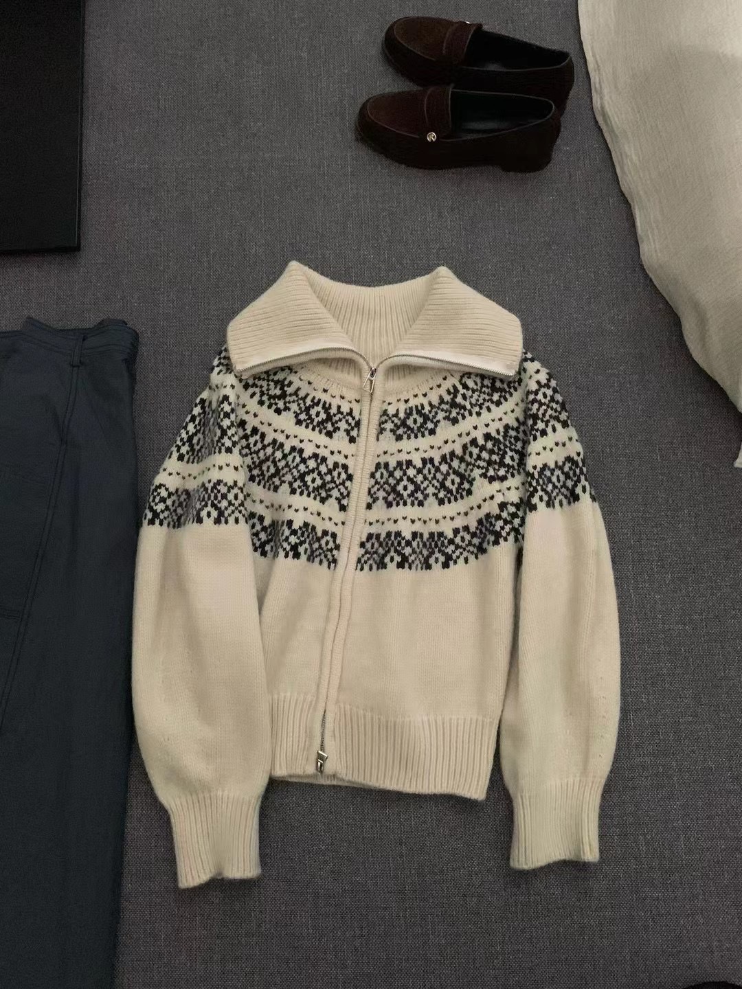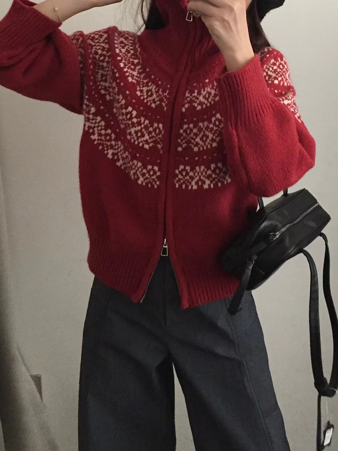 예술적 복고풍 스타일 페어아일랜드 자카드 니트 카디건 여성 가을과 겨울 새로운 느슨한 지퍼 스웨터 재킷 트렌디 494