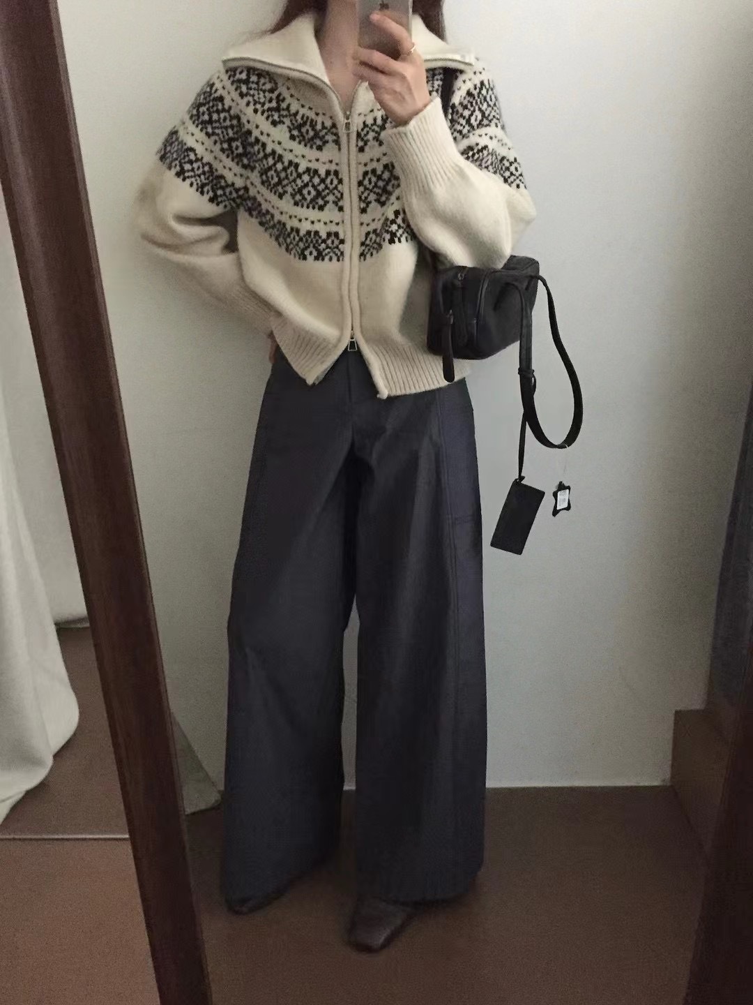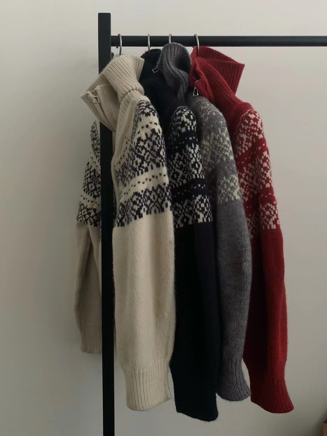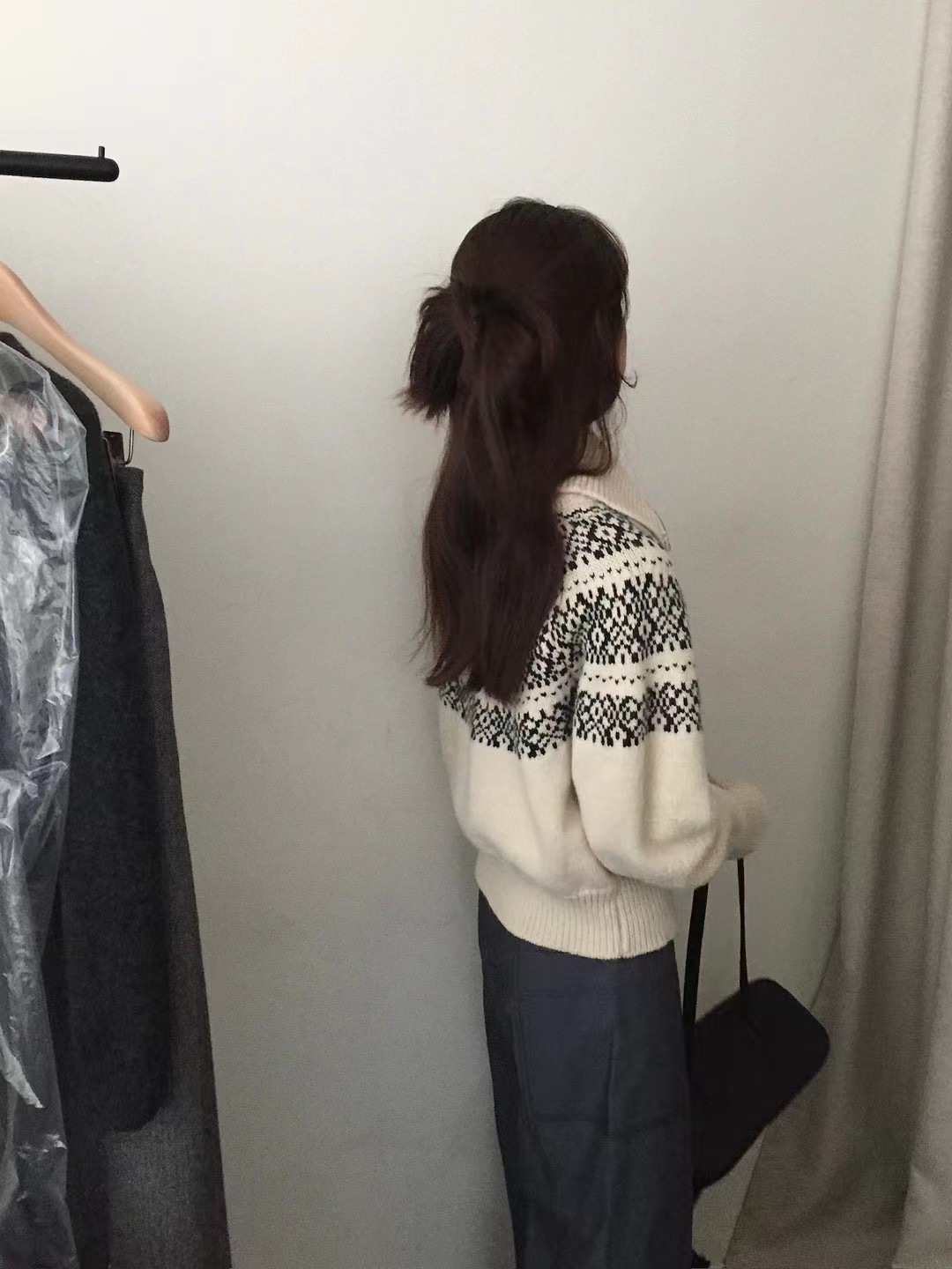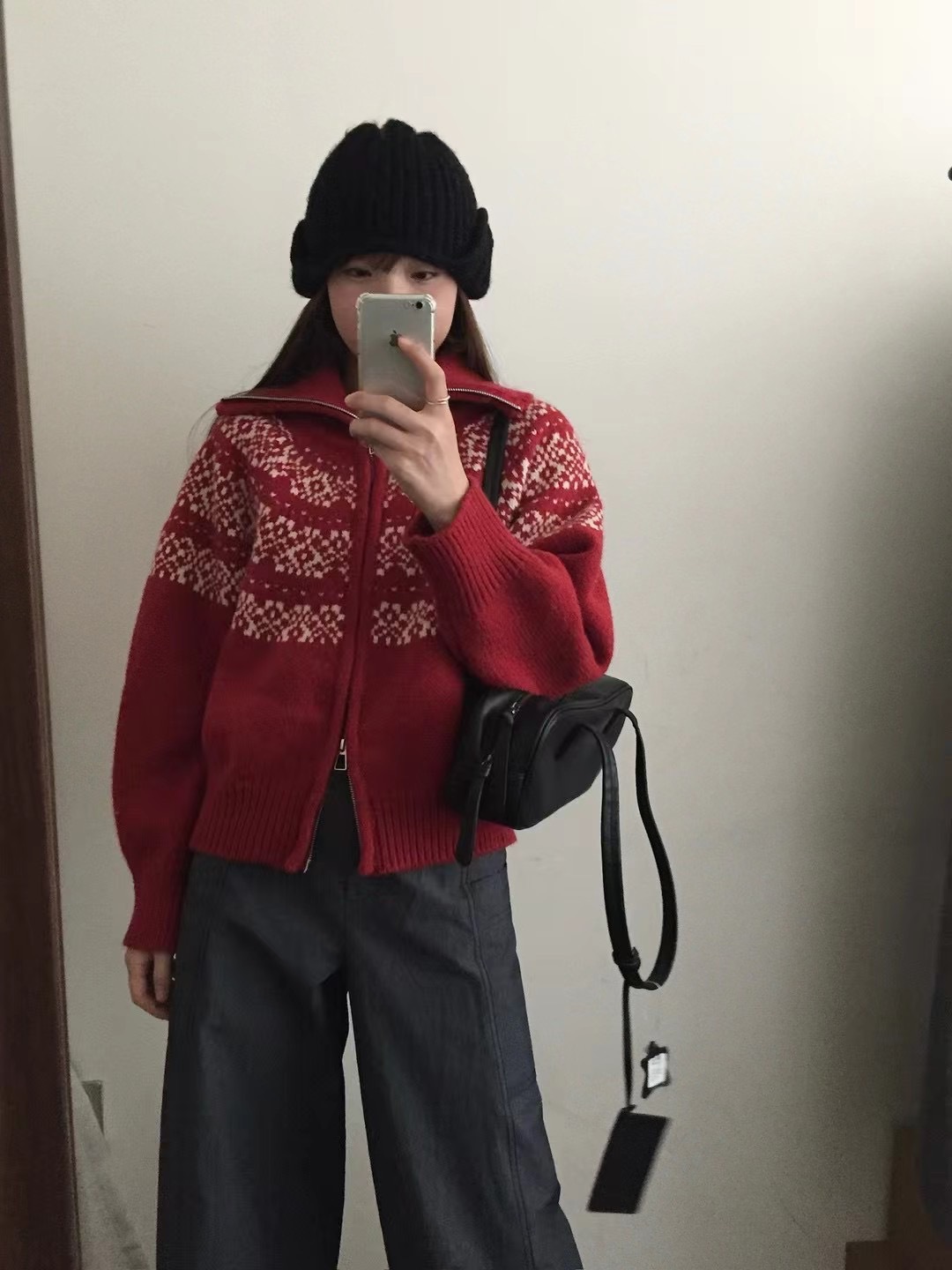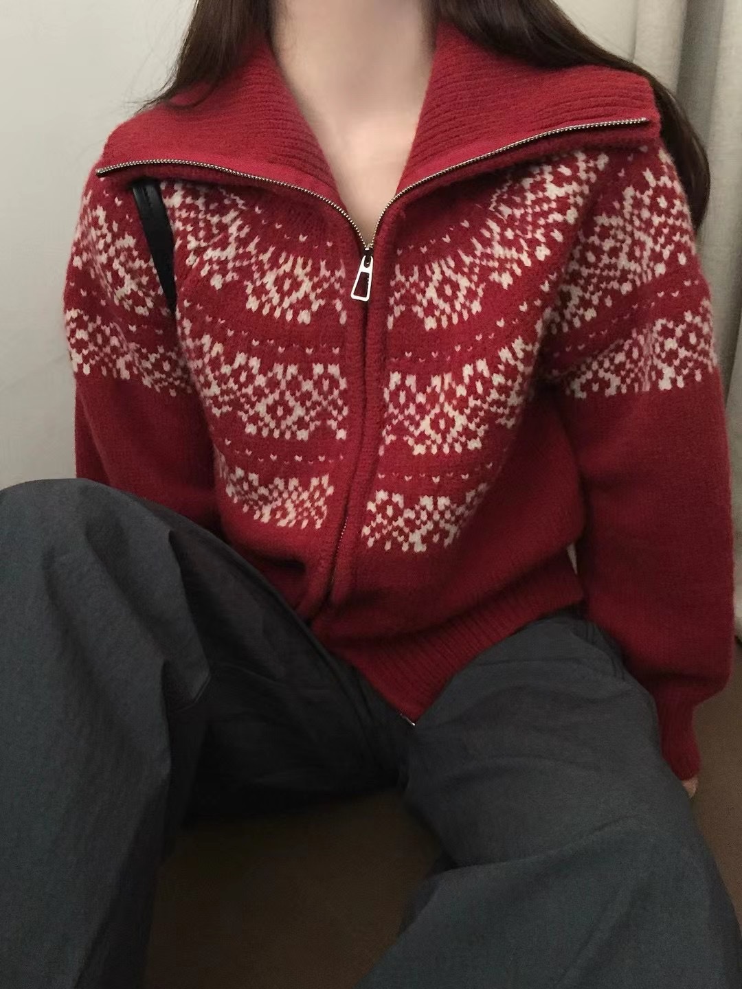 예술적 복고풍 스타일 페어아일랜드 자카드 니트 카디건 여성 가을과 겨울 새로운 느슨한 지퍼 스웨터 재킷 트렌디 494