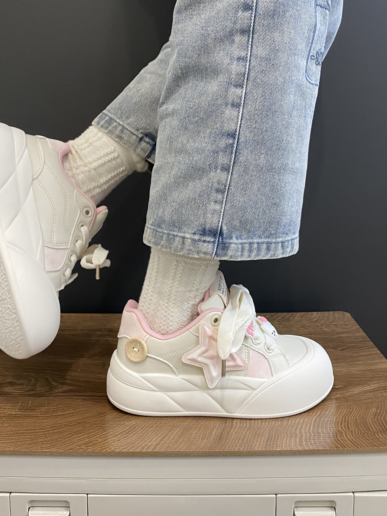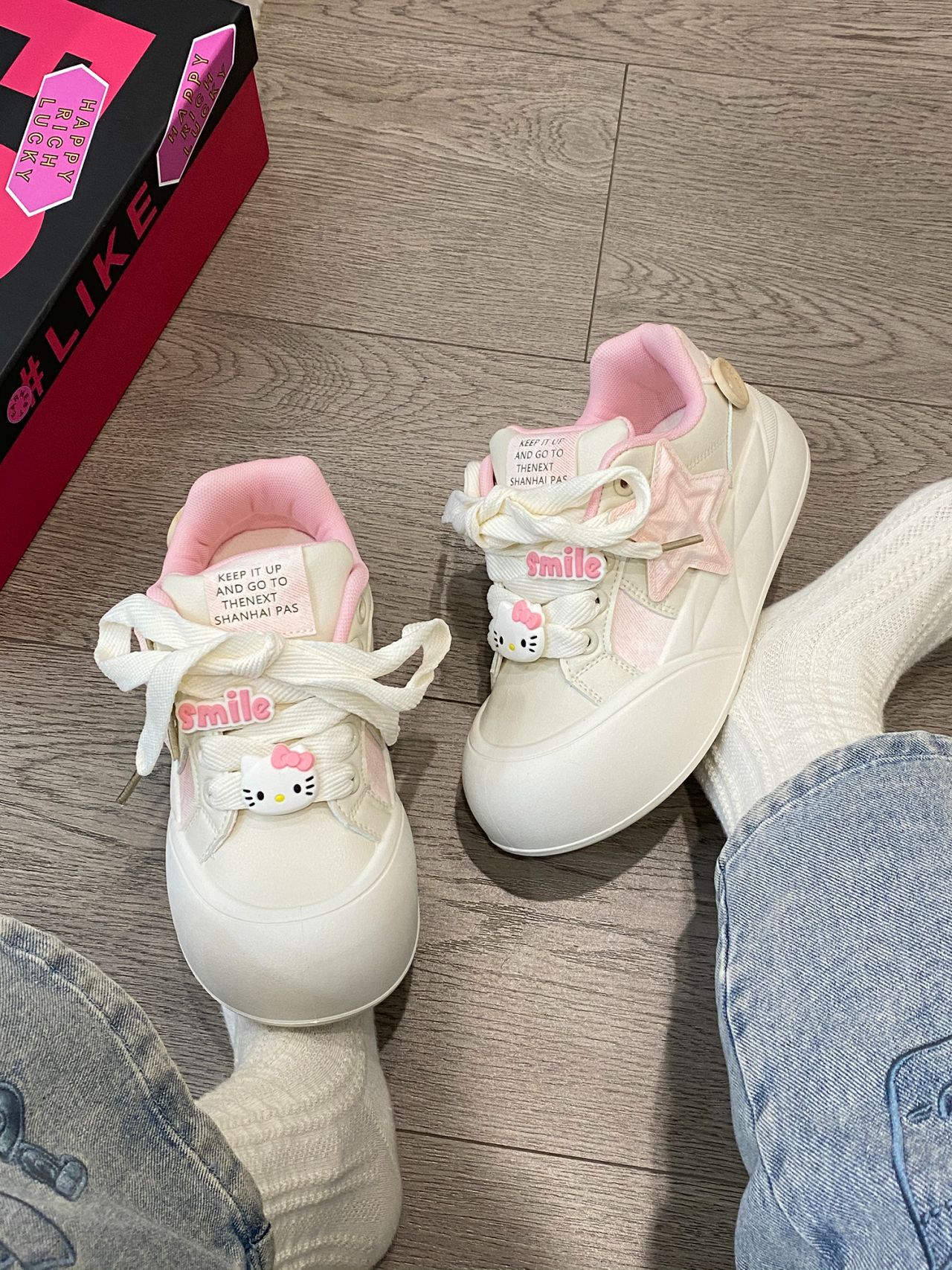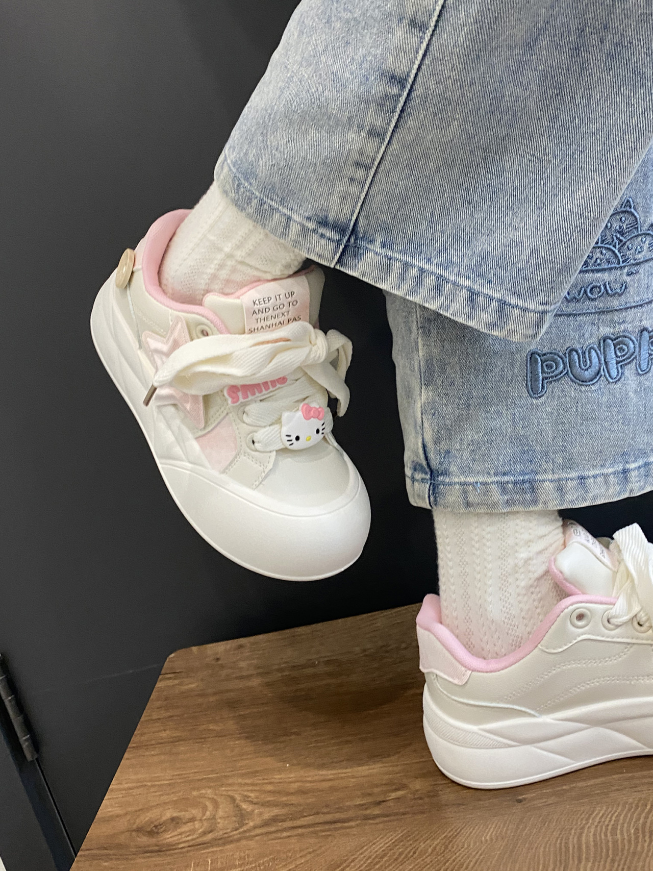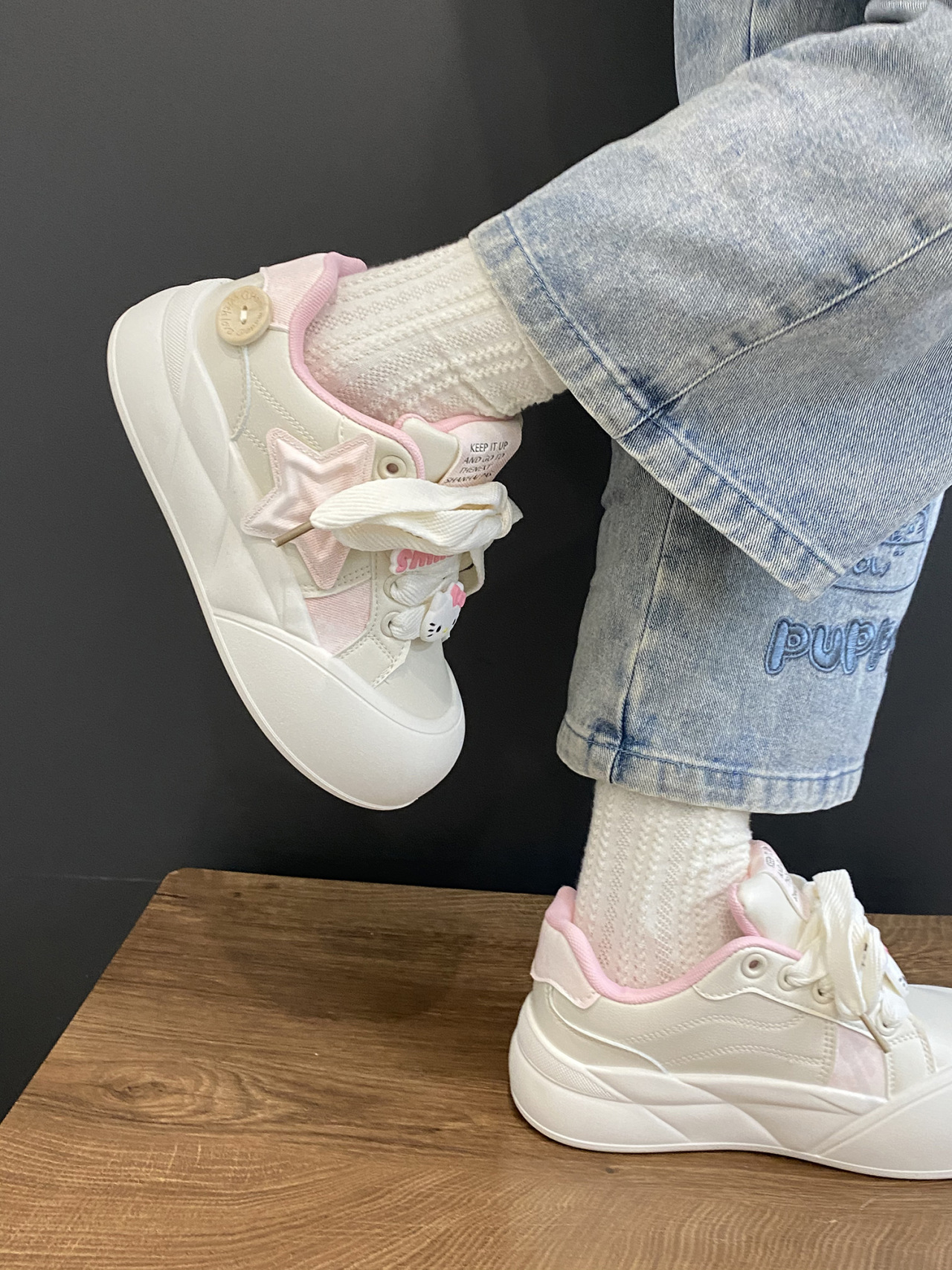 트렌디하고 귀여운 Kt 고양이 흰색 신발 여성용 세련된 홍콩 스타일 캐주얼 신발 여성을위한 모든 경기 두꺼운 슬라브 신발스토어 가기