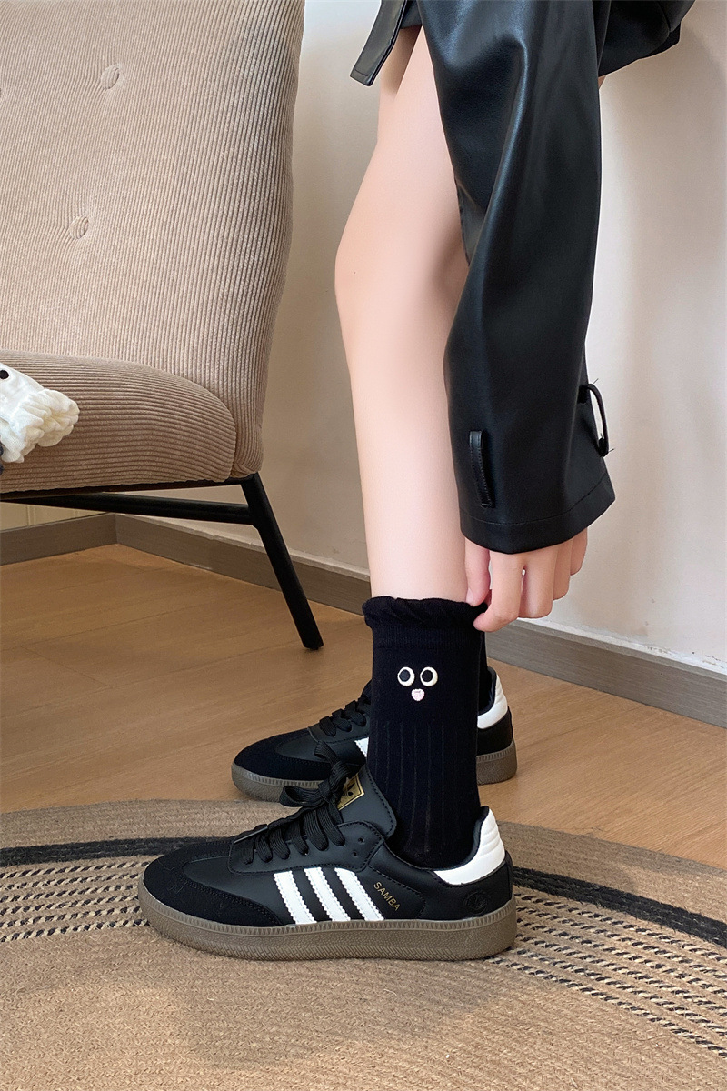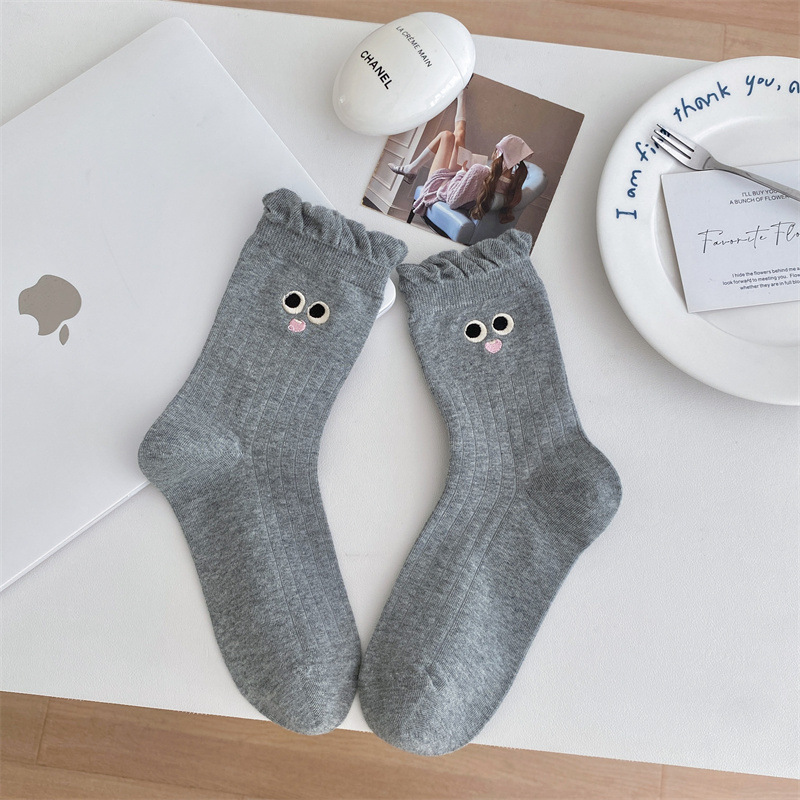 귀여운 만화 큰 눈 수 놓은 양말 여성용 중간 길이 양말 Ins 유행 거품 입 편성 코튼 일본식 봄과 가을 스타킹