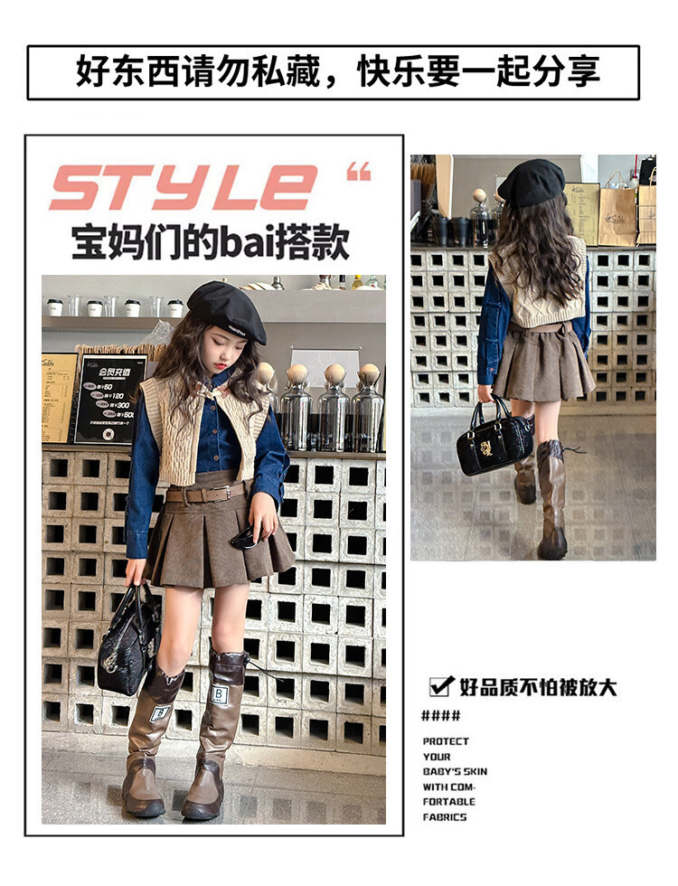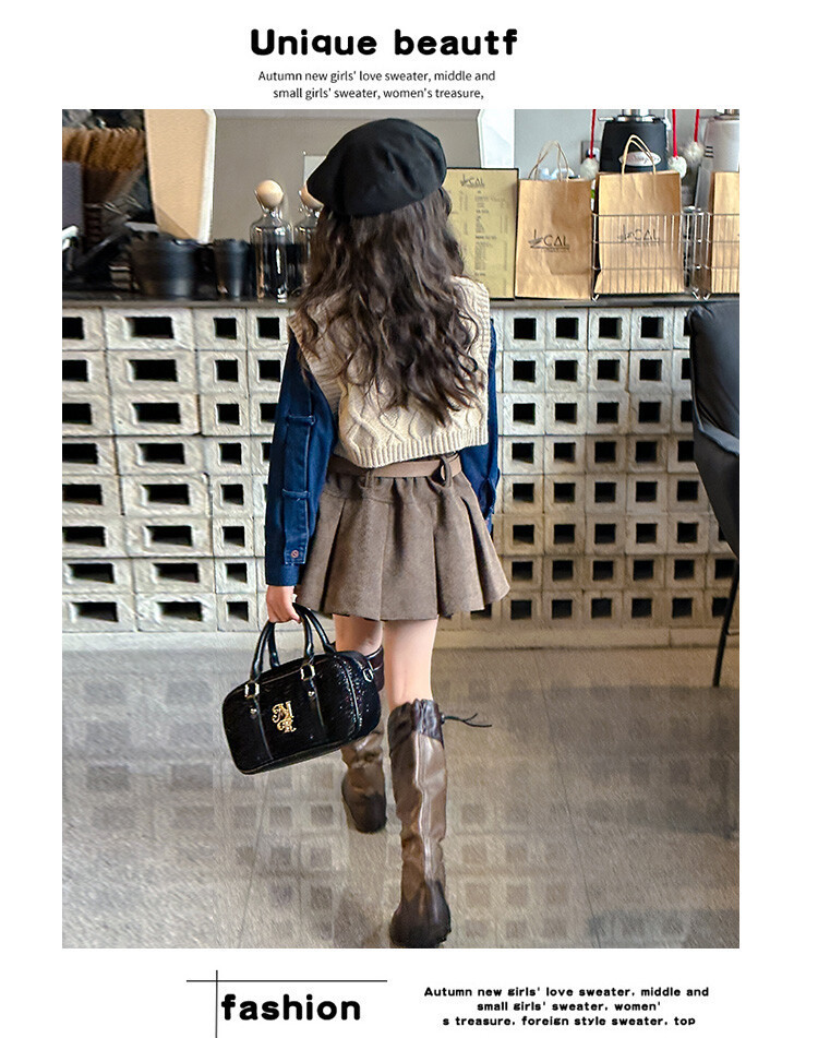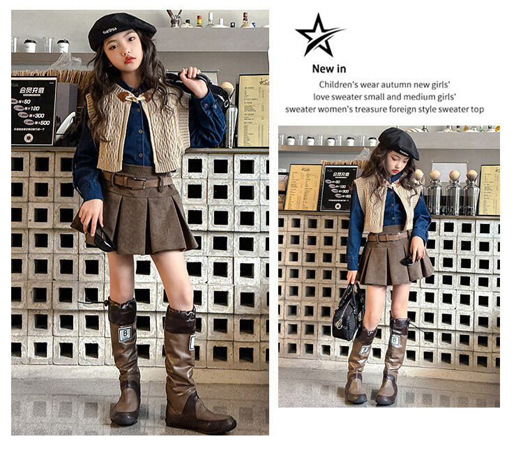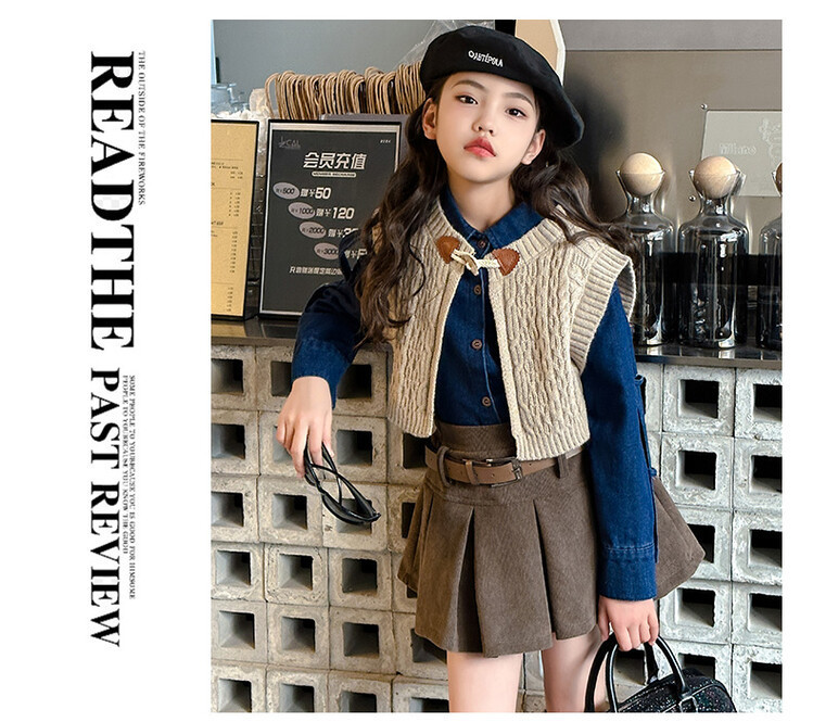 여자 세트 봄 가을 의상 한국 캐주얼 소녀 데님 셔츠 반쪽 치마 달콤한 쿨 스웨터 조끼 3 종 세트스토어 가기
