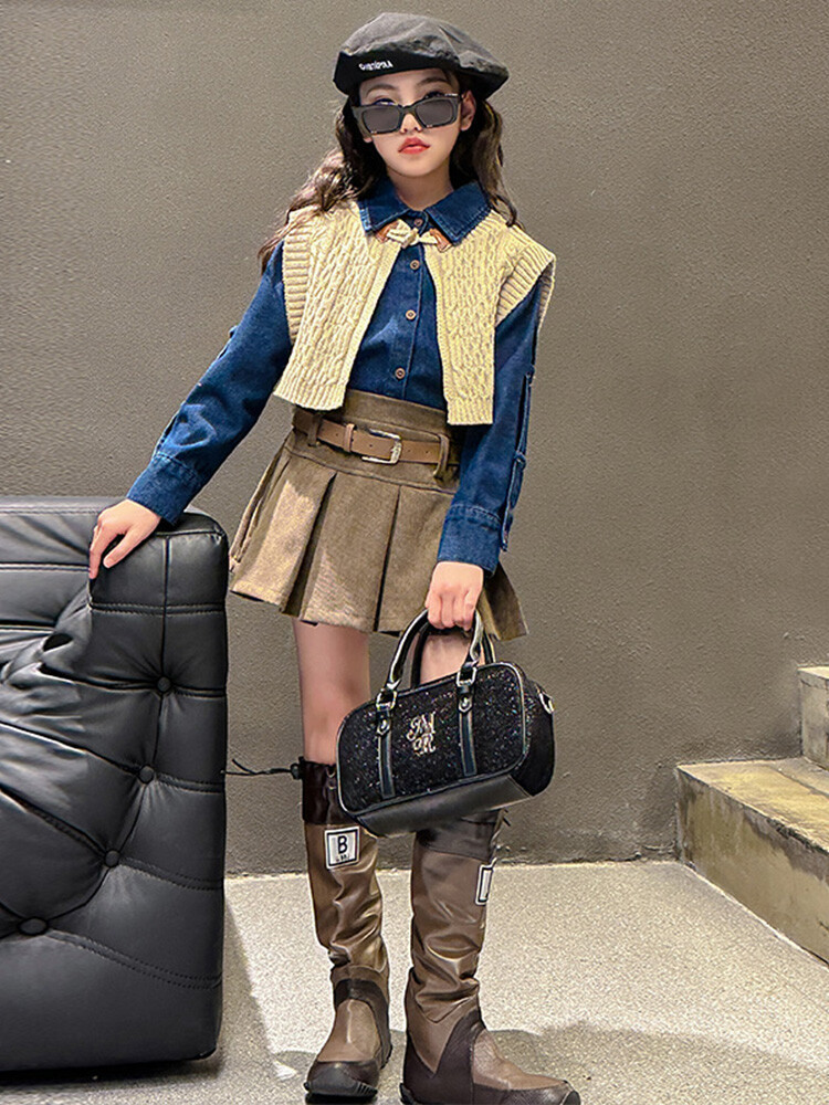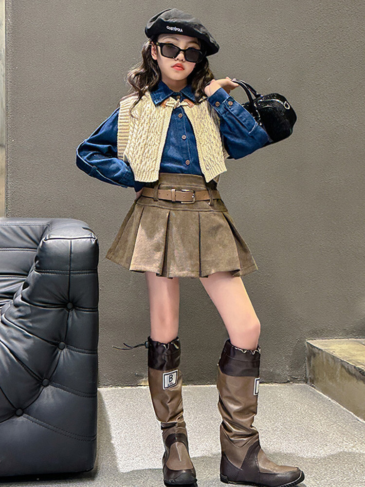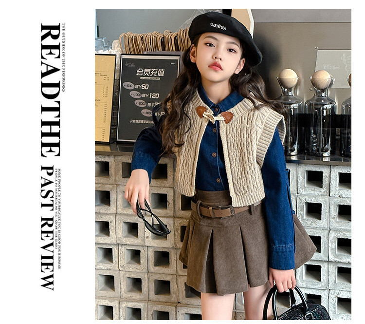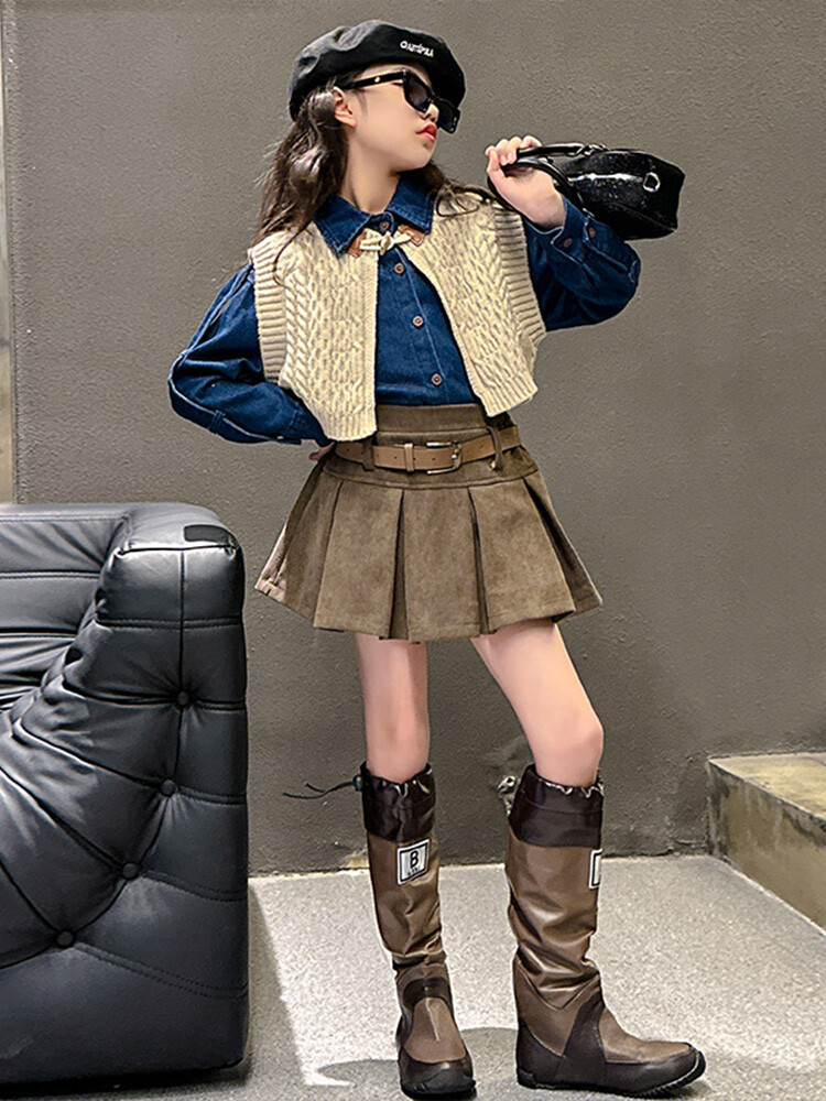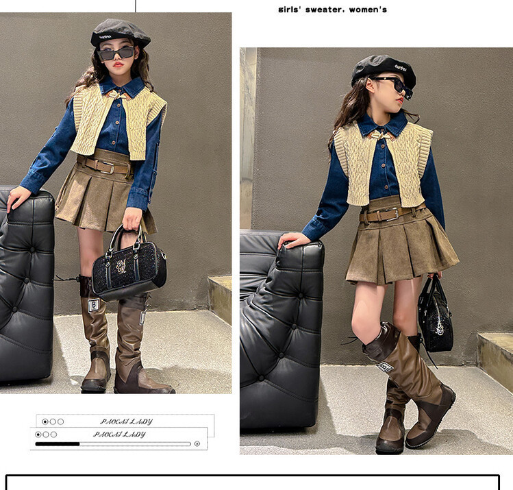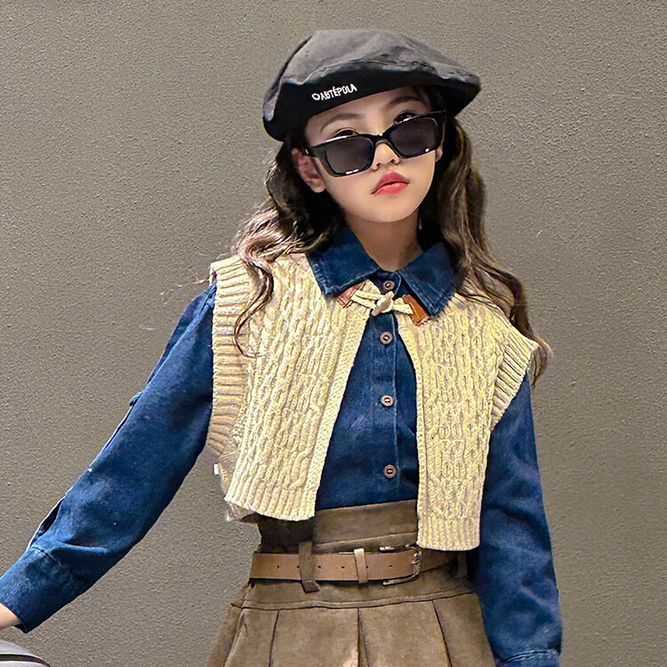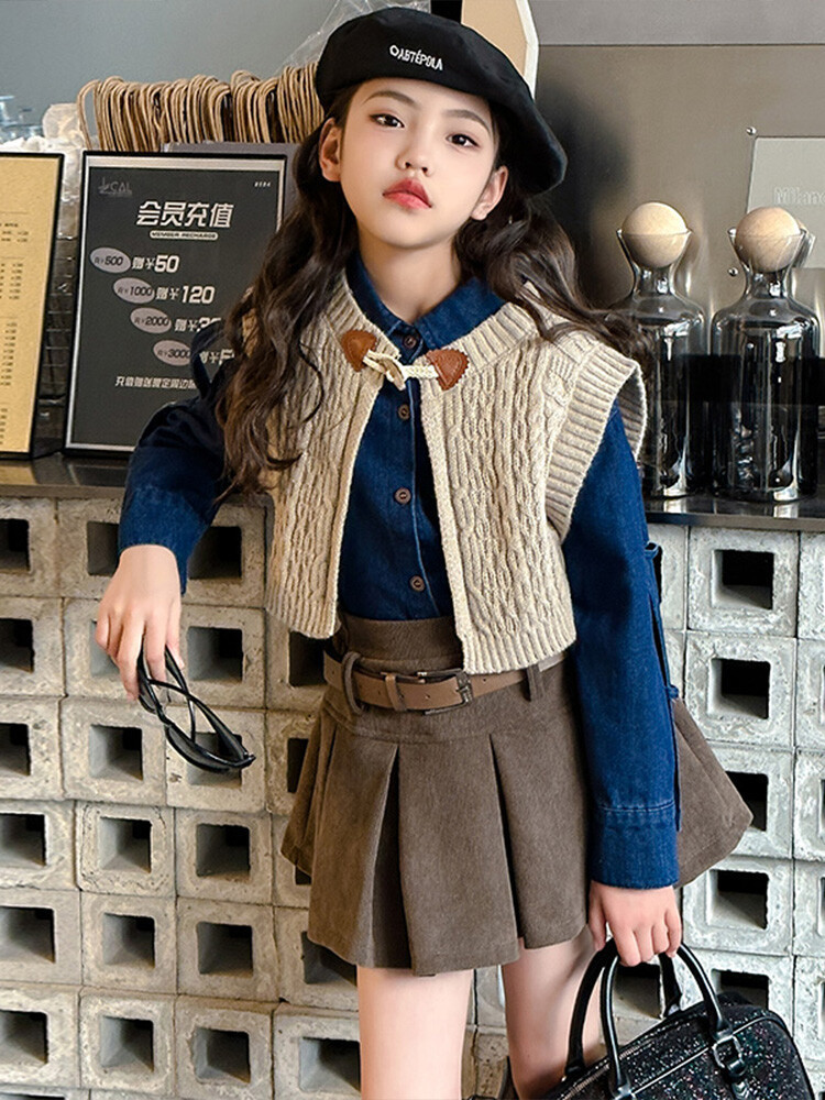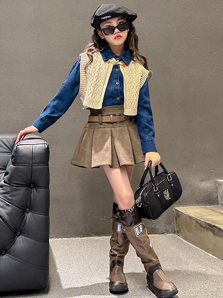 여자 세트 봄 가을 의상 한국 캐주얼 소녀 데님 셔츠 반쪽 치마 달콤한 쿨 스웨터 조끼 3 종 세트