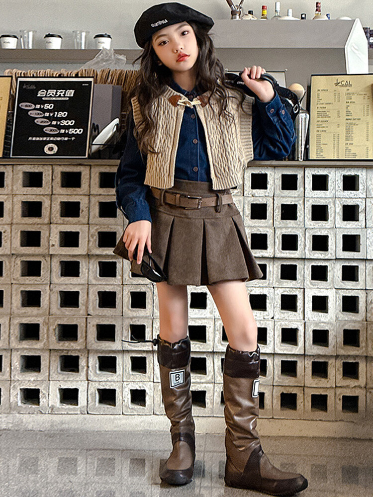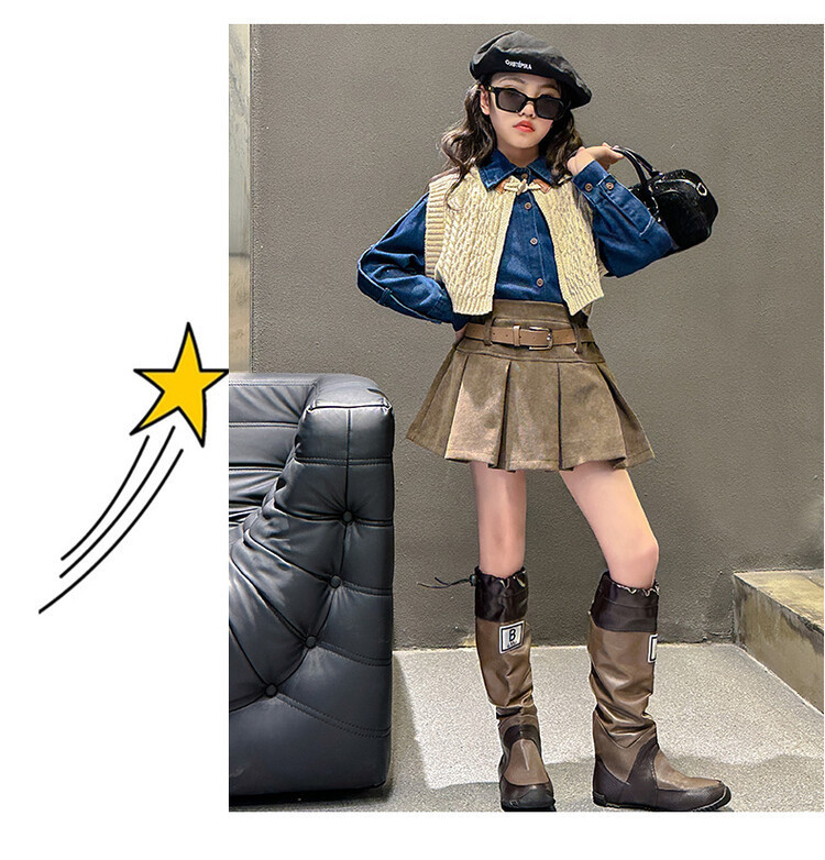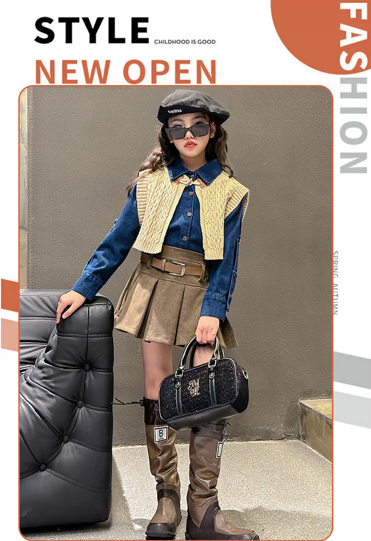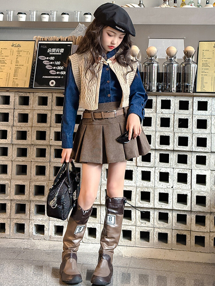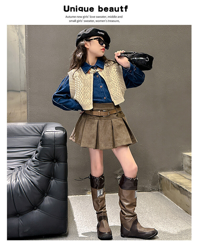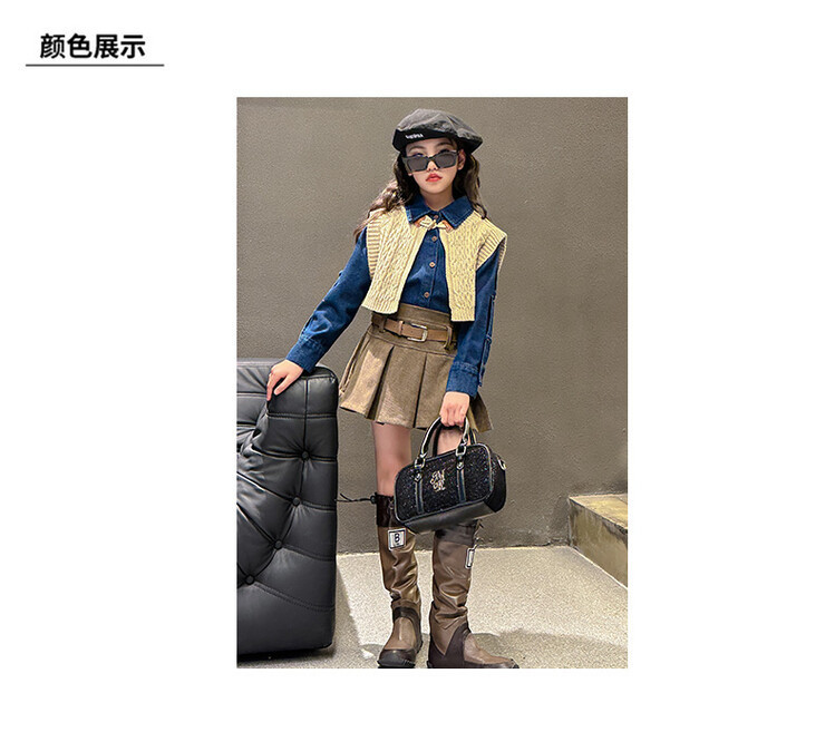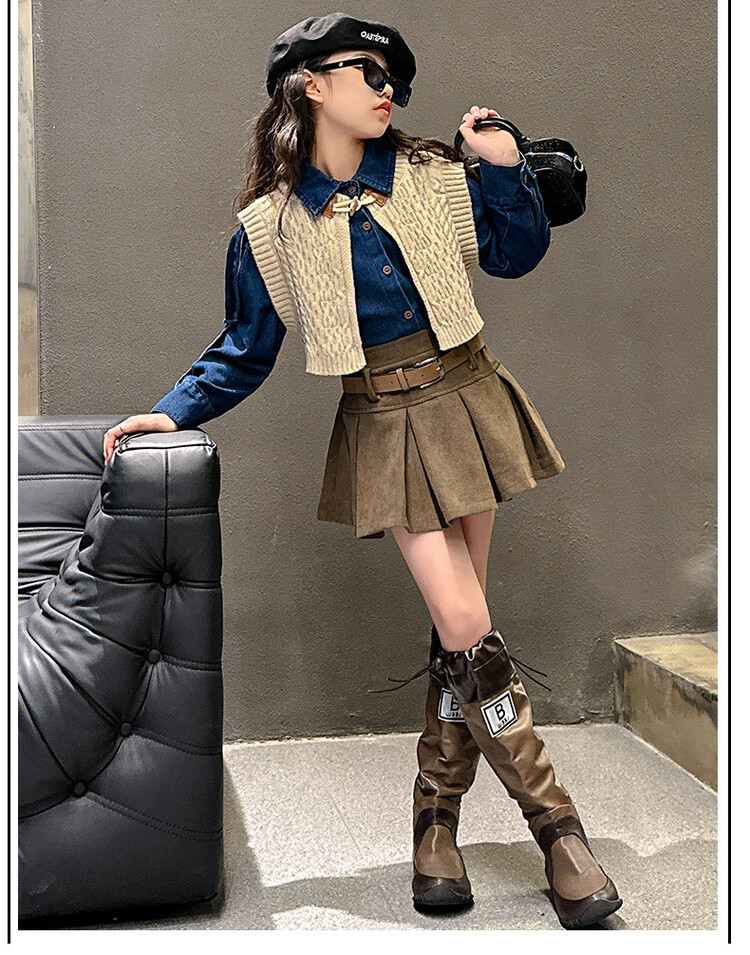 여자 세트 봄 가을 의상 한국 캐주얼 소녀 데님 셔츠 반쪽 치마 달콤한 쿨 스웨터 조끼 3 종 세트