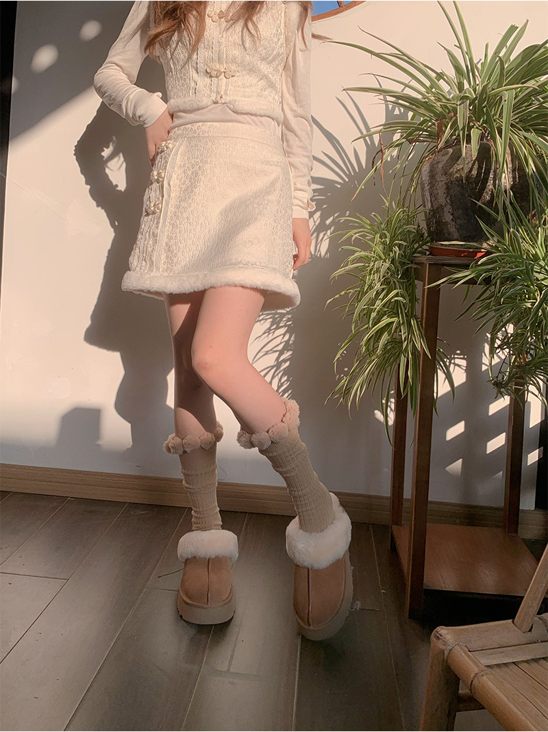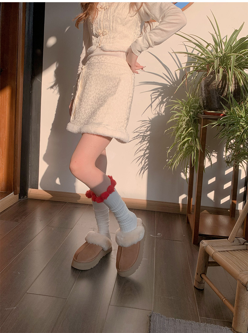 가을과 겨울 넓은 줄무늬 단색 모피 공 송아지면 양말 따뜻한 봉제 중간 길이 양말 귀여운 소녀 부드러운 귀여운 더미 양말스토어 가기