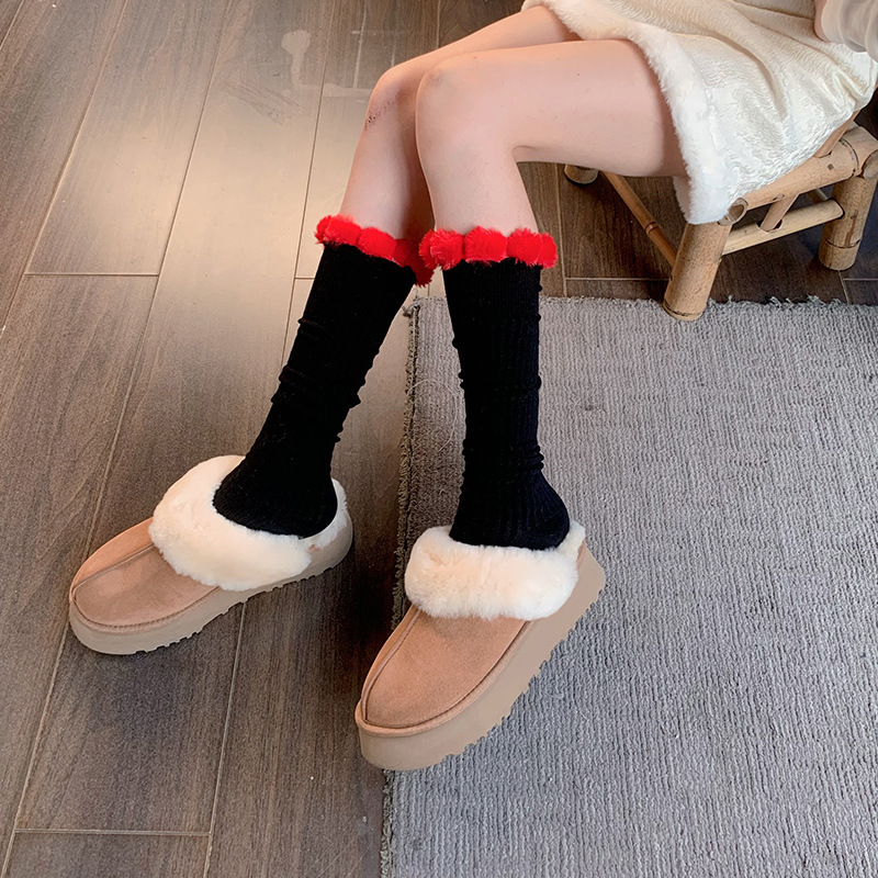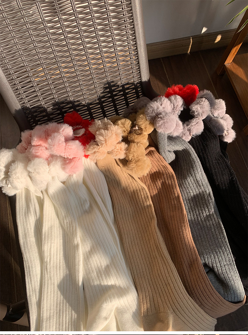 가을과 겨울 넓은 줄무늬 단색 모피 공 송아지면 양말 따뜻한 봉제 중간 길이 양말 귀여운 소녀 부드러운 귀여운 더미 양말