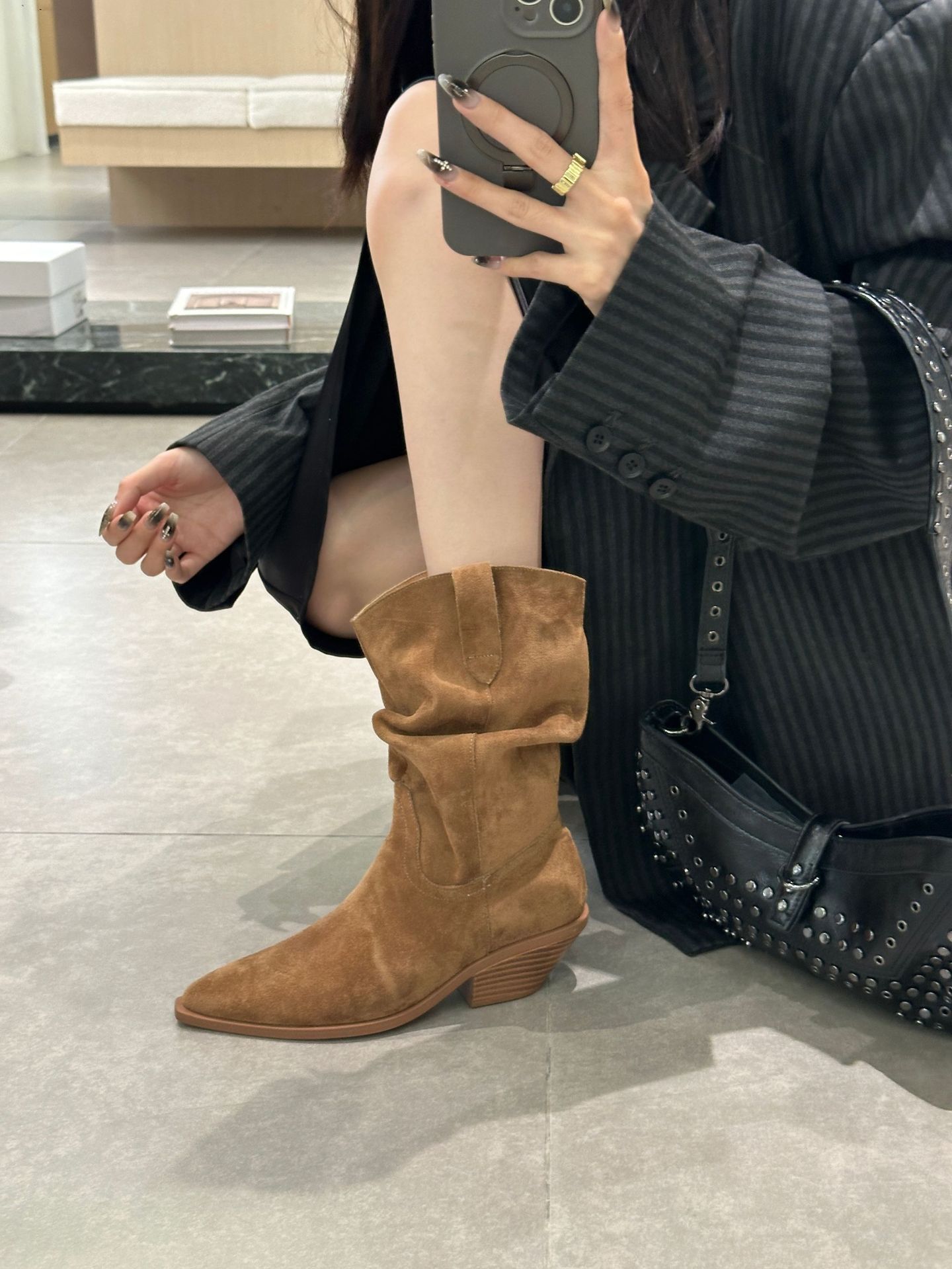 2025 가을, 겨울 새로운 패션 다목적 복고풍 짧은 부츠 한국 스타일 두꺼운 뒤꿈치 소매 짧은 부츠 주름 마틴 부츠스토어 가기