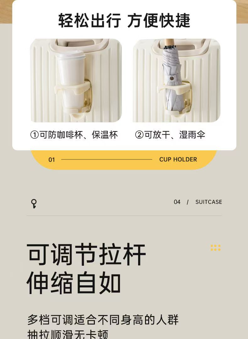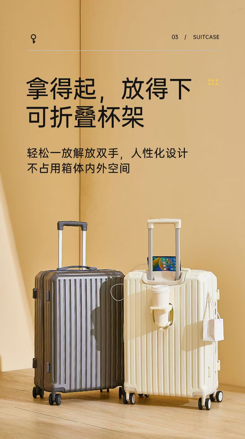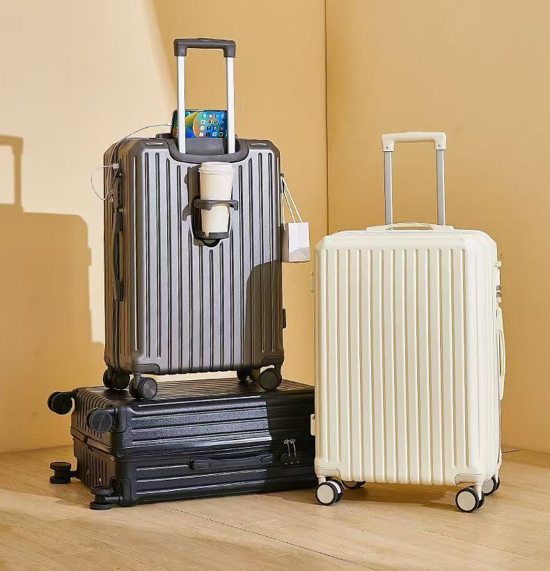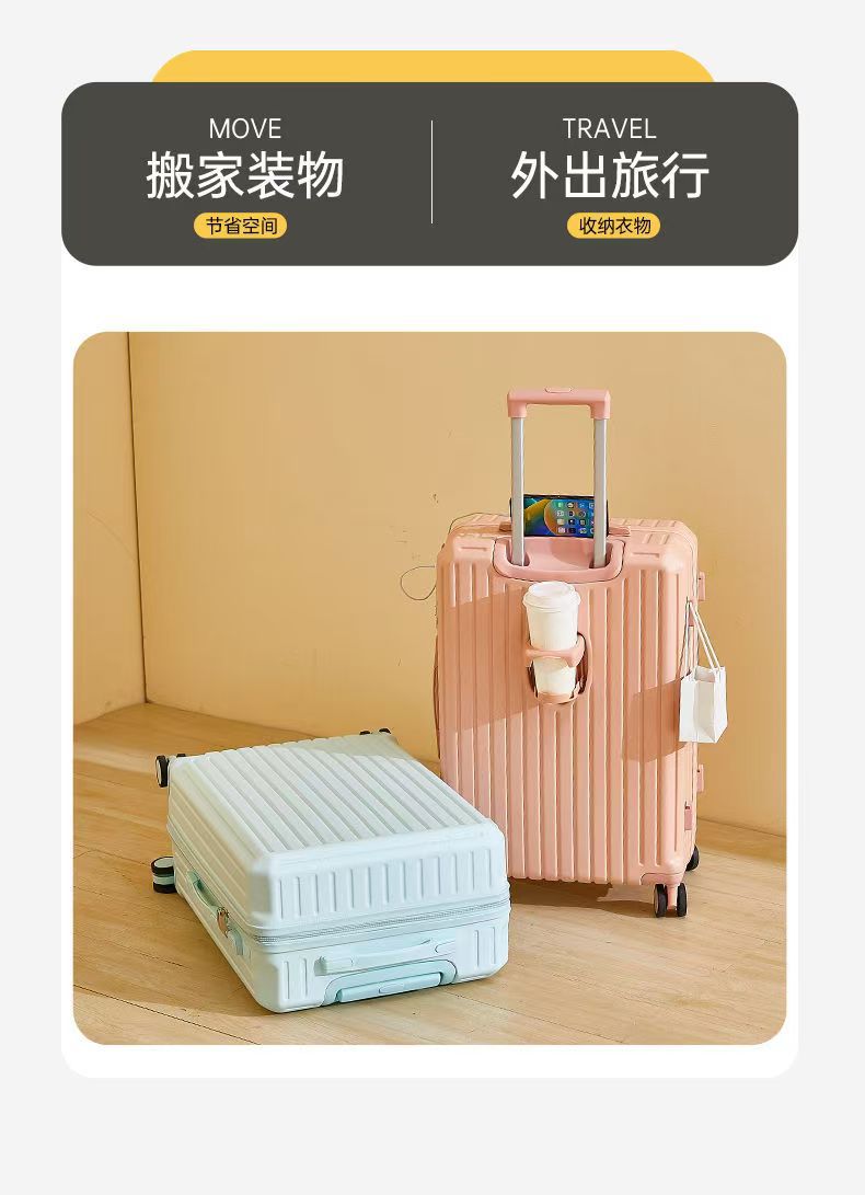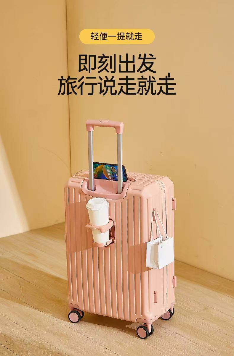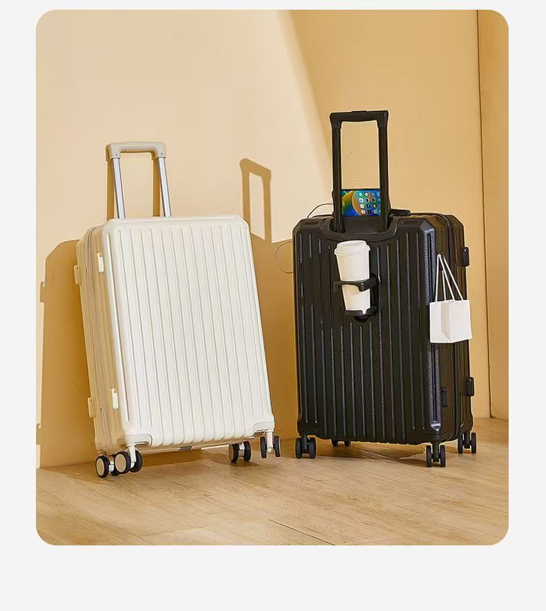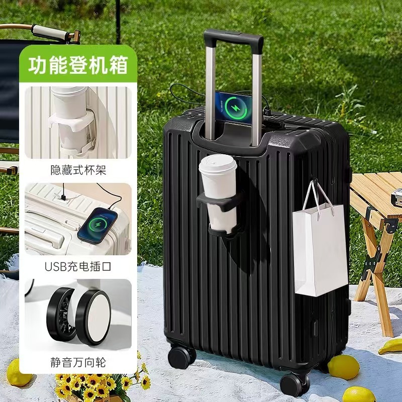 새로운 다기능 수하물 케이스 대용량 무음 범용 휠 트롤리 케이스 충전 인터페이스 워터 컵 홀더 여행 케이스스토어 가기