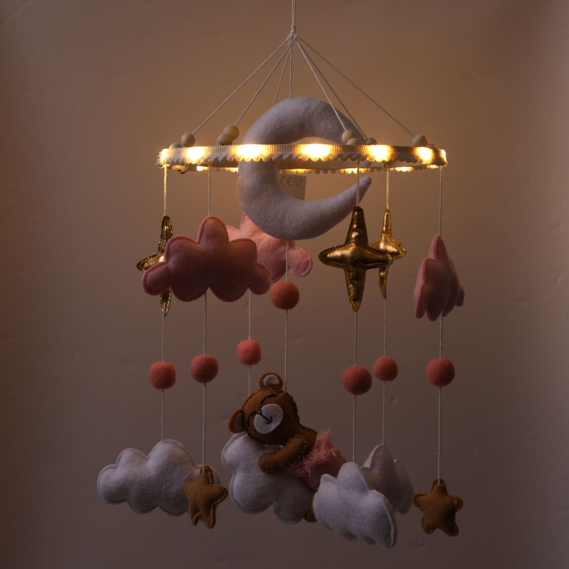• 핑크 골드 별 달 곰돌이 조명 + 플라스틱 받침대 + 오르골