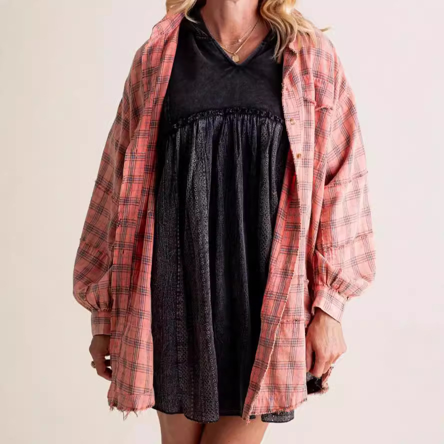 2024 국경을 넘는 유럽과 미국의 대외 무역 여성의 가을과 겨울 새로운 아마존 거친 랜턴 소매 느슨한 버튼 체크 무늬 셔츠
