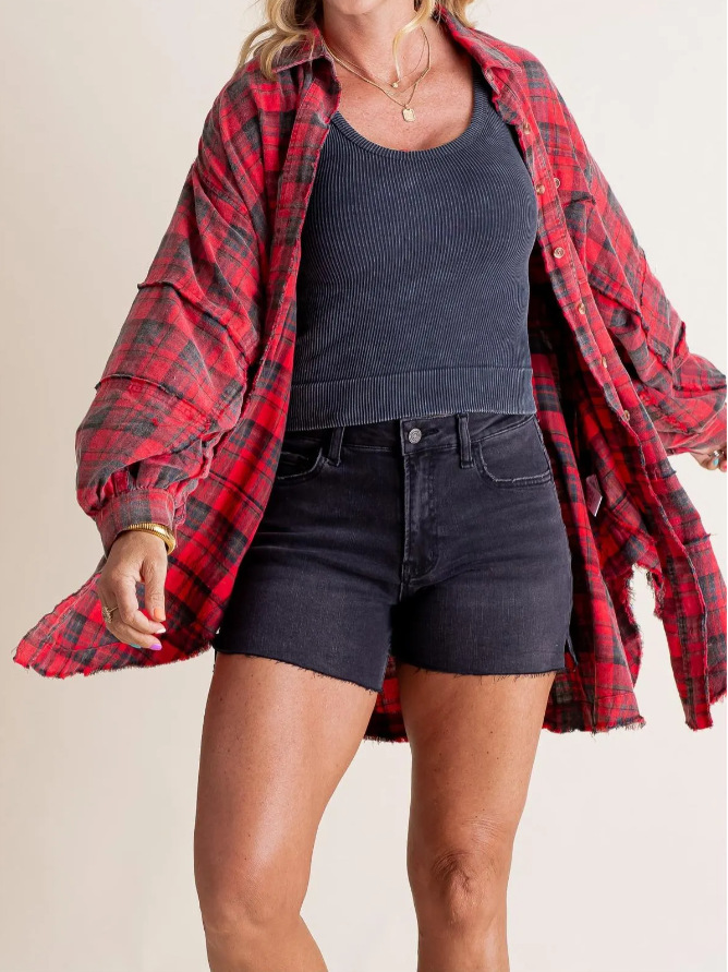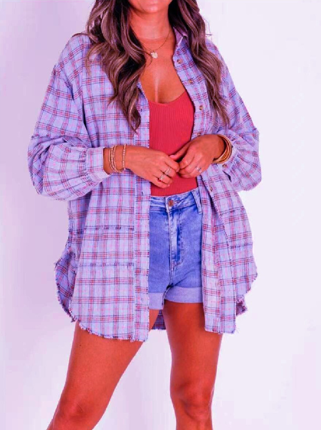 2024 국경을 넘는 유럽과 미국의 대외 무역 여성의 가을과 겨울 새로운 아마존 거친 랜턴 소매 느슨한 버튼 체크 무늬 셔츠스토어 가기