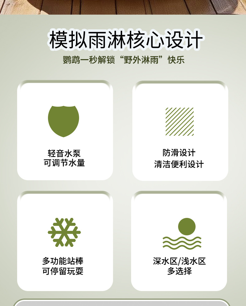 • 앵무새 욕조 + 녹색 레인 샤워기 + 투명 튜브 + 워터 펌프 + 나무 막대