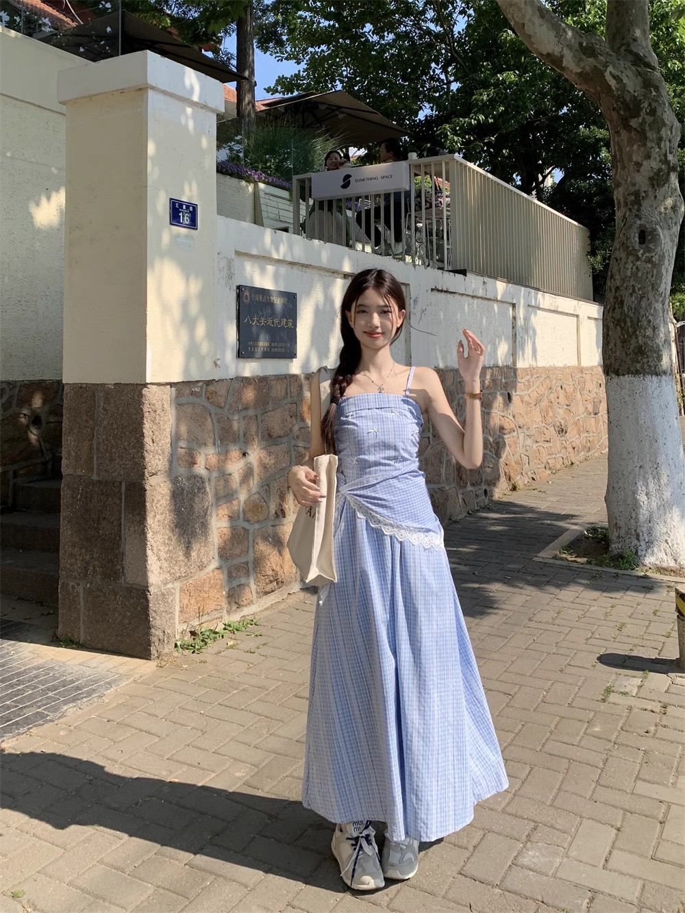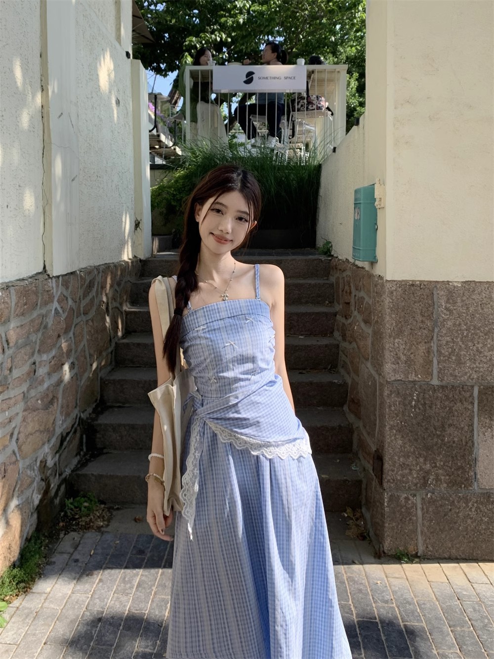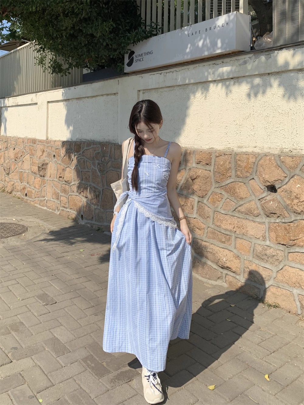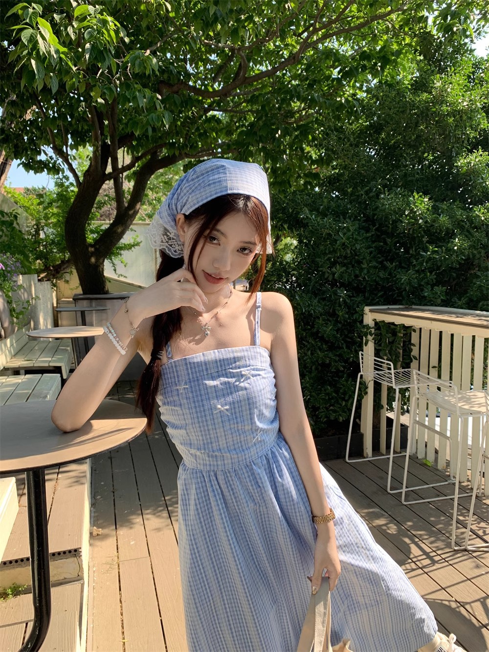여성을위한 프렌치 블루 체크 무늬 서스펜더 드레스 여름 2025 새로운 해변 휴가 민소매 조끼 롱 드레스