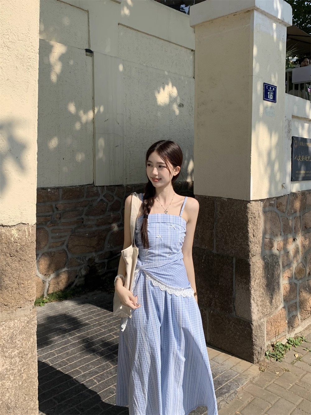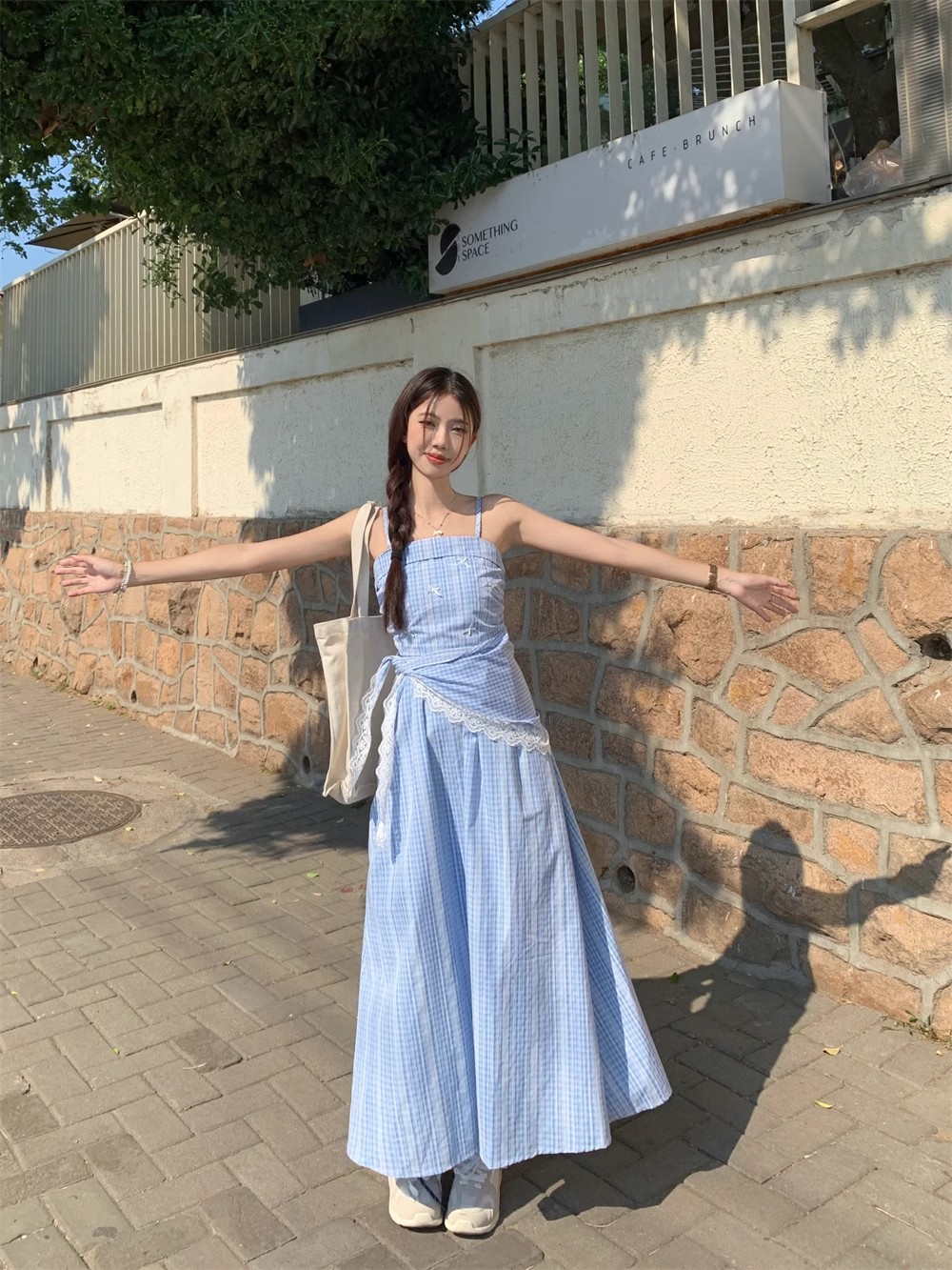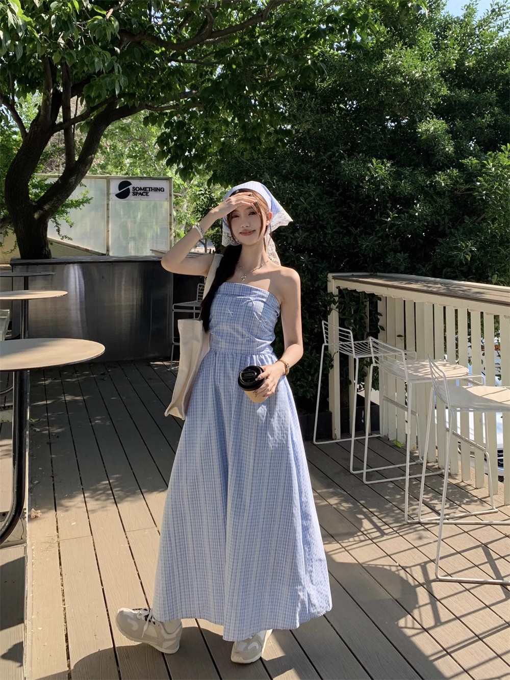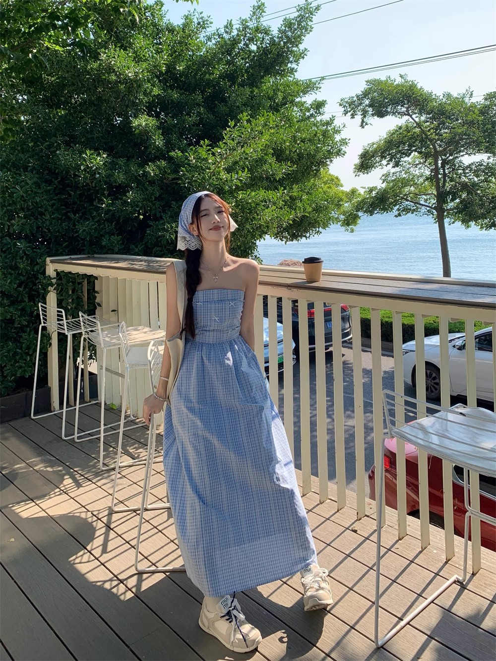 여성을위한 프렌치 블루 체크 무늬 서스펜더 드레스 여름 2025 새로운 해변 휴가 민소매 조끼 롱 드레스