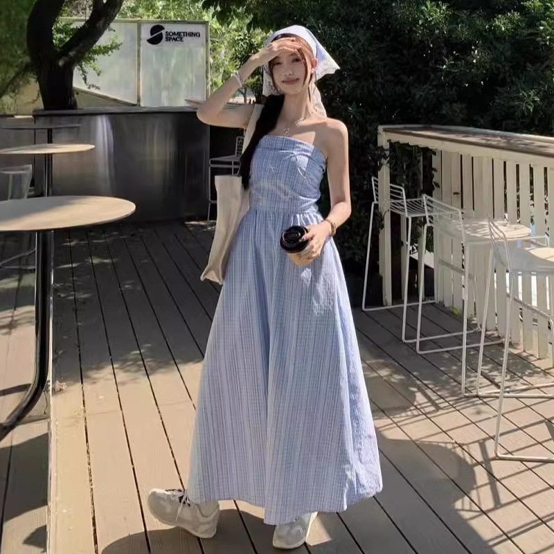 여성을위한 프렌치 블루 체크 무늬 서스펜더 드레스 여름 2025 새로운 해변 휴가 민소매 조끼 롱 드레스스토어 가기