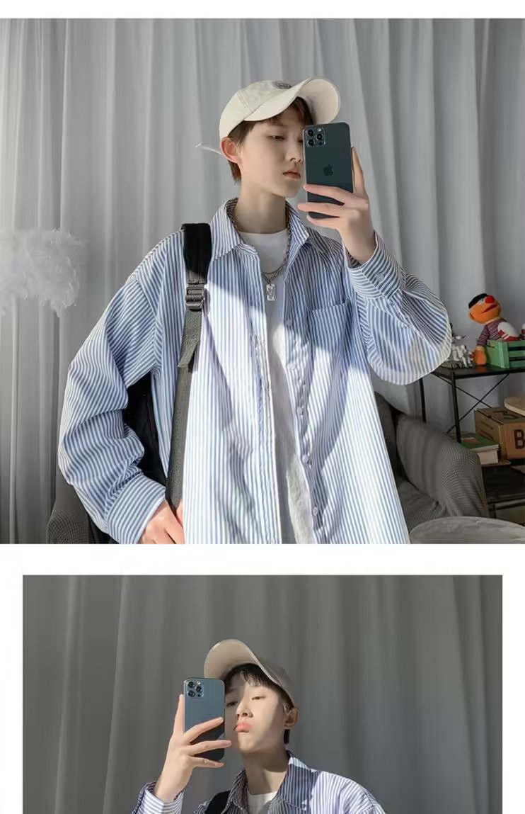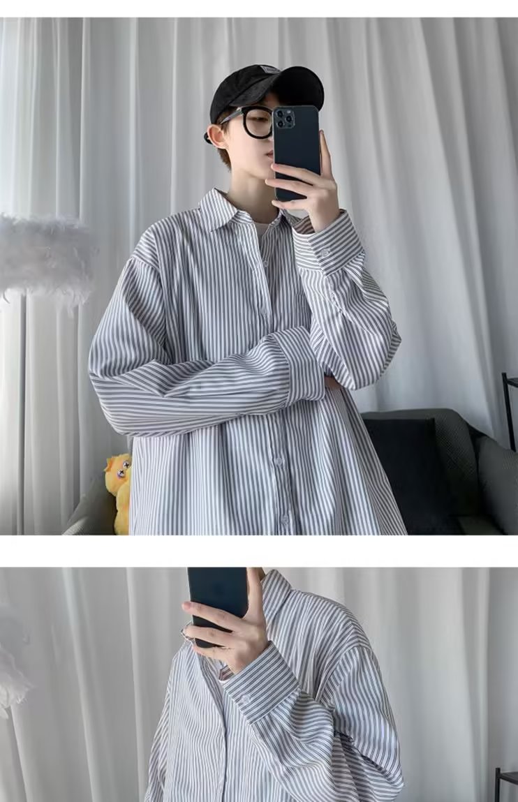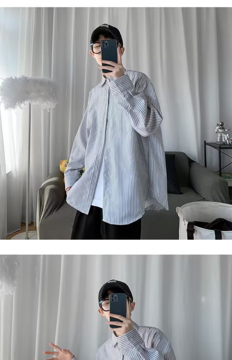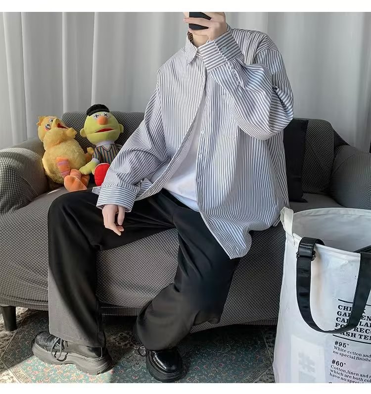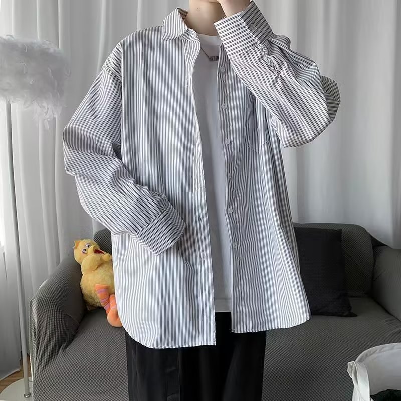 새로운 도착 올매치 긴 소매 셔츠 봄과 여름 잘 생긴 남자 재킷 홍콩 스타일 Ins 남성용 유행 루즈 스트라이프 셔츠