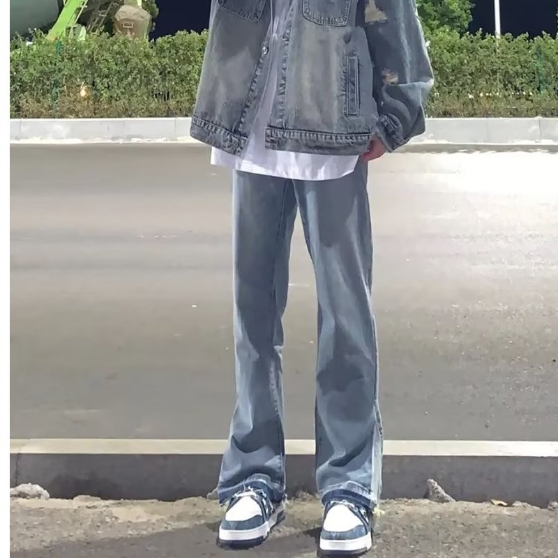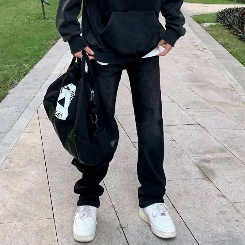 하이 스트리트 빈티지 옐로우 머드 염색 루즈 스트레이트 청바지 남성 Ins 패셔너블 올 매치 캐주얼 와이드 레그 팬츠